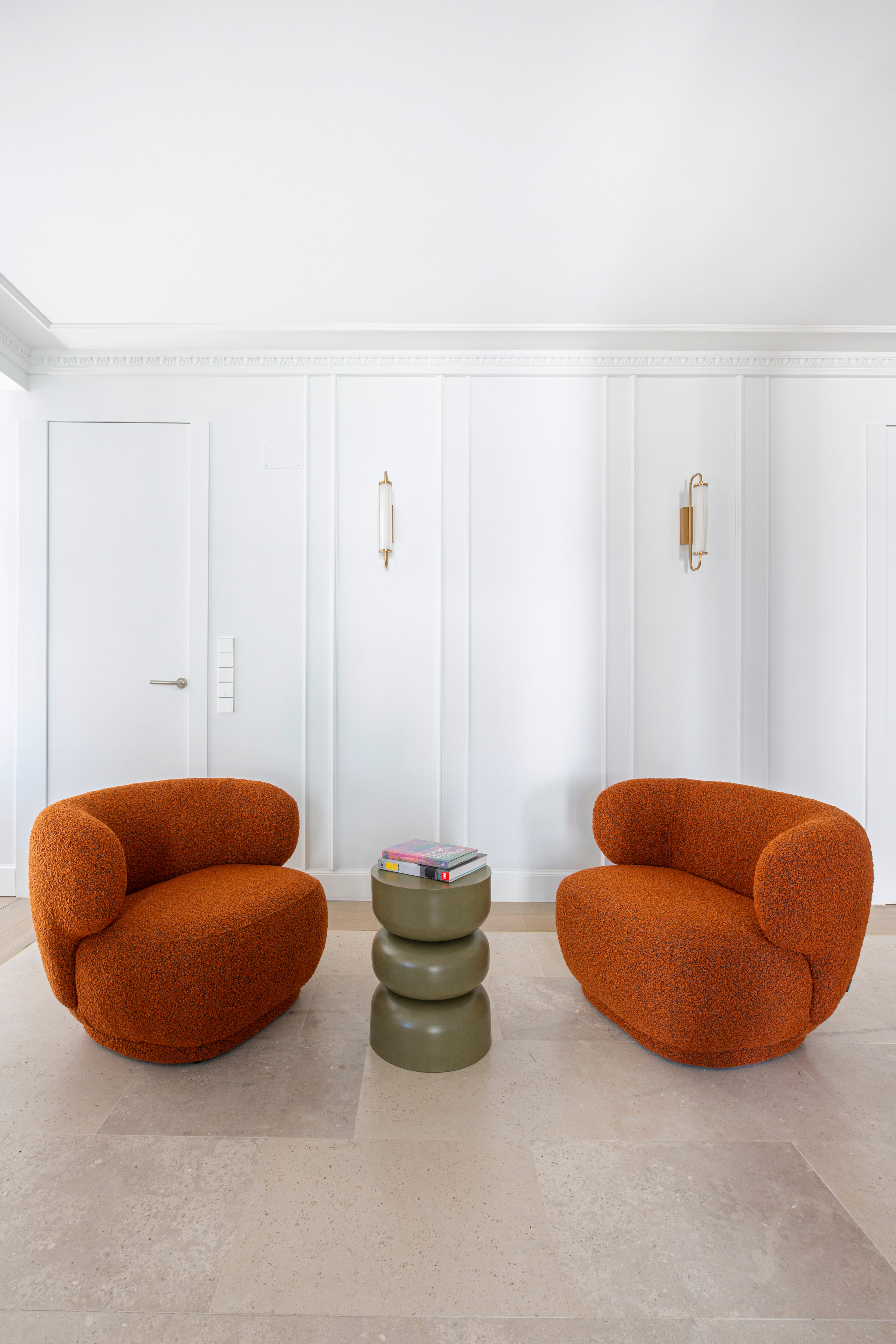The apartment’s décor reflects a meticulous curation of materials and forms. In the sitting area, sculptural orange armchairs contrast beautifully against the neutral palette of the walls and floors. A sculptural piece by Anton Aiguabella graces one corner, while sofas from SofActual, adorned with fabric by Pepe Peñalver, echo the design studio’s commitment to craftsmanship.