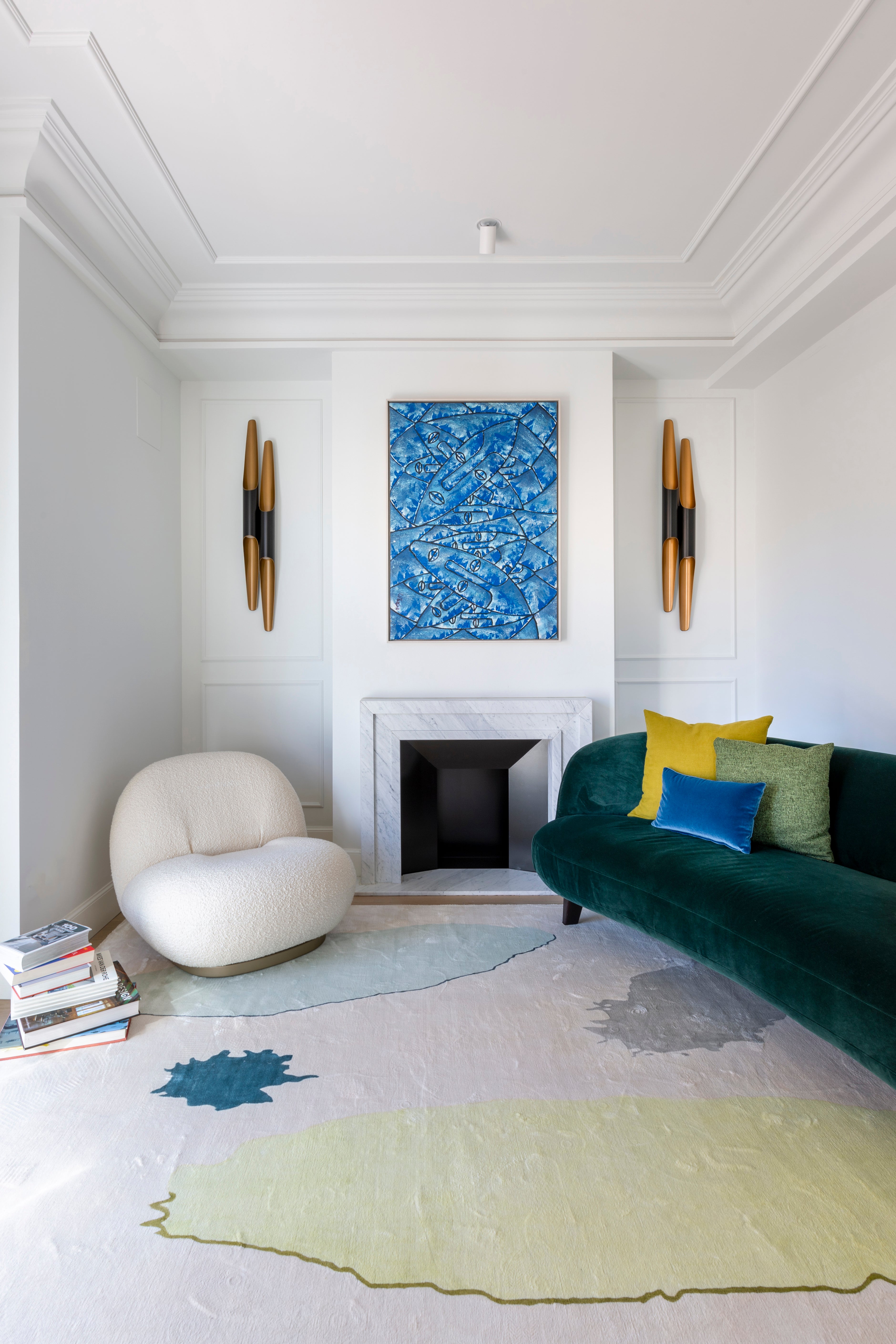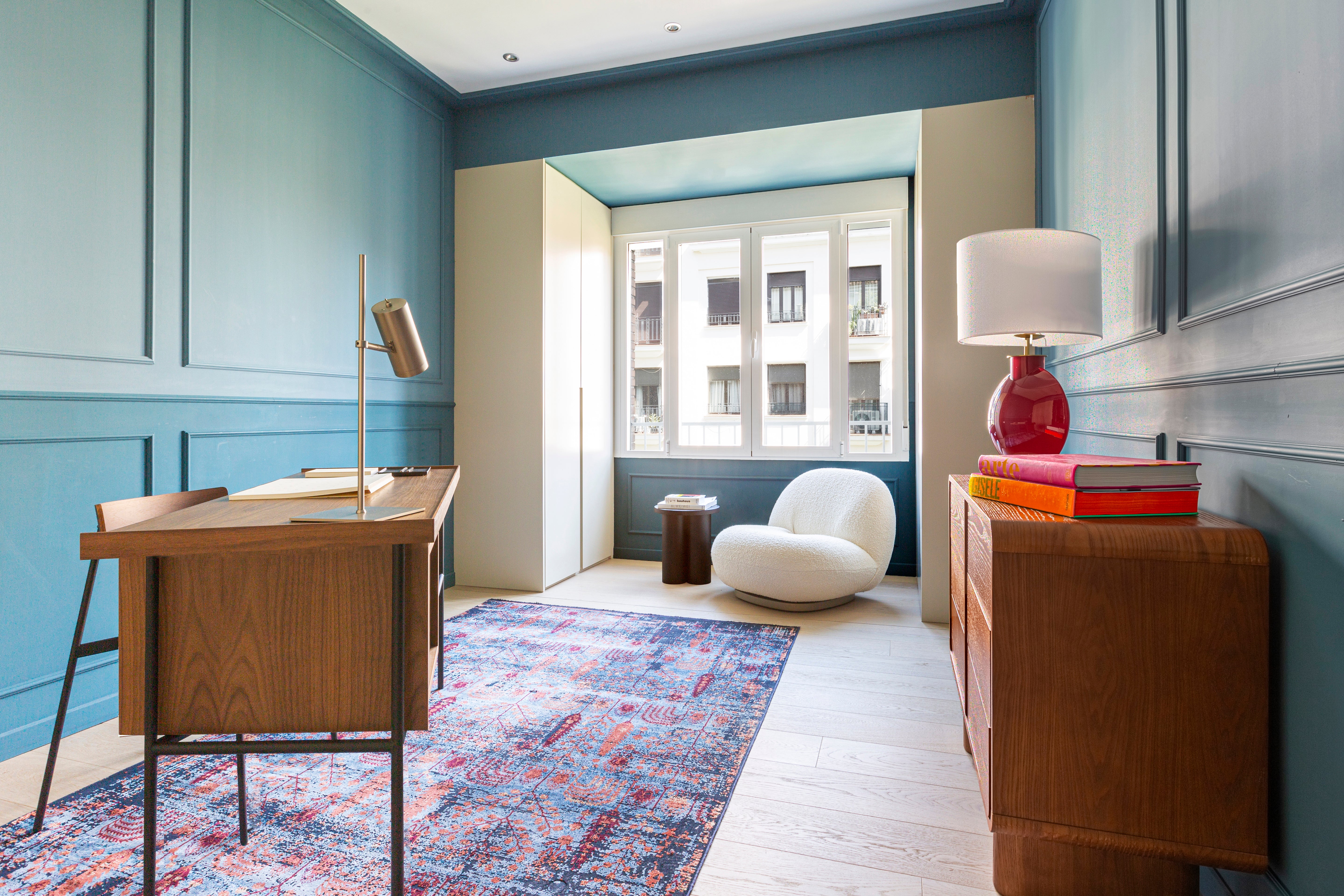 The study is stunning, enveloped in calming shades of blue. Here, paneling adds depth and texture, while a white Pacha chair from Gubi provides an inviting spot for reflection. A mid-century wooden desk anchors the room, paired with a striking red lamp that adds a bold pop of color. The vibrant Kilombo Rug beneath ties the elements together, balancing tradition and modernity.