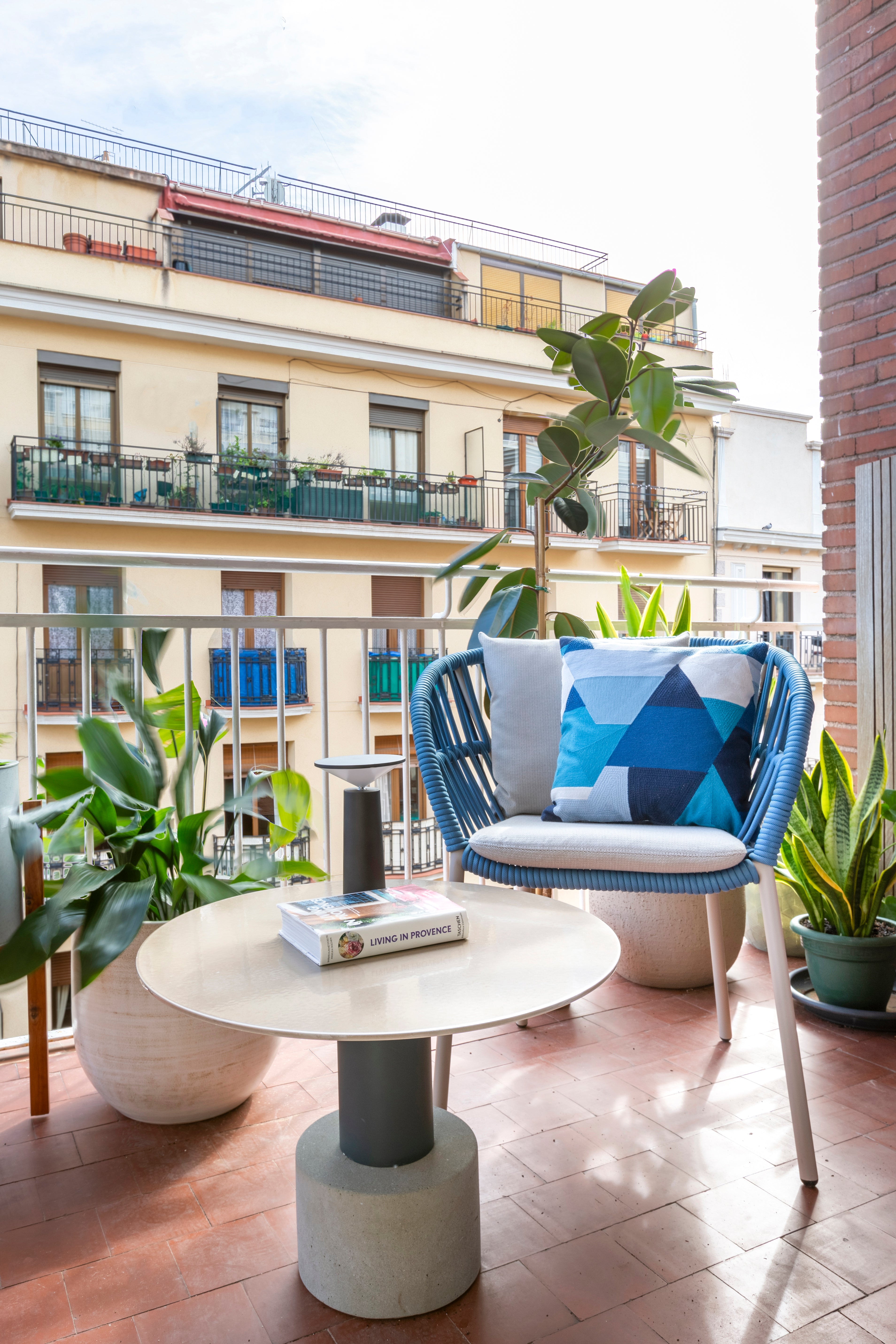 A small terrace extends the apartment’s living space, offering a tranquil escape amidst the bustling city. Comfortable outdoor seating surrounded by an array of potted plants, creates a lush and inviting atmosphere. It's the perfect spot for a morning coffee or evening aperitivo.