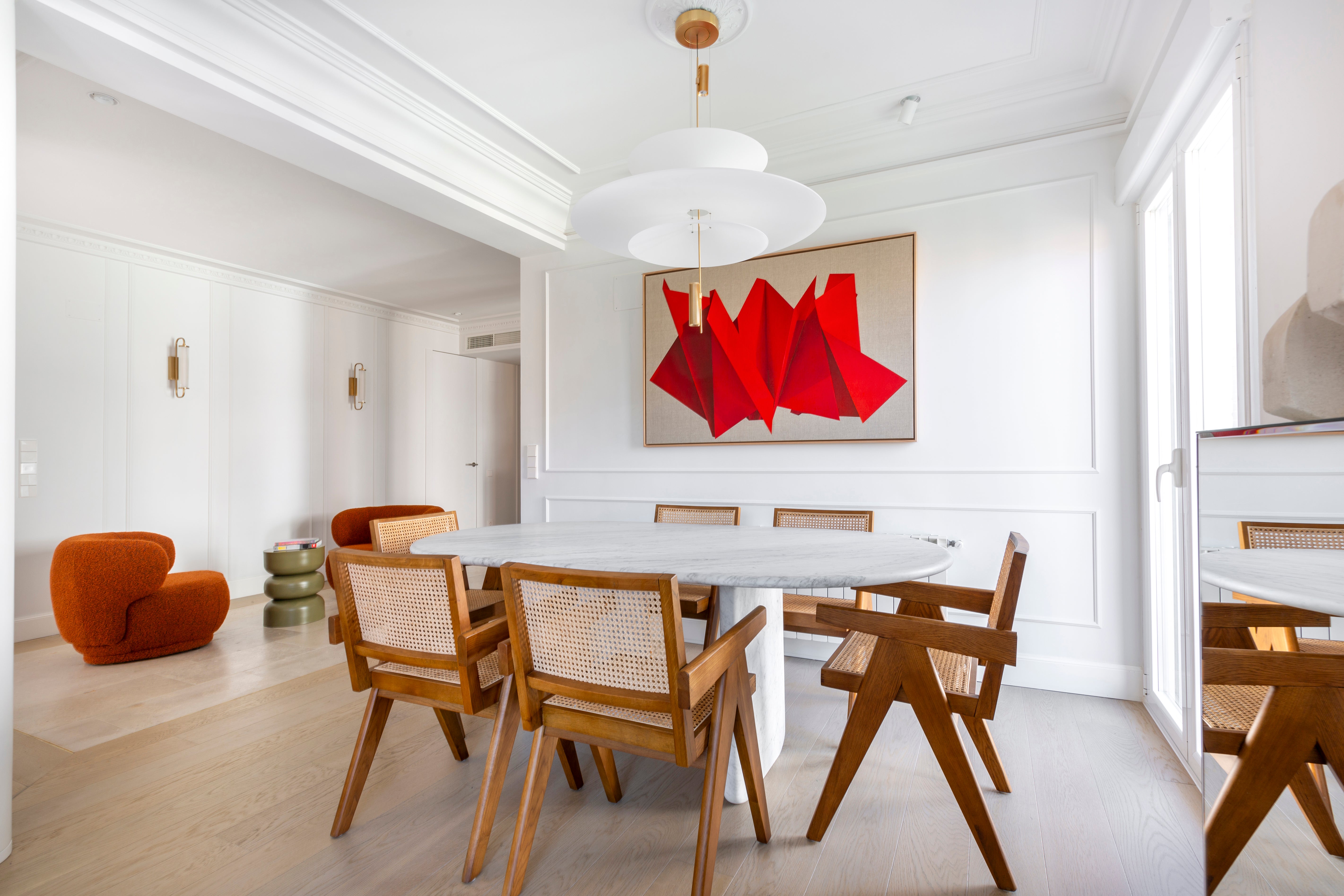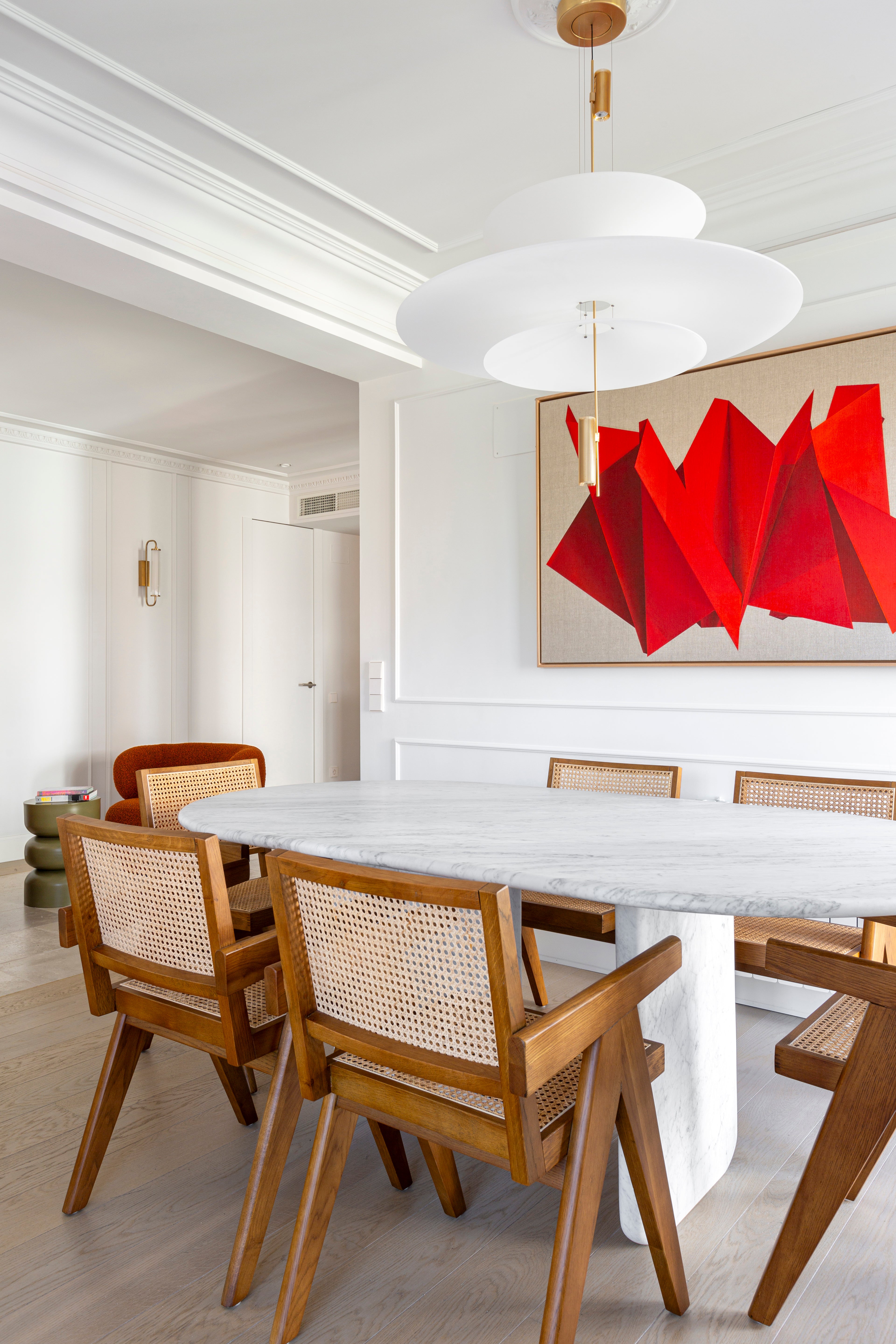 The dining area is a celebration of clean lines and natural materials. A marble-topped dining table takes center stage, surrounded by cane-backed wooden chairs. Overhead, a sculptural pendant light adds a modern flourish, while a bold red artwork injects a dramatic focal point. Adjacent to this space, the continuity of the orange armchairs ties the design language across rooms.