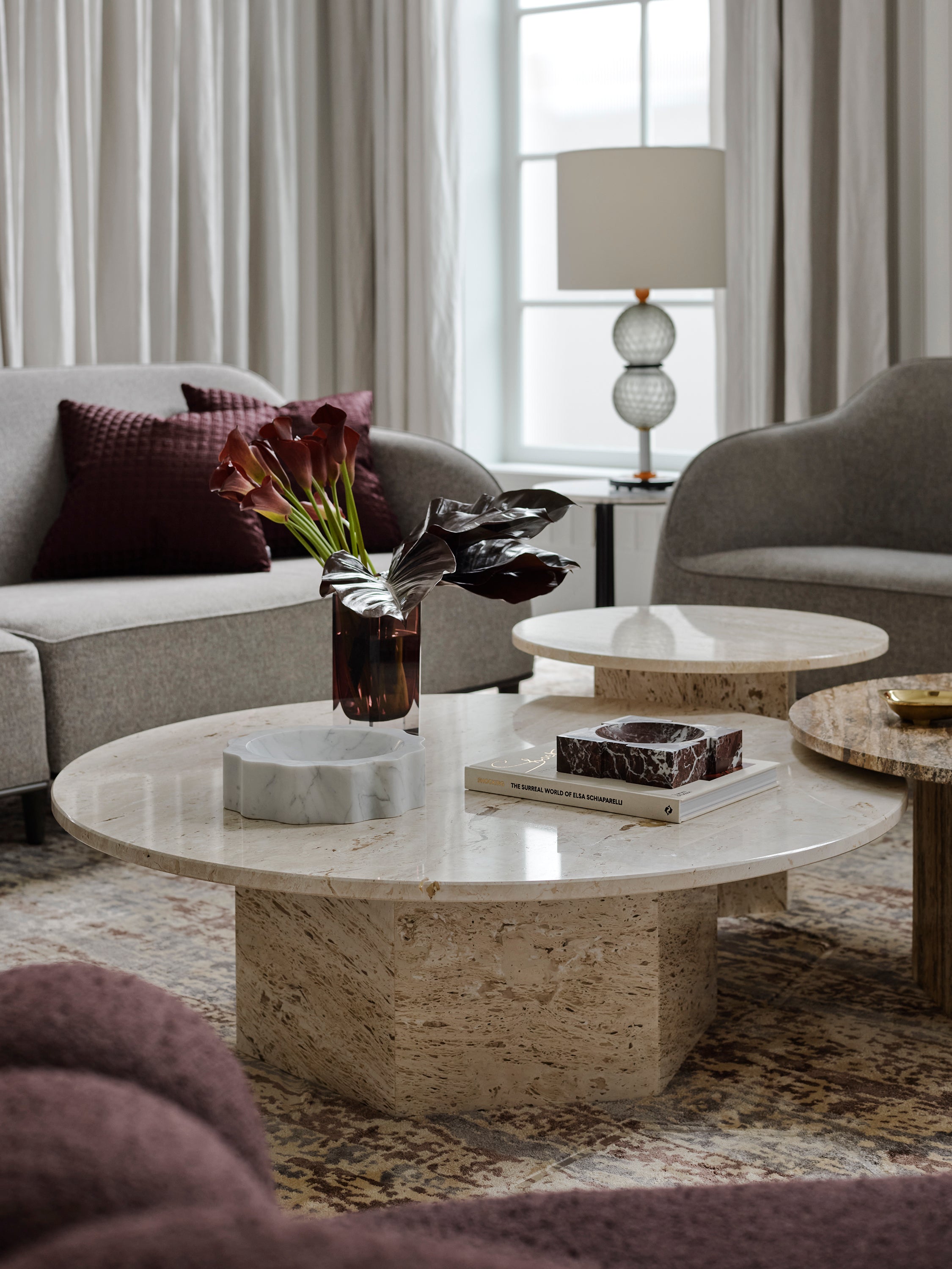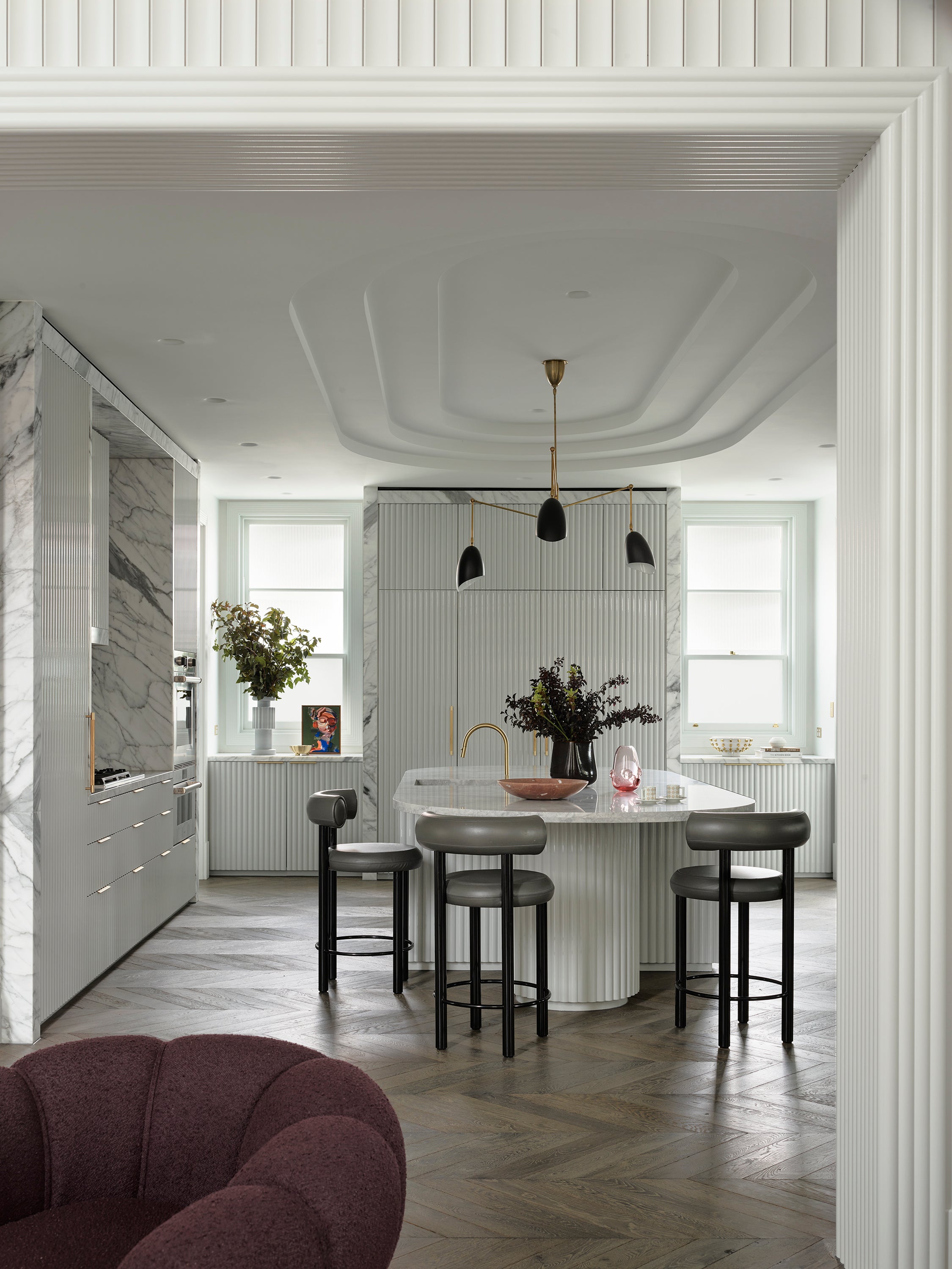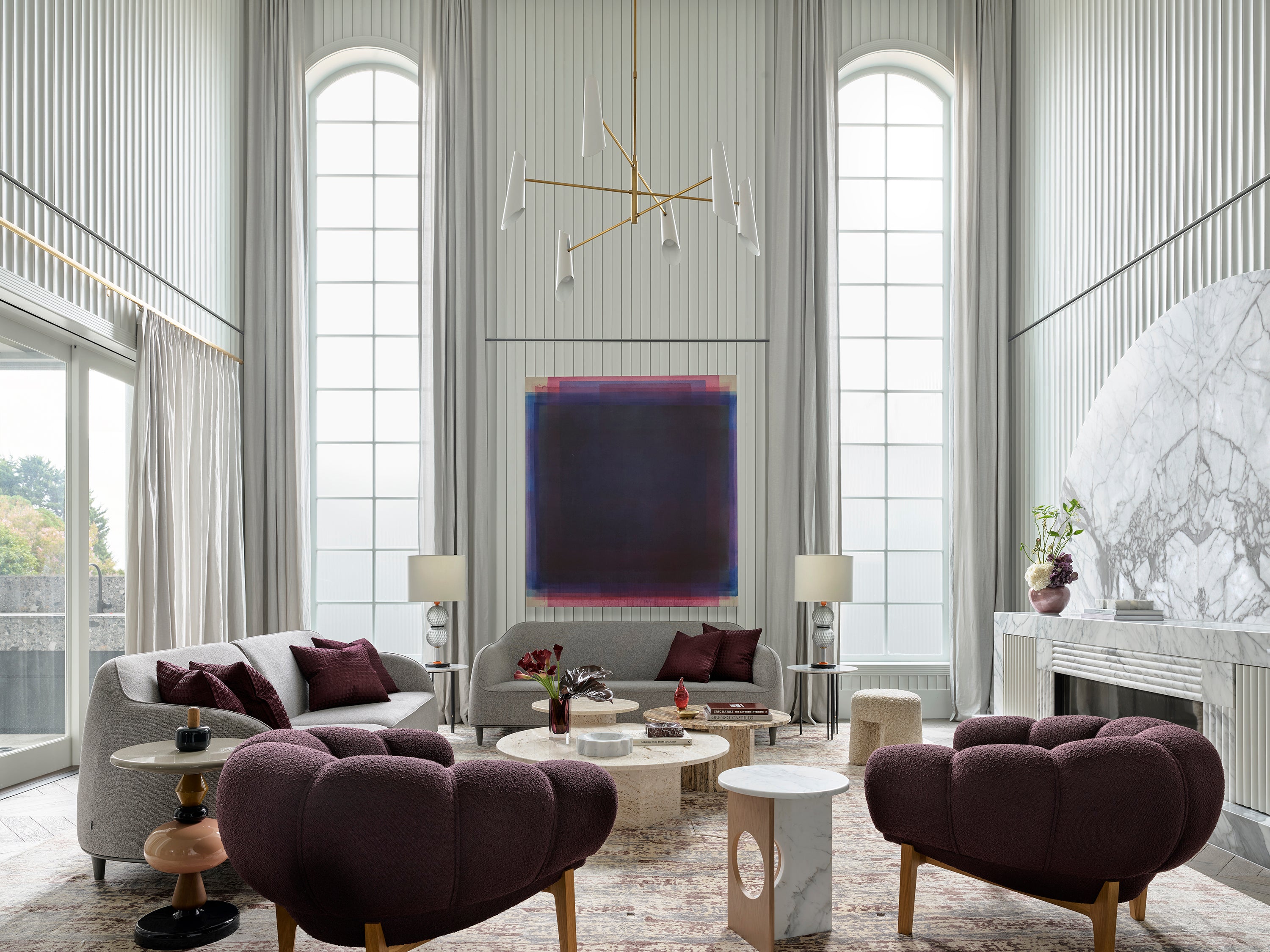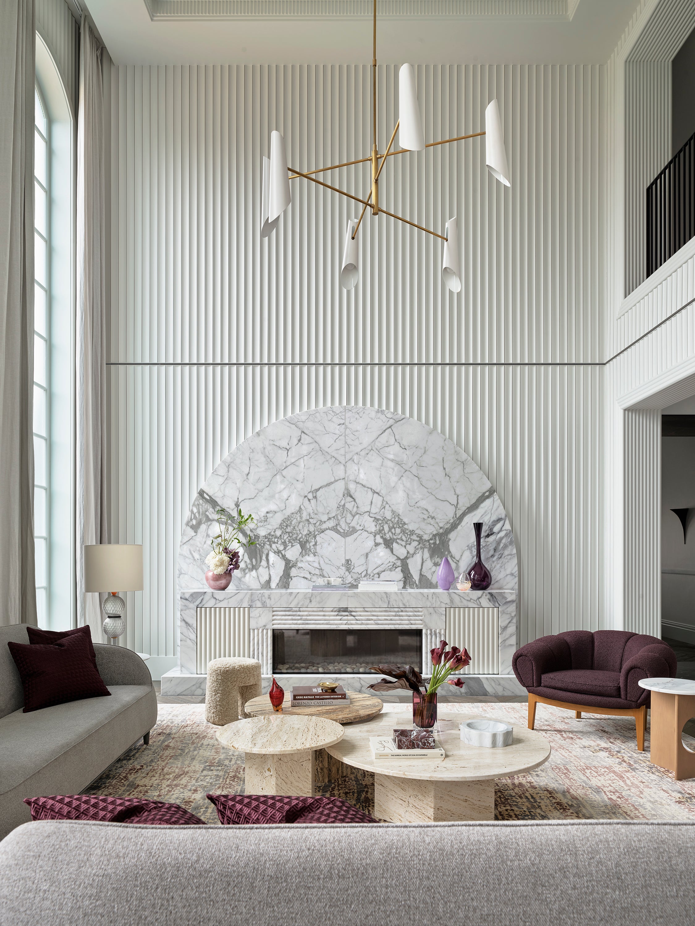 The main living area is more subtle in its palette with a mix of neutrals building depth to the interior. The clever use of different materials creates a vibrant modern décor with walls complete with white lacquered fluting and deep plum upholstery adding elegance and flair.