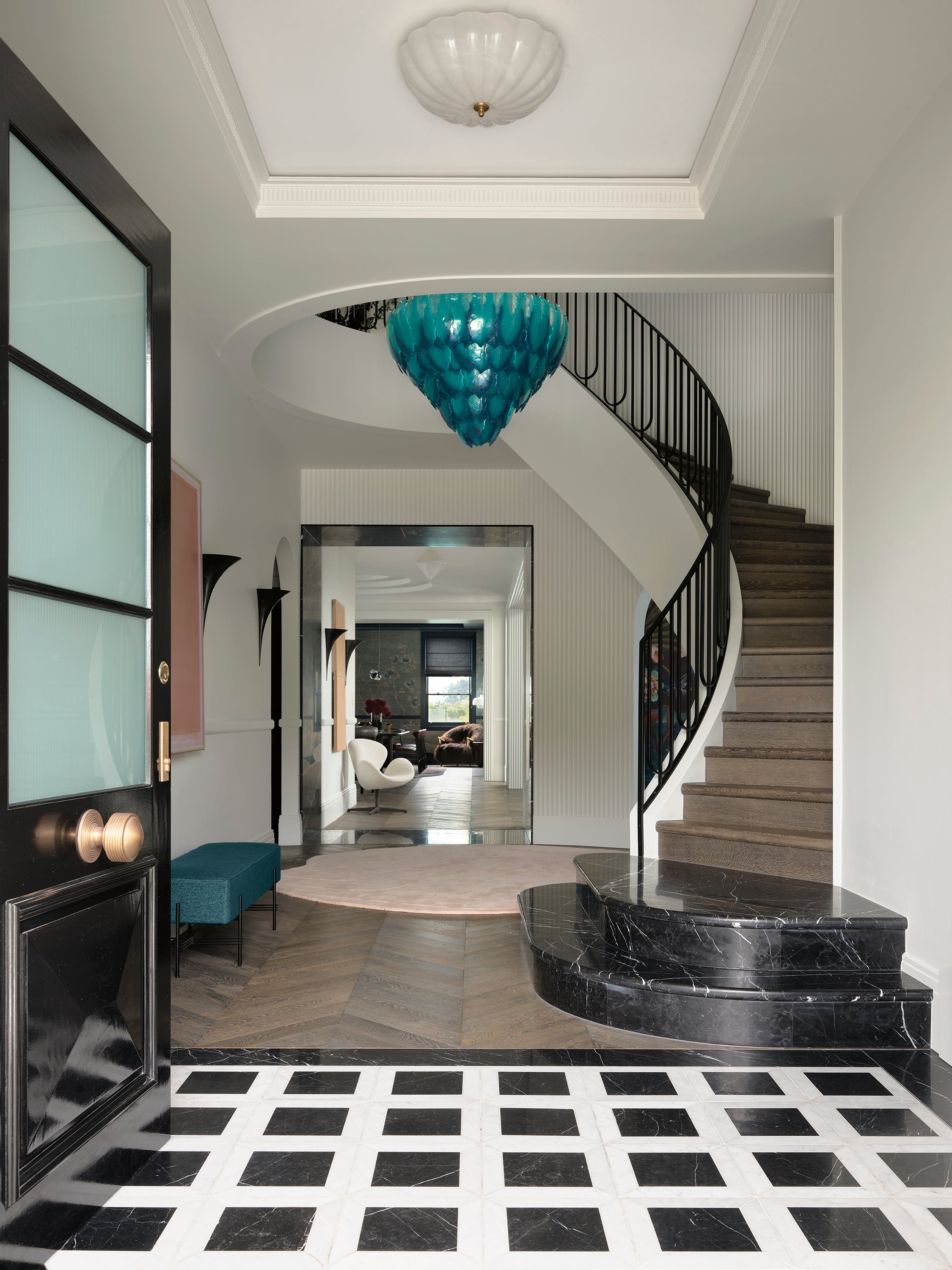 From the moment we walked inside, we were overwhelmed by the stunning entrance with its striking black and white floor and bespoke curved staircase. The deep turquoise glass chandelier sets the scene and marries perfectly with the soft blush circular rug.