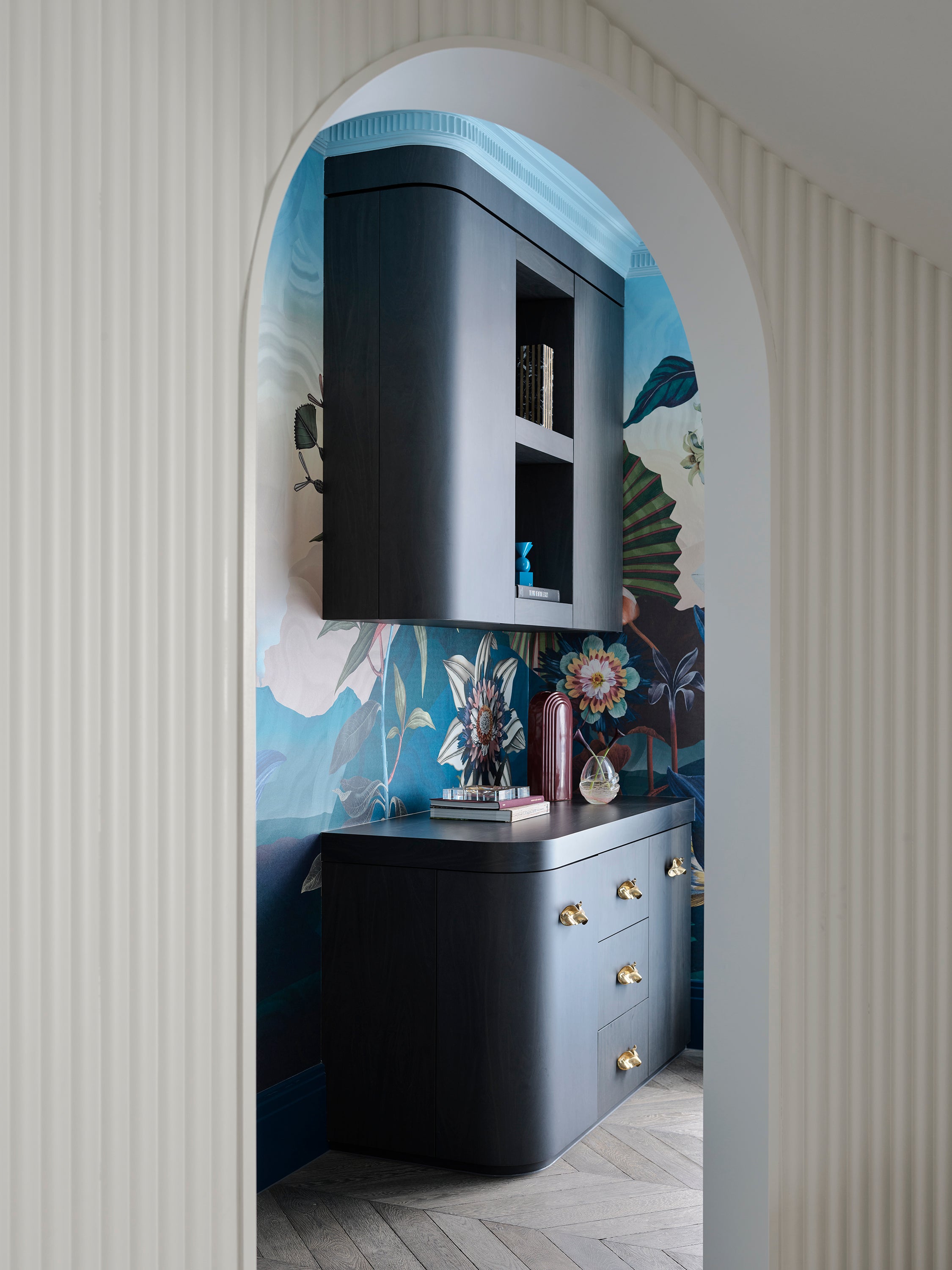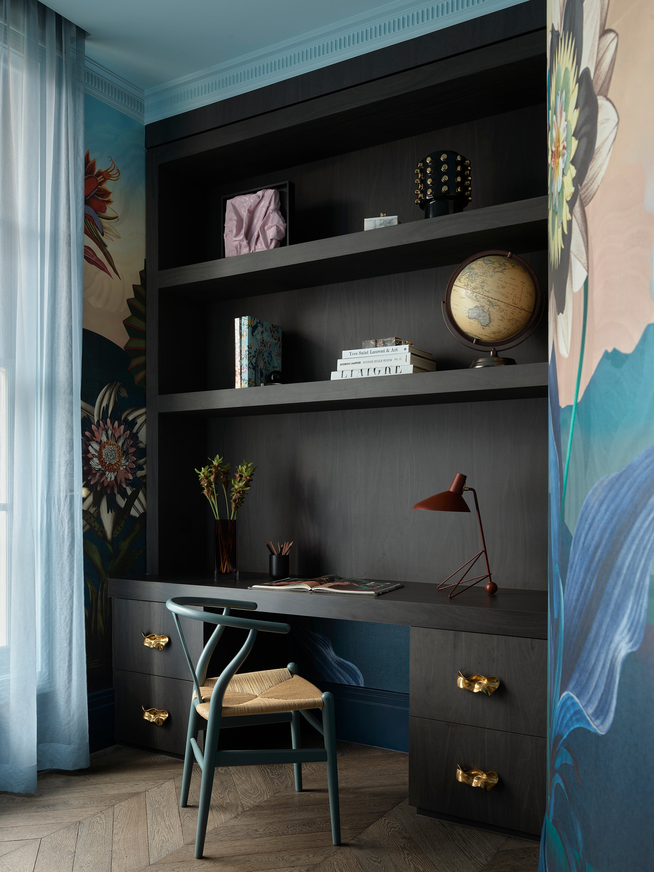 One of our favourite rooms is the study, with bespoke joinery in a black finish with gold pull handles; it sits between a colourful floral wall covering that makes the black pop even more giving a striking effect.