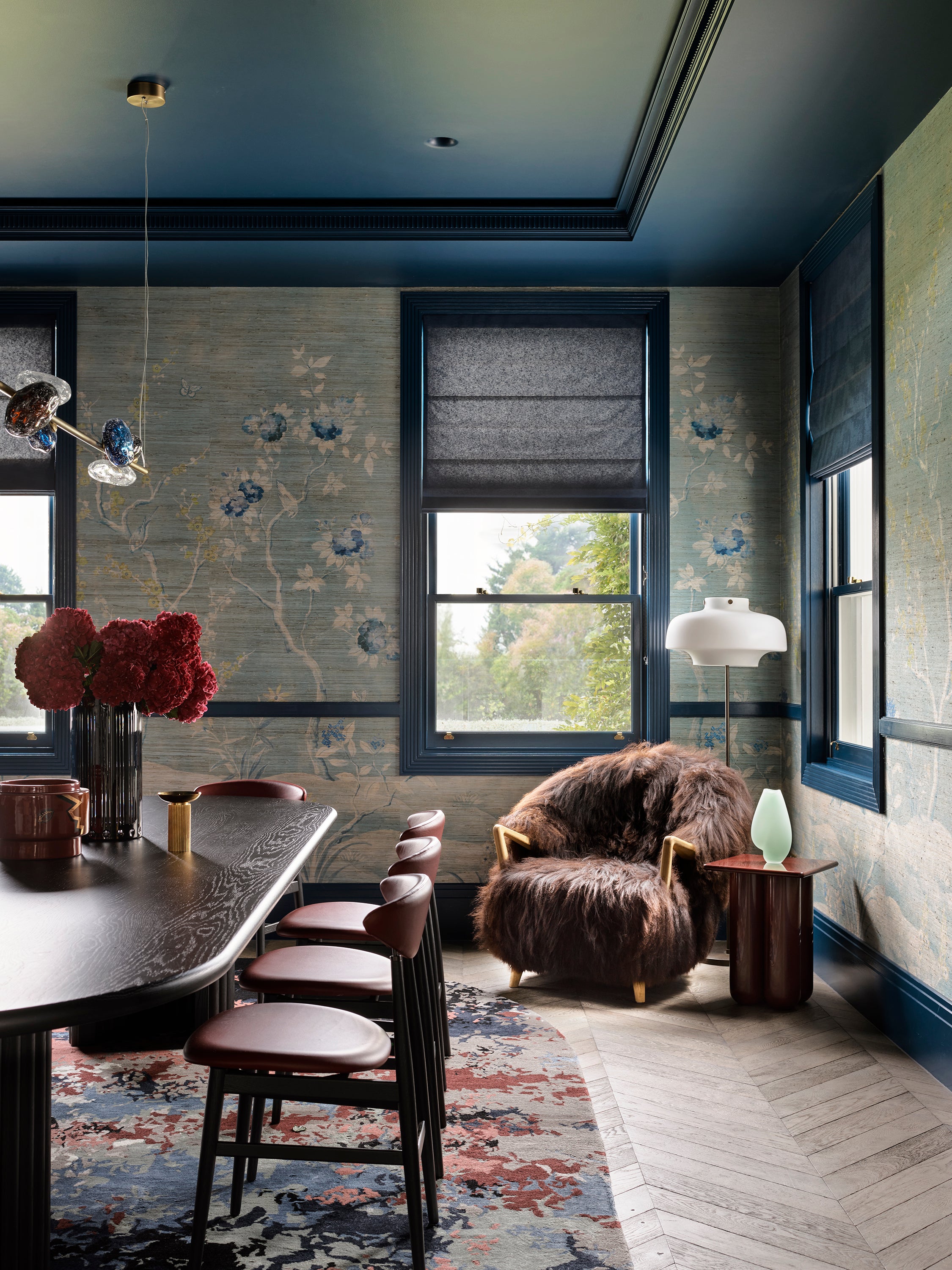 The dining room, with its lacquered cobalt blue cabinetry, seamlessly blends into the blue ceiling creating a true wow factor as soon as we enter the room. Balanced with the statement black wooden table with leg fluting continues the theme and pops of red leather on the chairs is simply stunning.