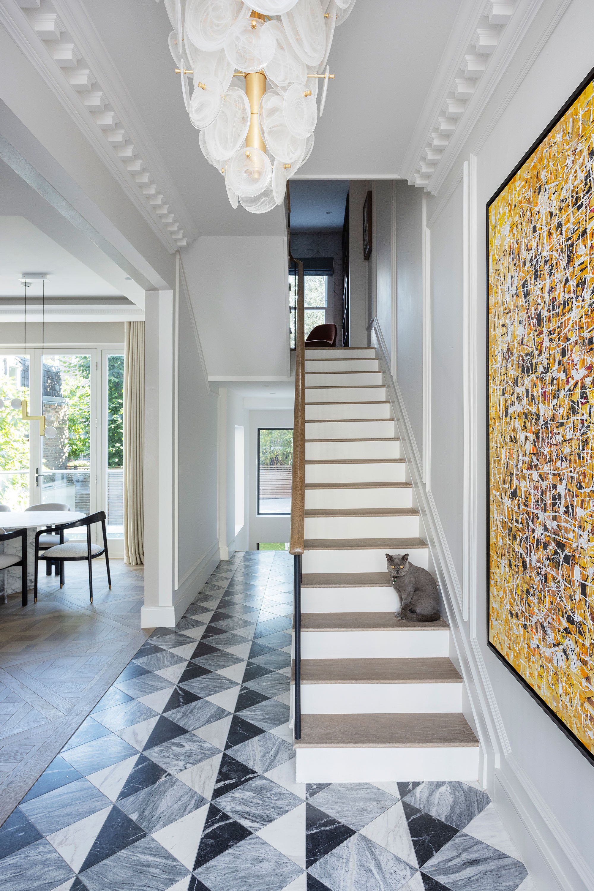 The stunning entrance welcomes you with a beautiful tile floor in different tones of grey. The floor palette balances with the bright white walls and ceiling, creating the perfect backdrop to showcase the bold abstract art. To maintain the original architectural detail, cornicing by Stevensons of Norwich added embellishment and further detail to the coffered ceiling. A statement chandelier by Circa Lighting completes the dramatic entrance.