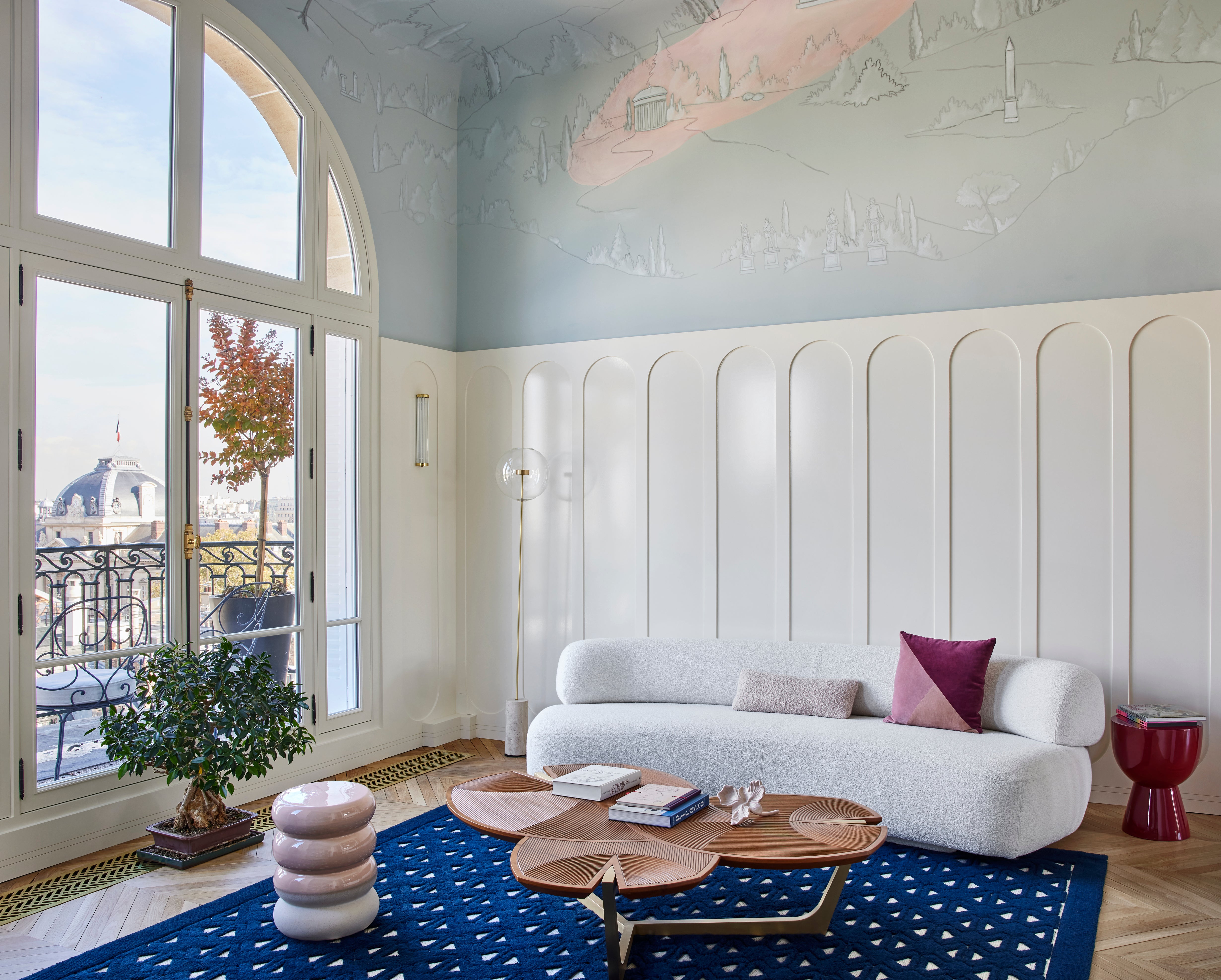 Artist Sacha Floch Poliakoff created a mural on the ceiling of the living room to depict ancient Greek landscapes, adding dreamy clouds of colour. The teak wood Saroja coffee table is designed by GCG Architects.