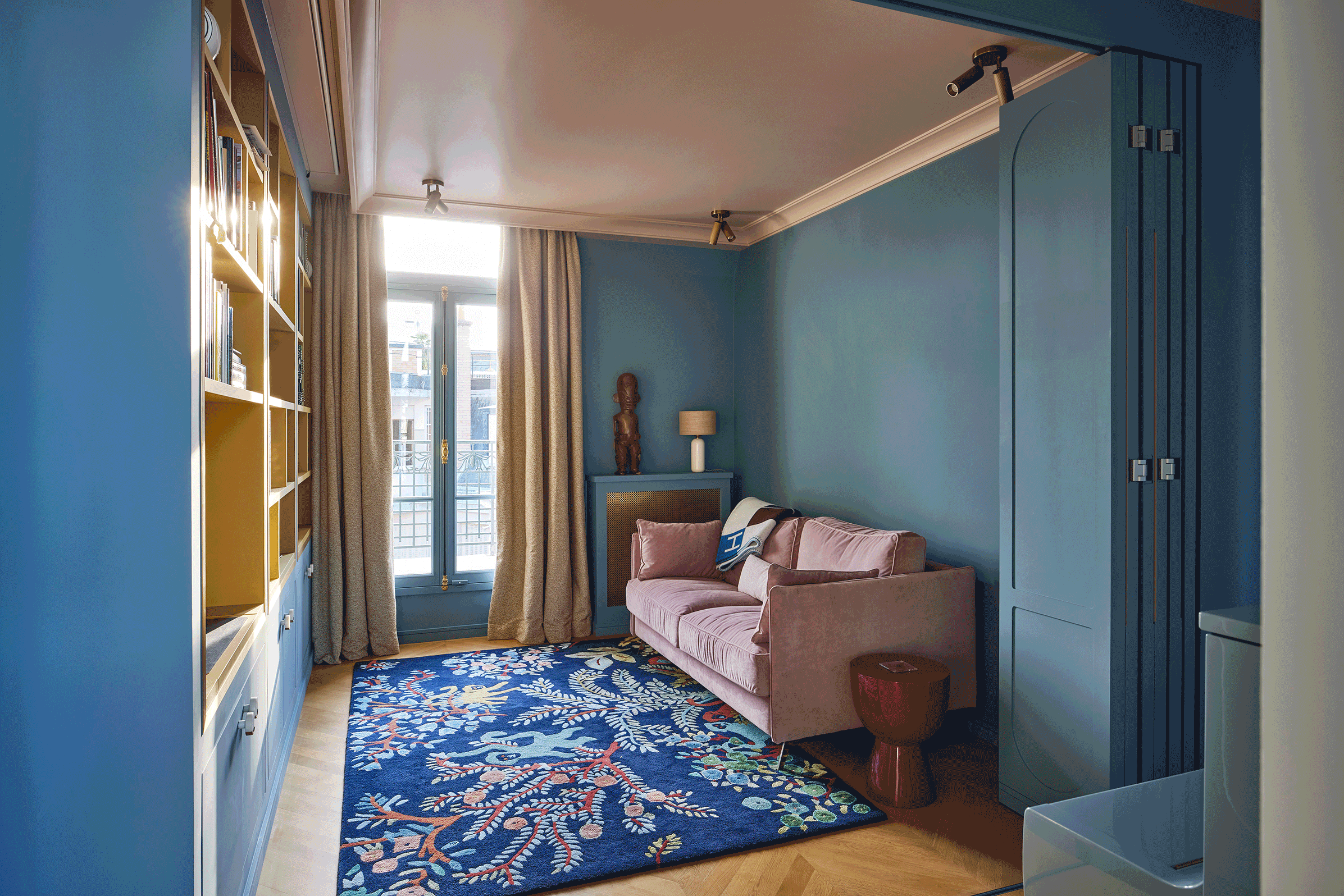 The different tones of blue work well with the traditional mid-brown chevron parquet floor and the choice of wall coverings add playfulness to the kids’ playroom.