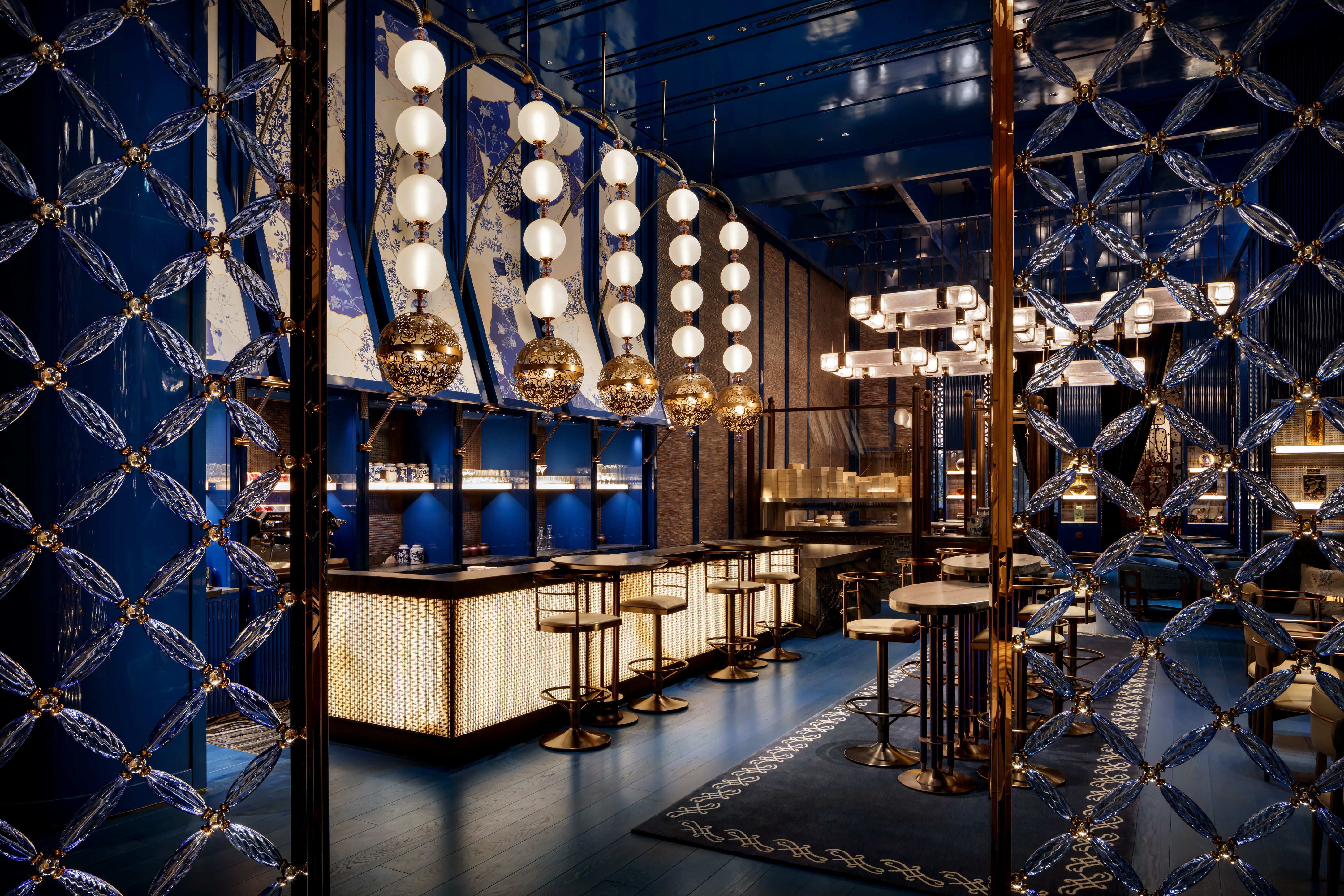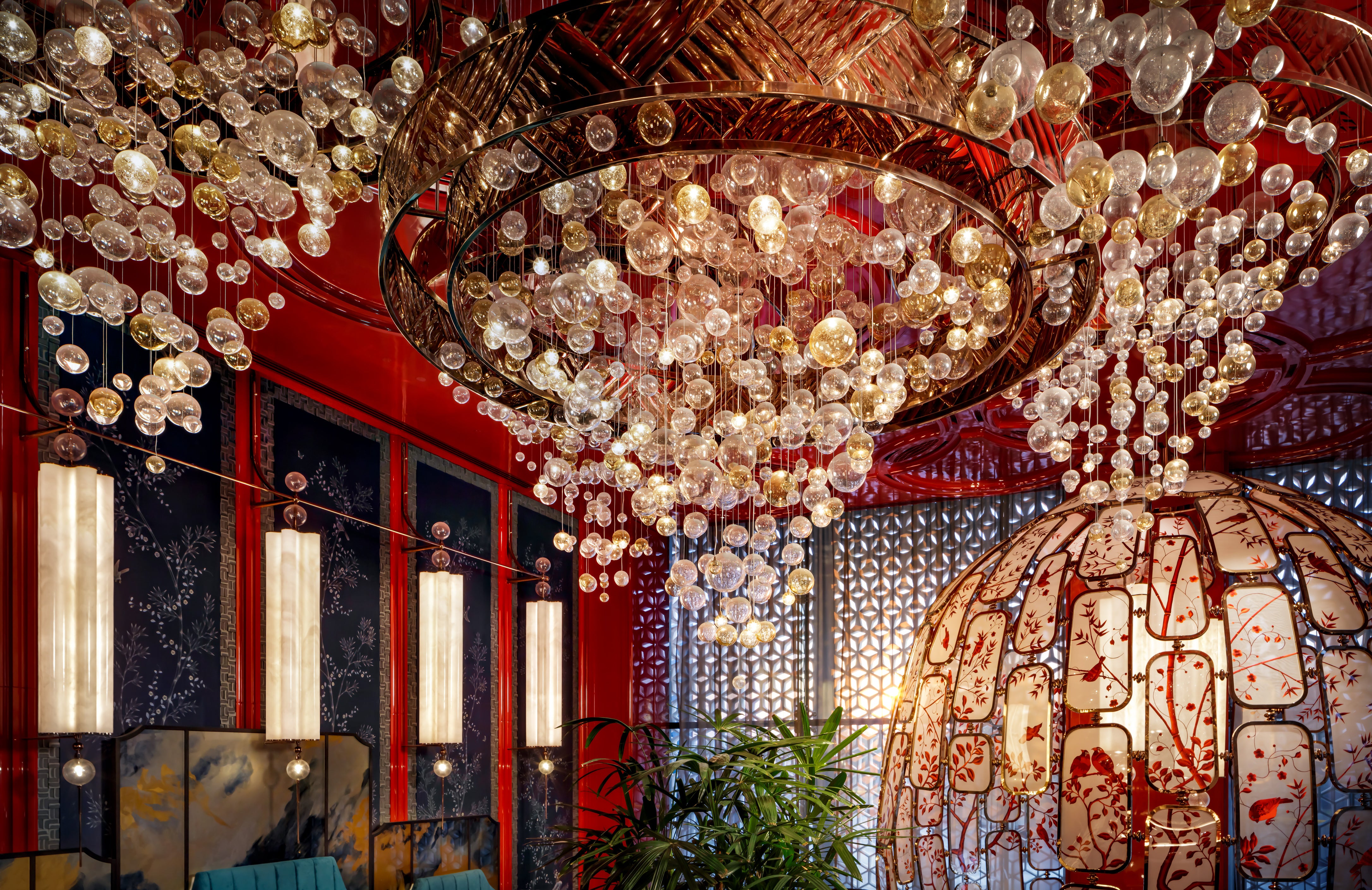 On the opposite side the bar features crystal screens resembling a traditional Chinese six-panelled lacquered screen, along with pendant lights suspended atop the bartender inspired by elements of Chinese opera.