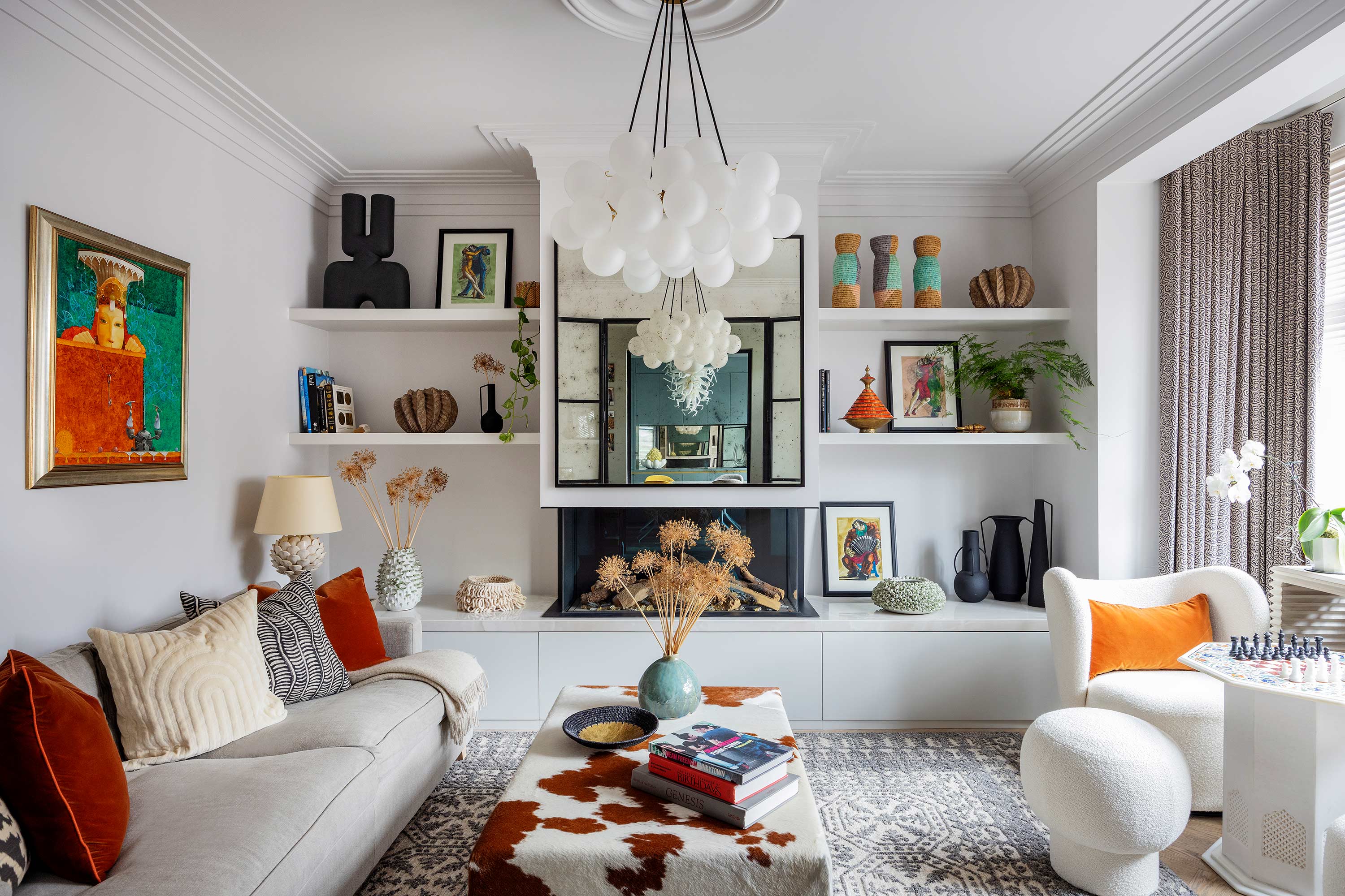 The entrance opens into a bright reception room where sculptural lighting, playful pops of orange, and tactile furnishings create an atmosphere that’s as welcoming as it is design-led.