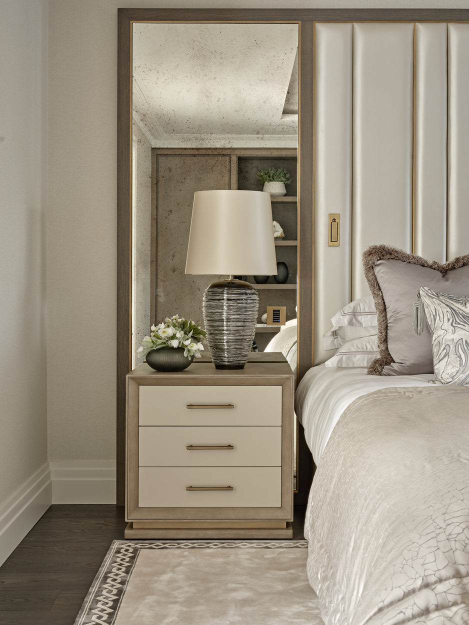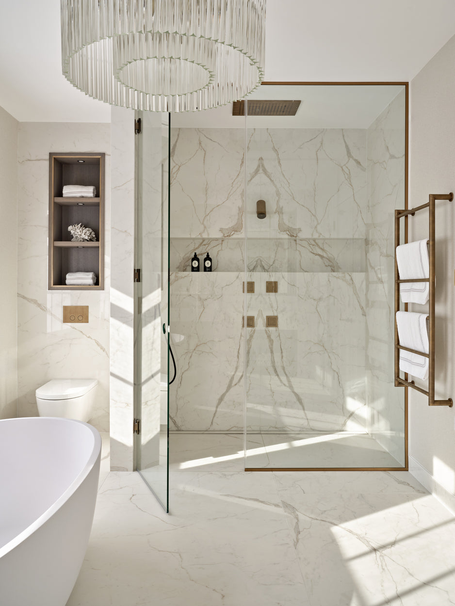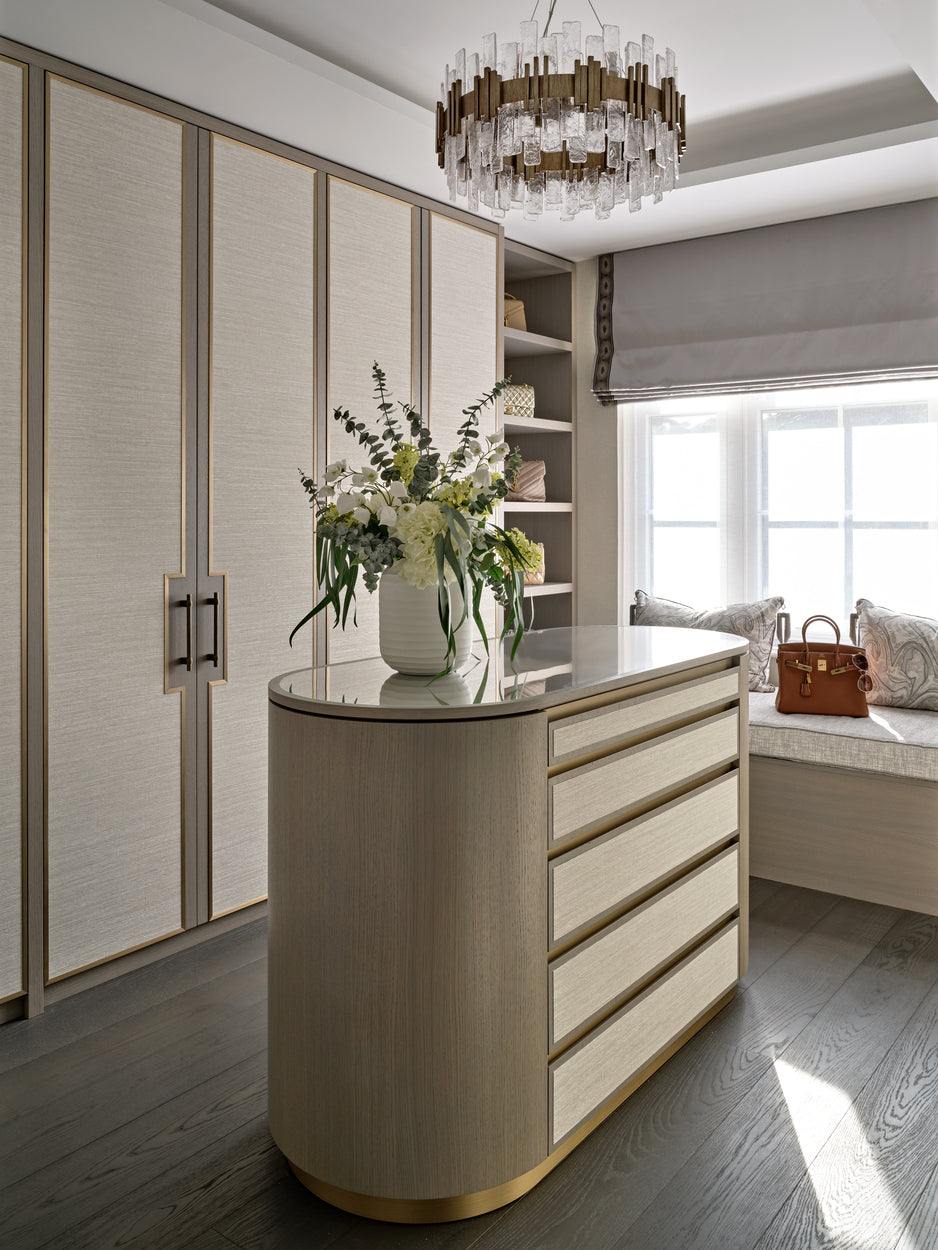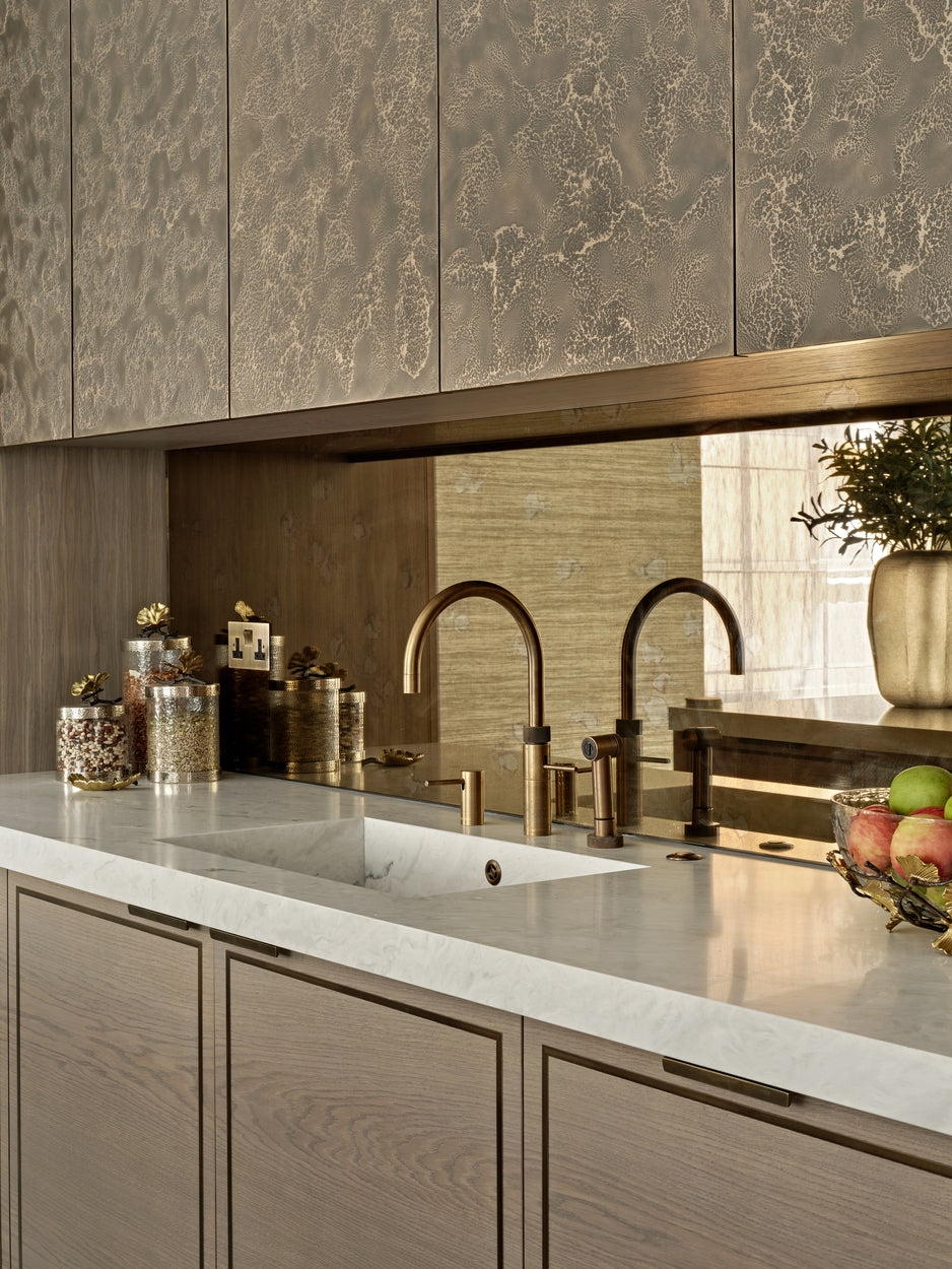 Textured neutrals, sweeping glass chandeliers and lighting sculptures breathe refinement and elegance to the living rooms and bedrooms. Bespoke joinery with luxury finishes in liquid metal, dark smokey wood tones and brass ironmongery create exceptional storage and design solutions that elevate the interior at every turn.