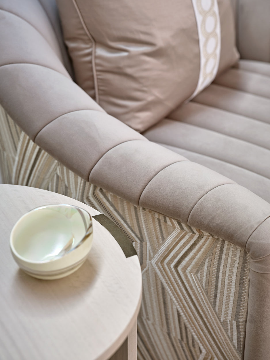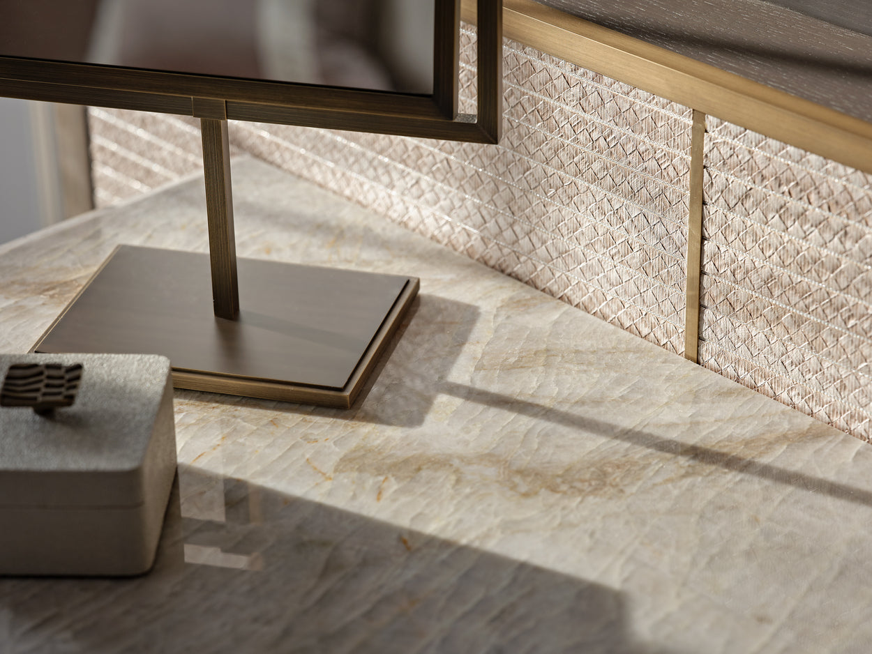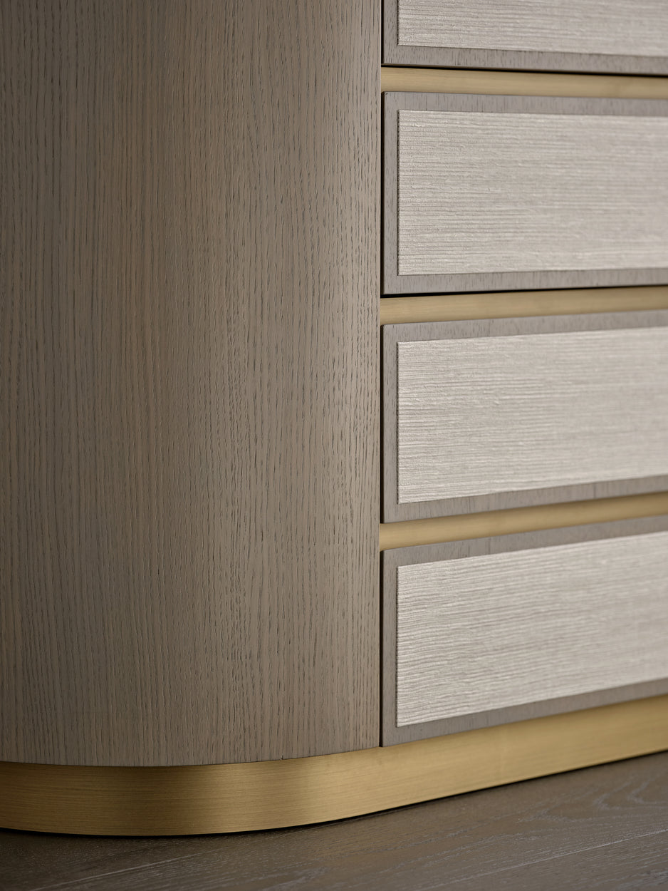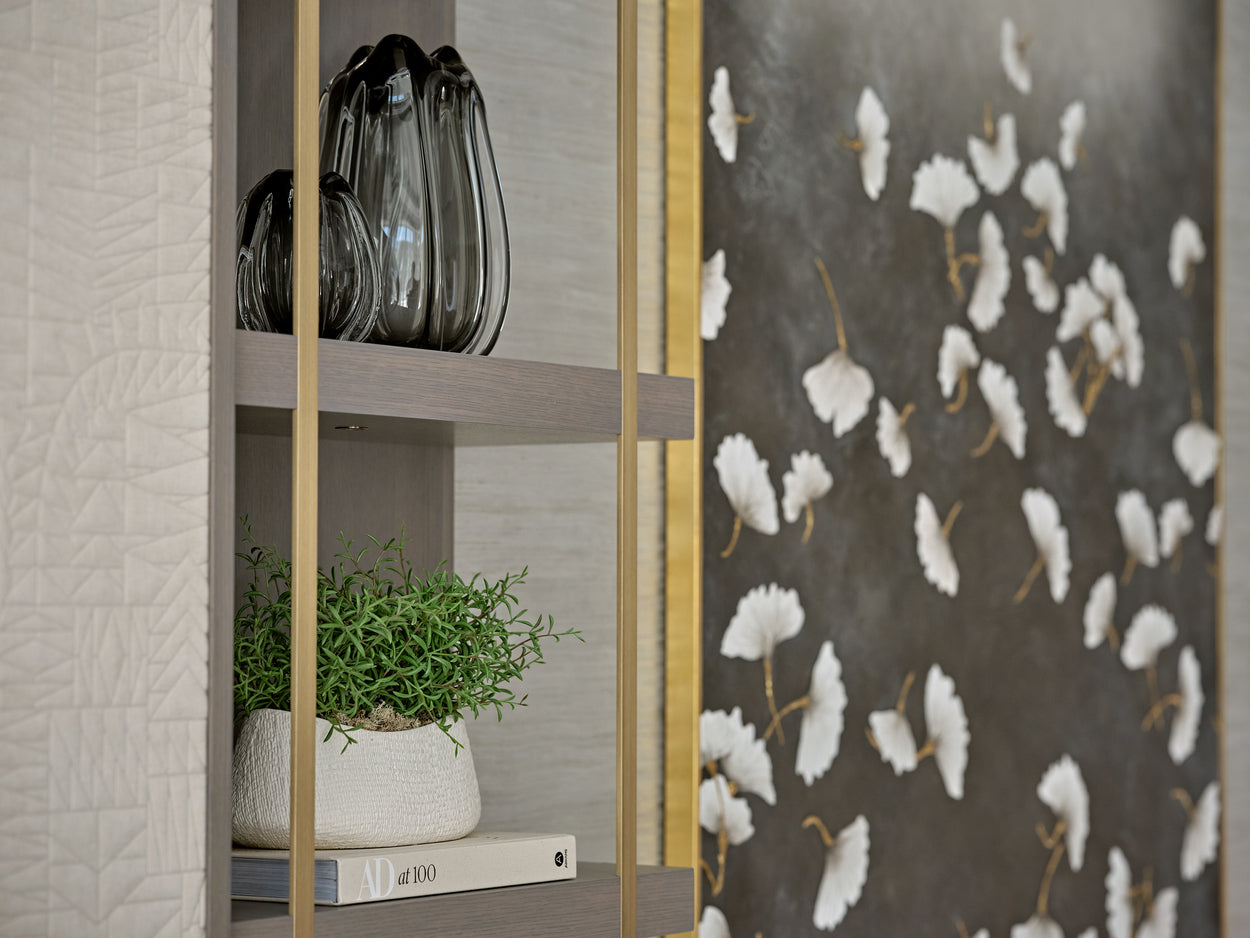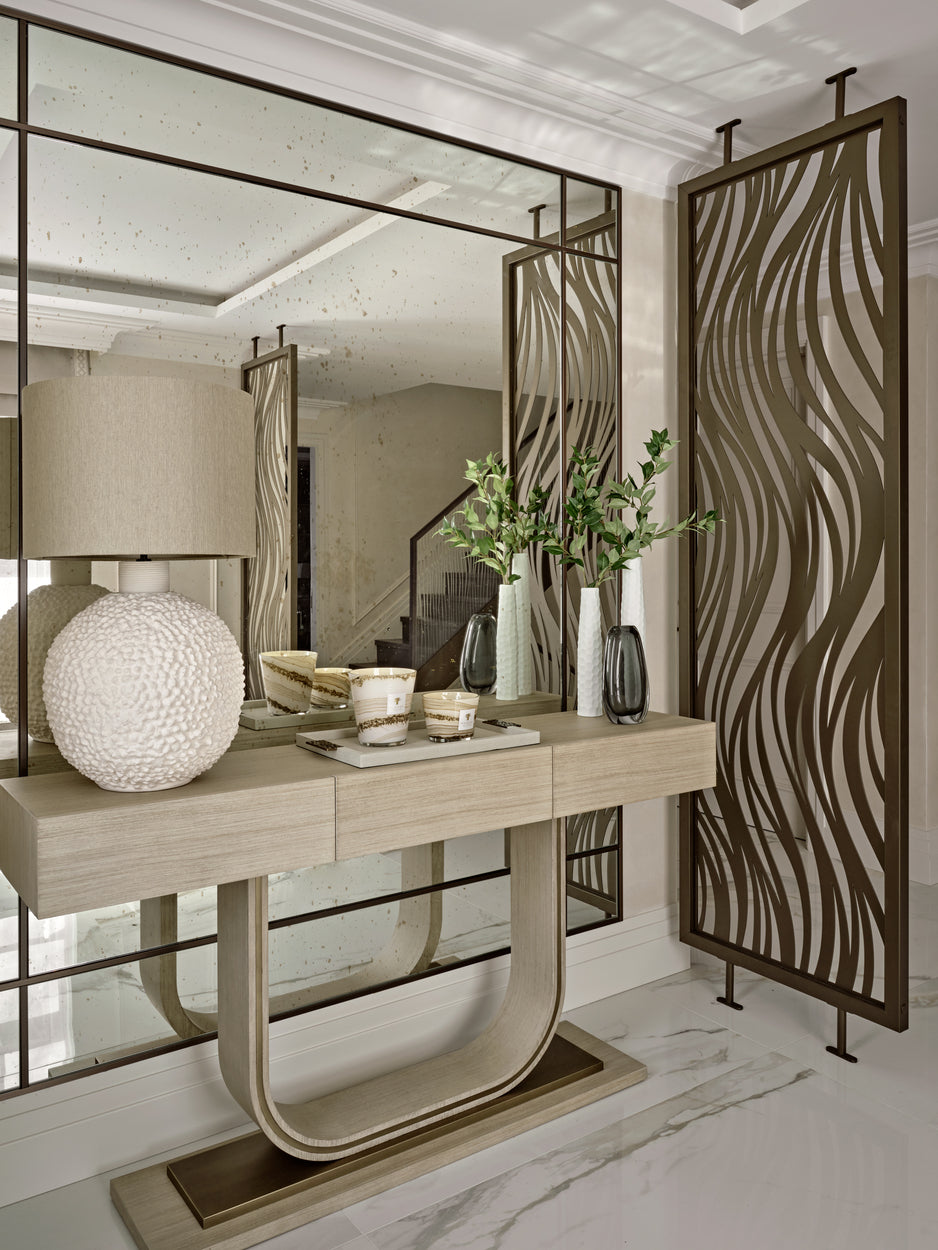 Textured neutrals, sweeping glass chandeliers and lighting sculptures breathe refinement and elegance to the living rooms and bedrooms. Bespoke joinery with luxury finishes in liquid metal, dark smokey wood tones and brass ironmongery create exceptional storage and design solutions that elevate the interior at every turn.