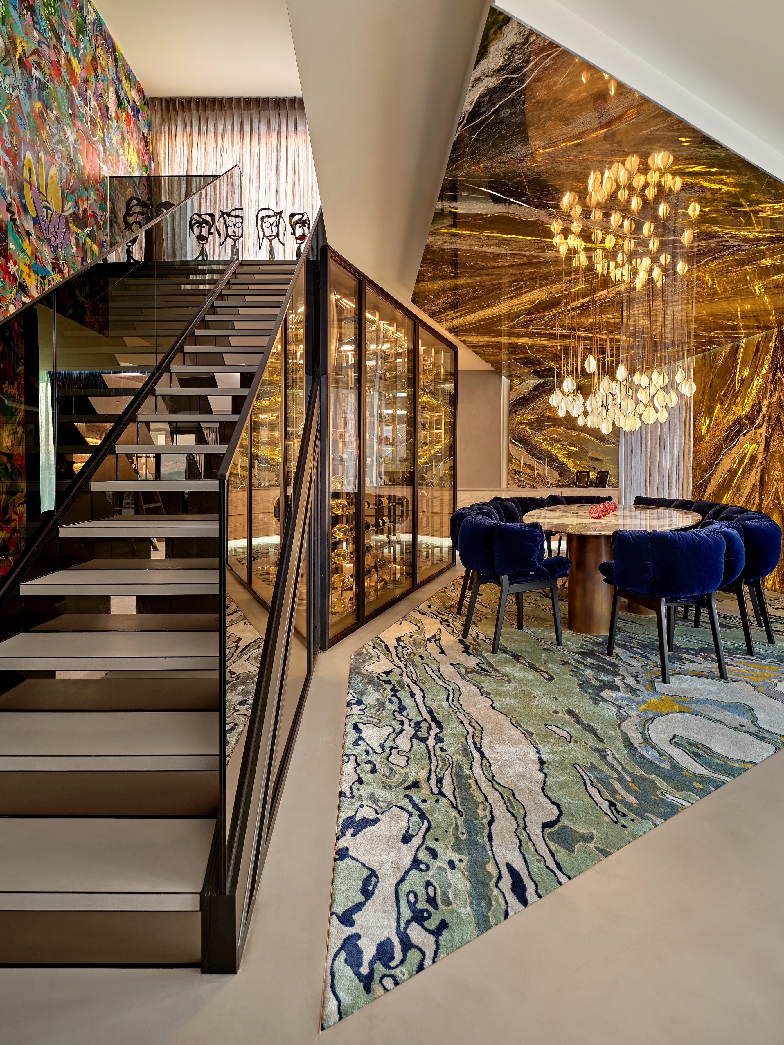 Each unique space is mesmerising. The sage green marble feature wall in the dining room is continued onto the ceiling. Providing an environment where dinners would get a sense of being in nature, elevated to a sense of dining in a unique entertaining environment. Pranvera comments how technical it was and how every millimetre counted. The construction of the ceiling raft was carefully designed with GD Stone and lighting manufacturer and the team on site to build up the ‘cake’ and secure onto the ceiling. Pranvera took it on herself to locate the drilling of seventy plus suspended light feature into the marble.