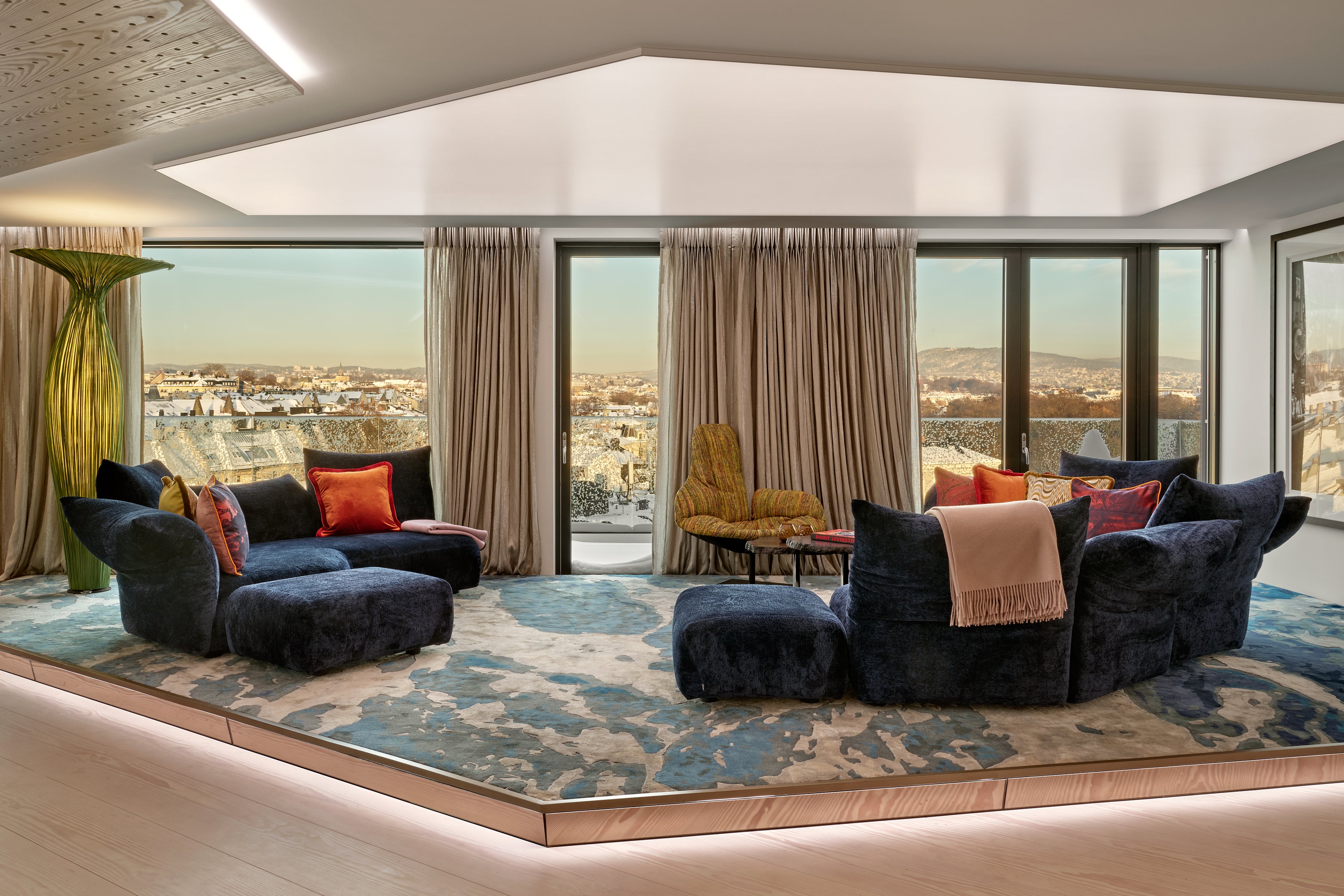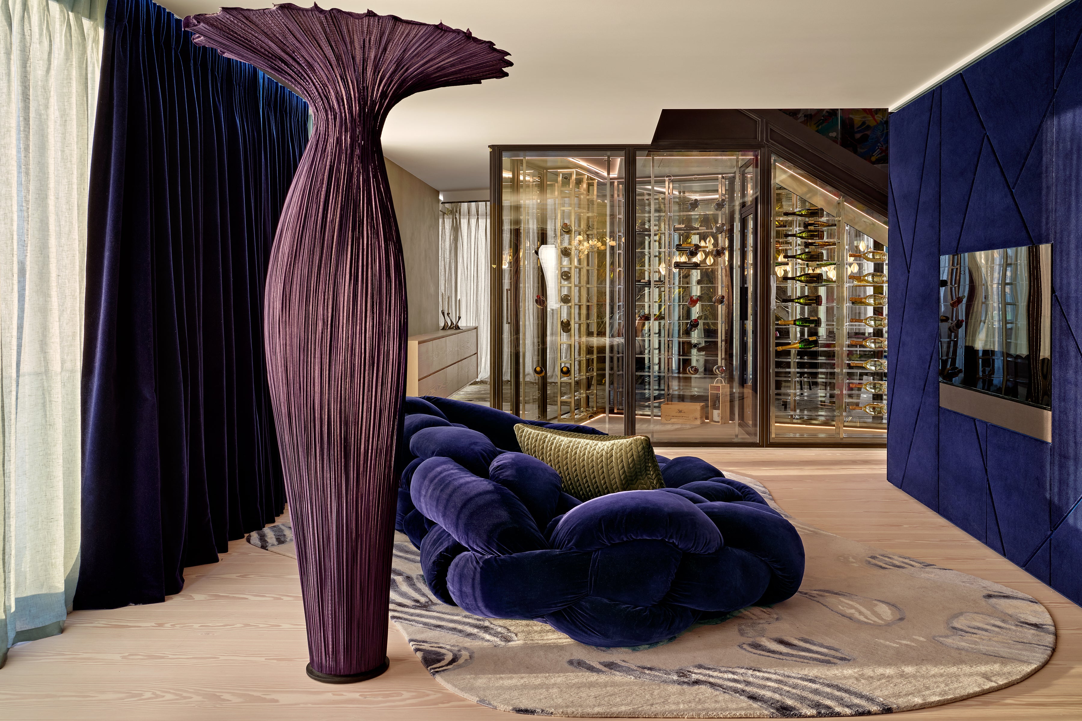The innovative light panel mirrors the living platform’s geometry, stimulating the experience with circadian lighting reflecting the natural light in the area. The raised platform (Fjord-shaped of course) with its integrated recessed rug gives the impression that the living space is floating. The bespoke rug mimics the sea and the sofa by Edra gives a sense of serenity as we sink down into the velvet to admire the panoramic views across the city.