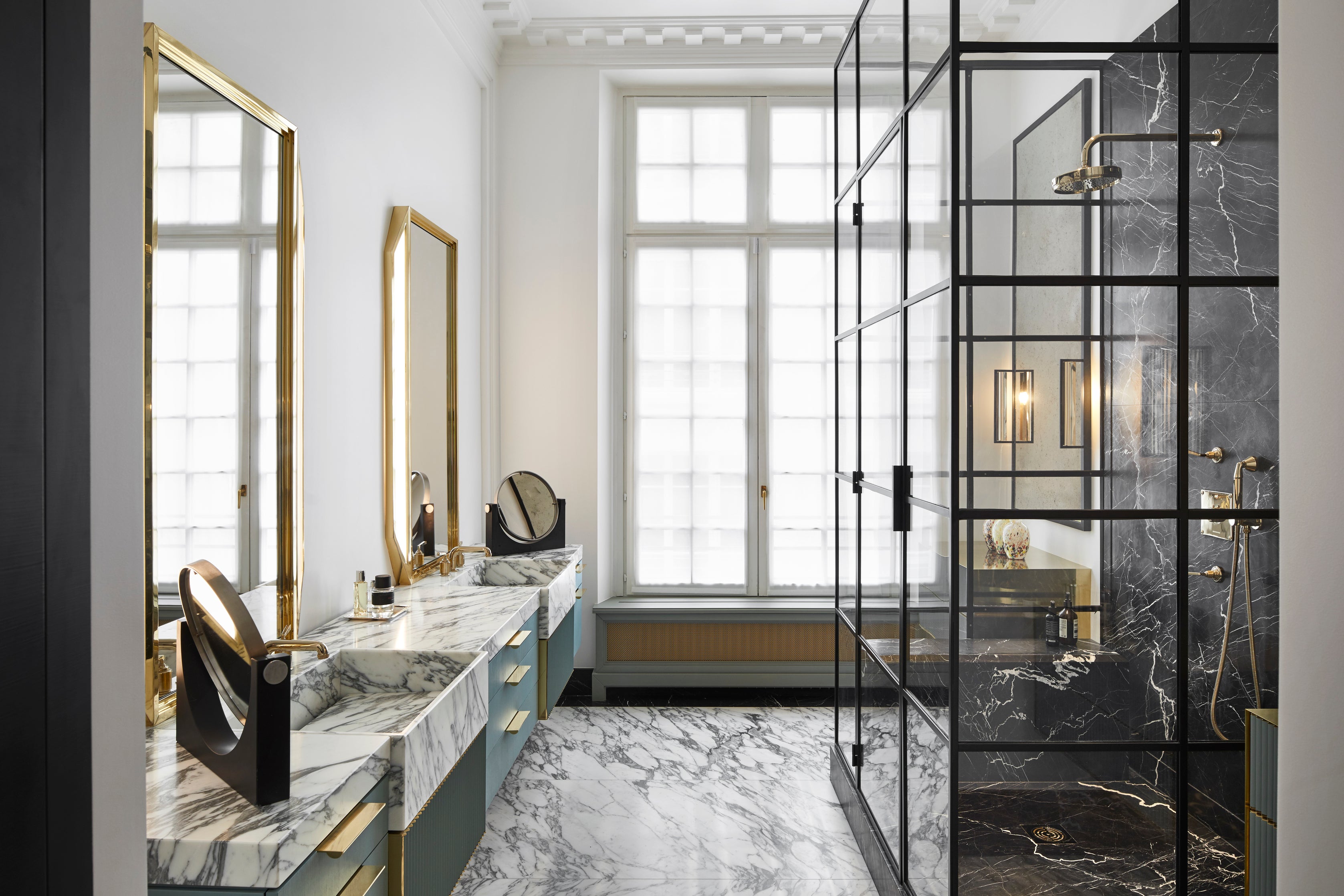 The bathroom combines deep black antique French marble by Zatti Interiors with Arabescato marble, creating a striking contrast. Brass-framed mirrors designed by Humbert & Poyet and table décor by Kelly Wearstler add opulent finishing touches.