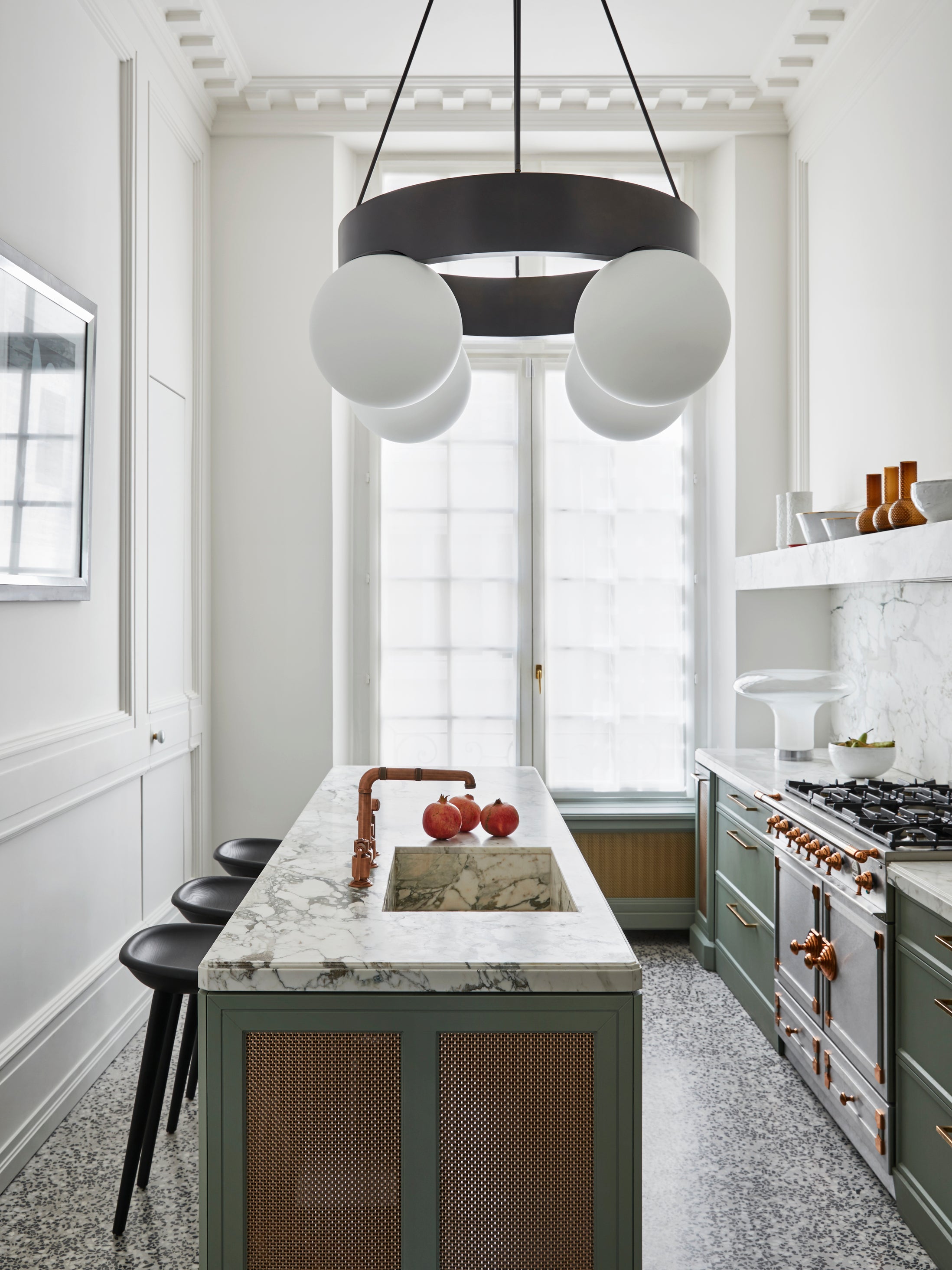 The kitchen, a mix of elegance and practicality, features a Humbert & Poyet designed cabinet in a rich Farrow & Ball shade, accented with brass. Arasbecato marble adds depth, while Bassam Fellows' Tractor stools provide understated luxury. The over-sized Asterios suspension light completes the room's polished atmosphere.