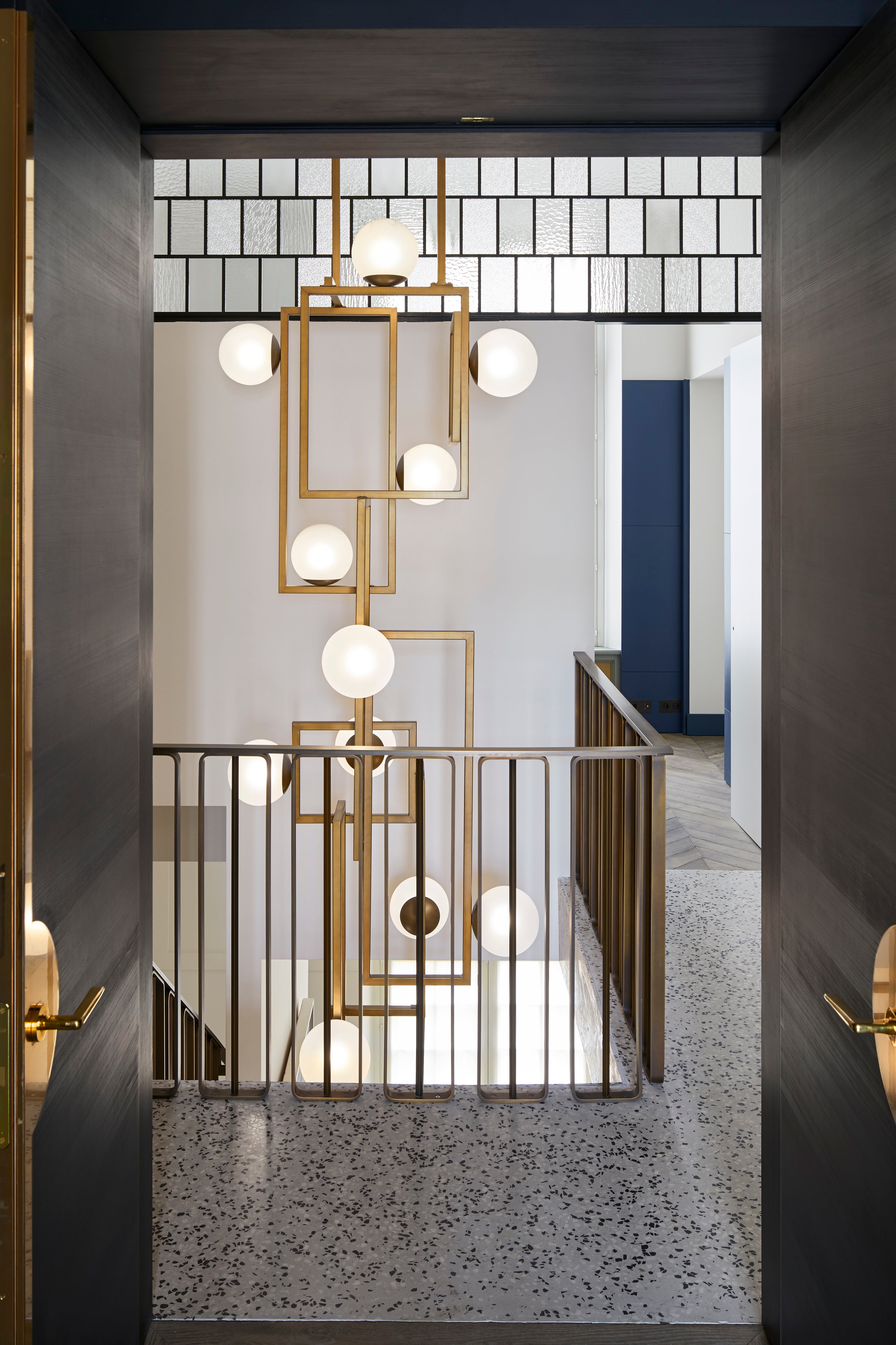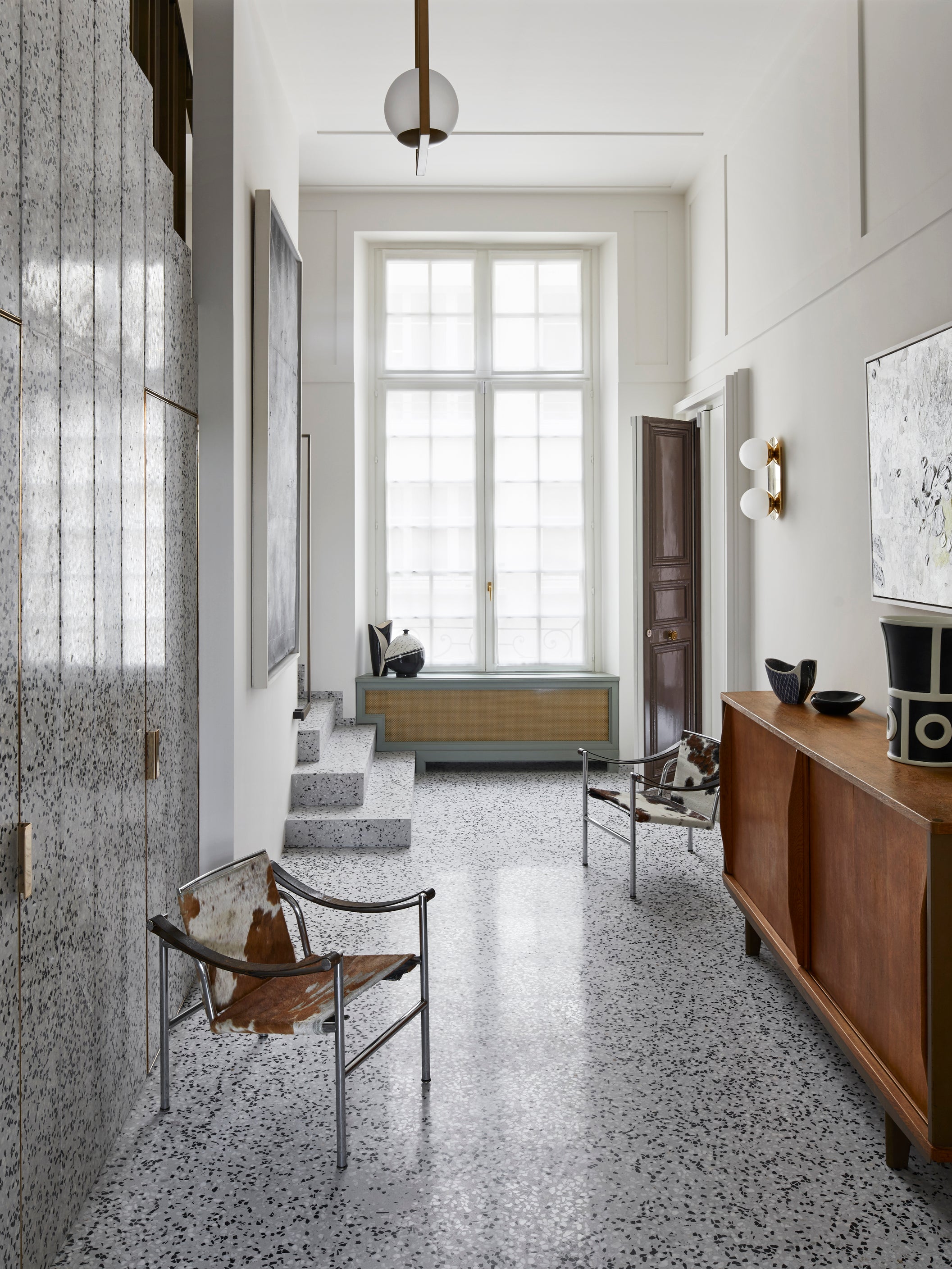 A grand terrazzo-floored entrance greets visitors, highlighted by custom brass railing and handles, setting a sophisticated tone. The hallway features an original Keith Haring painting, Le Corbusier's 1950s Sling chairs and a Jean Prouvé chest with vintage ceramics. The large brass and opaline suspension in the stairwell designed by Humbert and Poyet draws the eye upward, enhancing the sense of height and grandeur of the home.