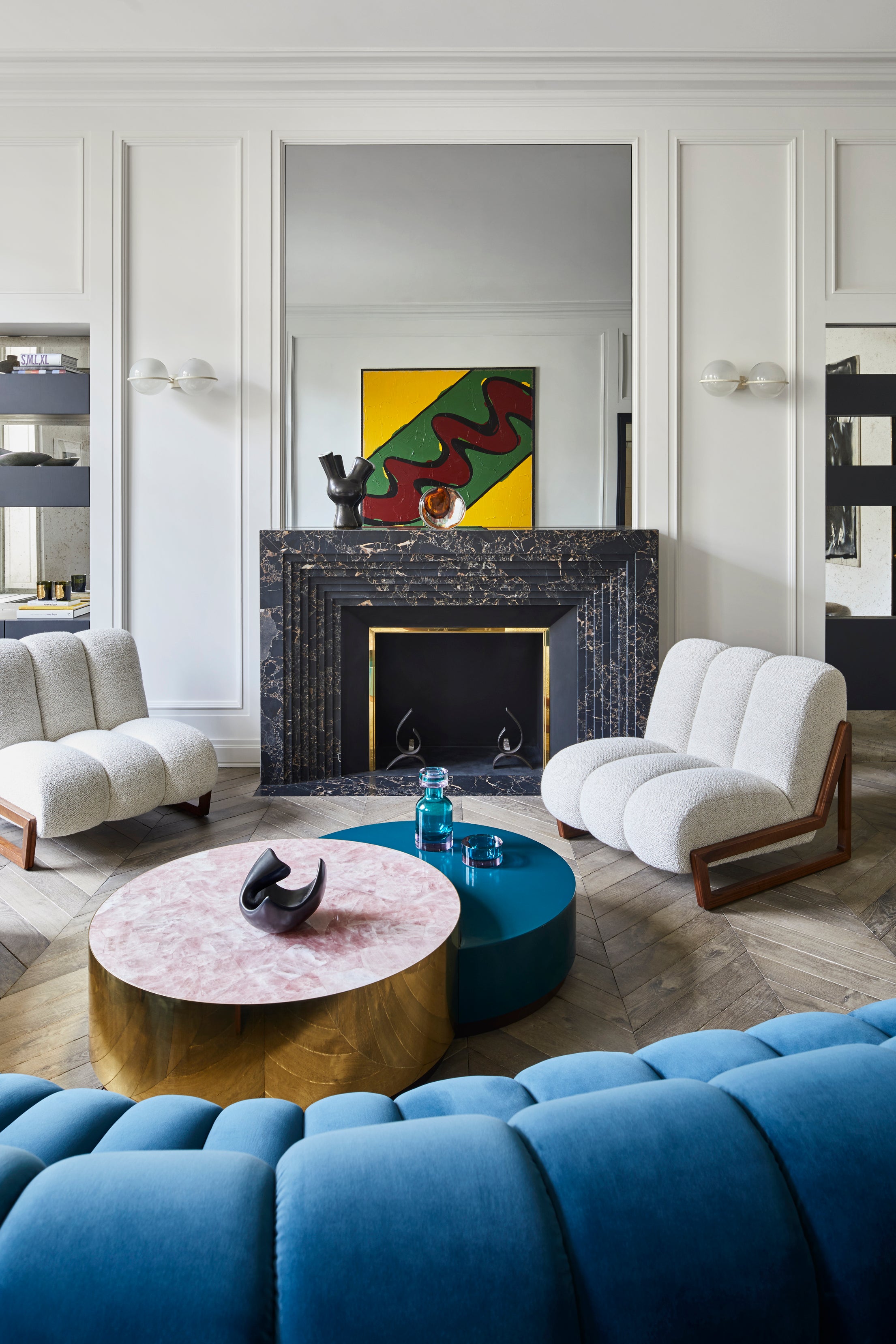 The living area balances art and comfort, featuring mid-century furnishings and carefully selected artworks, including pieces by Bertrand Lavier, Georges Jouve, and Robert Mapplethorpe. It is a curated showcase of Humbert & Poyet's design mastery, where nearly every element, from the Theodore armchairs and sofa to the Gabrielle coffee table and custom wooden shelving, embodies their signature blend of modern sophistication and timeless charm. A stately marble fireplace of their design grounds the room with understated grandeur adding to the drama of the living room.