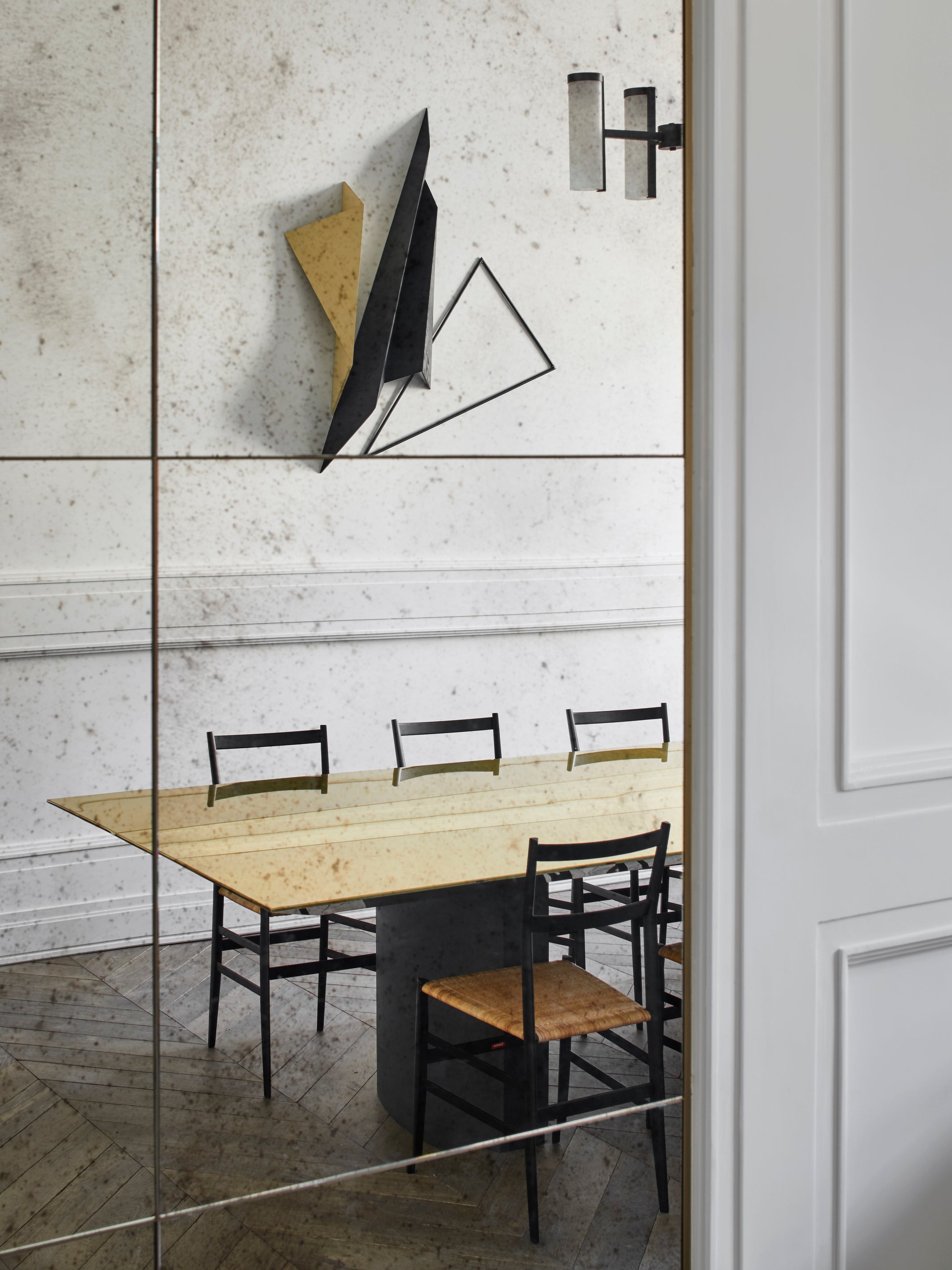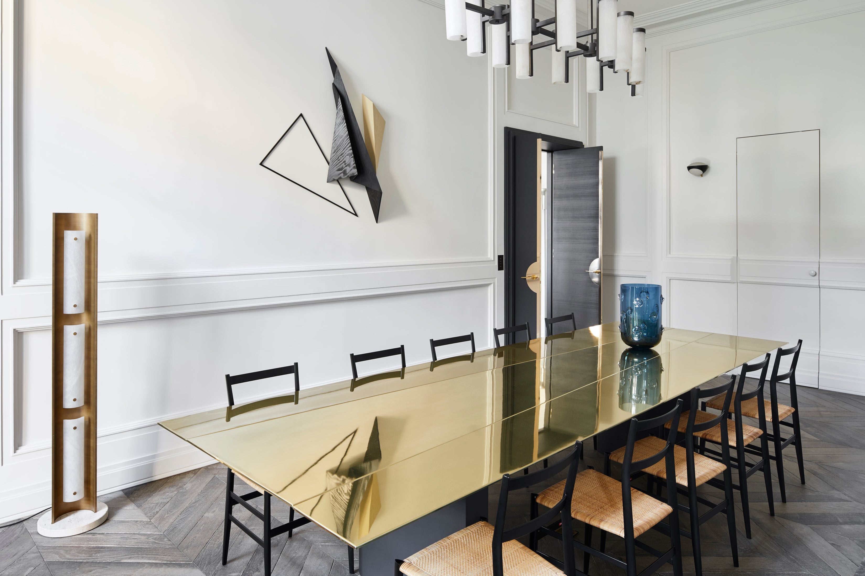 A bespoke chandelier made of metal and alabaster illuminates the gold Apolline dining table, paired with Gio Ponti’s Superleggera chairs. A bold wall art piece by Katja Strunz adds an architectural dimension to the dining space, echoing the designers' affinity for modernist and art deco styles.