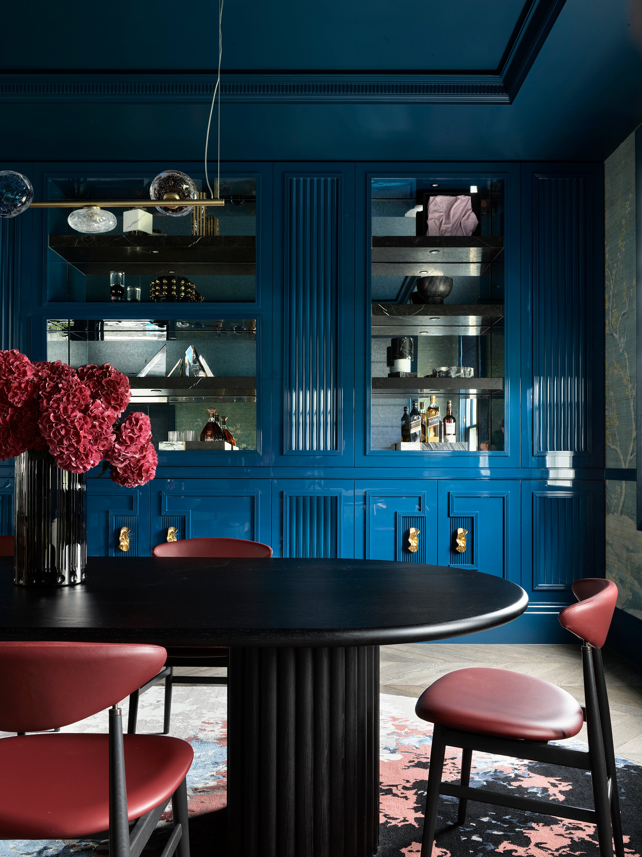 Greg Natale’s rich blue cabinetry brings depth to this sophisticated dining room, balancing elegance and boldness. The matching blue ceiling anchors the space, adding dimension, while dark reds create a grounded, intimate atmosphere.