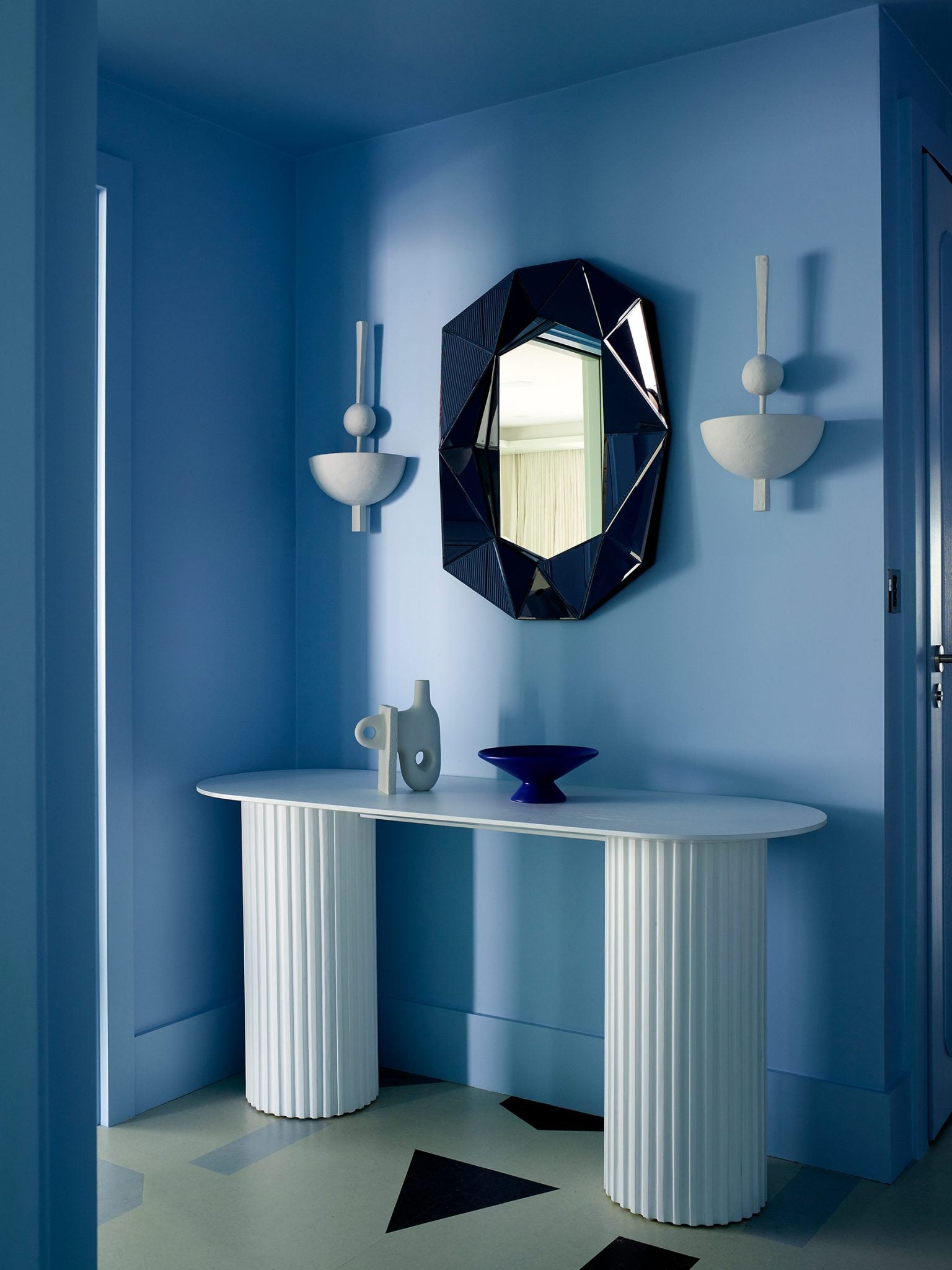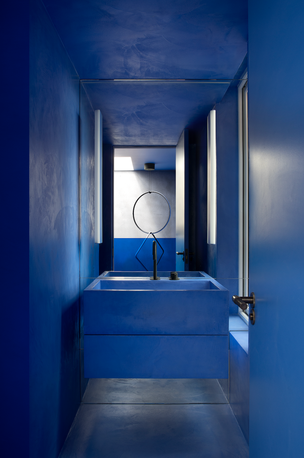 Róisín Lafferty’s striking blue powder room creates a powerful sense of depth and contrast. The monochromatic approach emphasises clean lines and architectural features, adding a touch of drama.