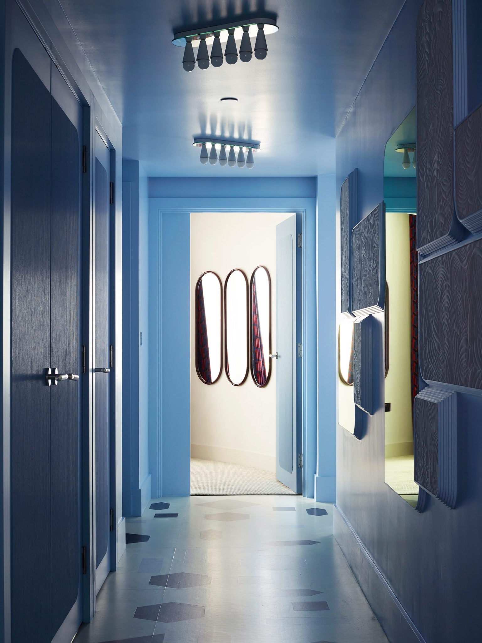 Owl Design’s hallway uses a serene blue palette to create a fresh, modern vibe. The mix of geometric patterns and soft blue walls transforms a transitional space into a visually captivating entryway.