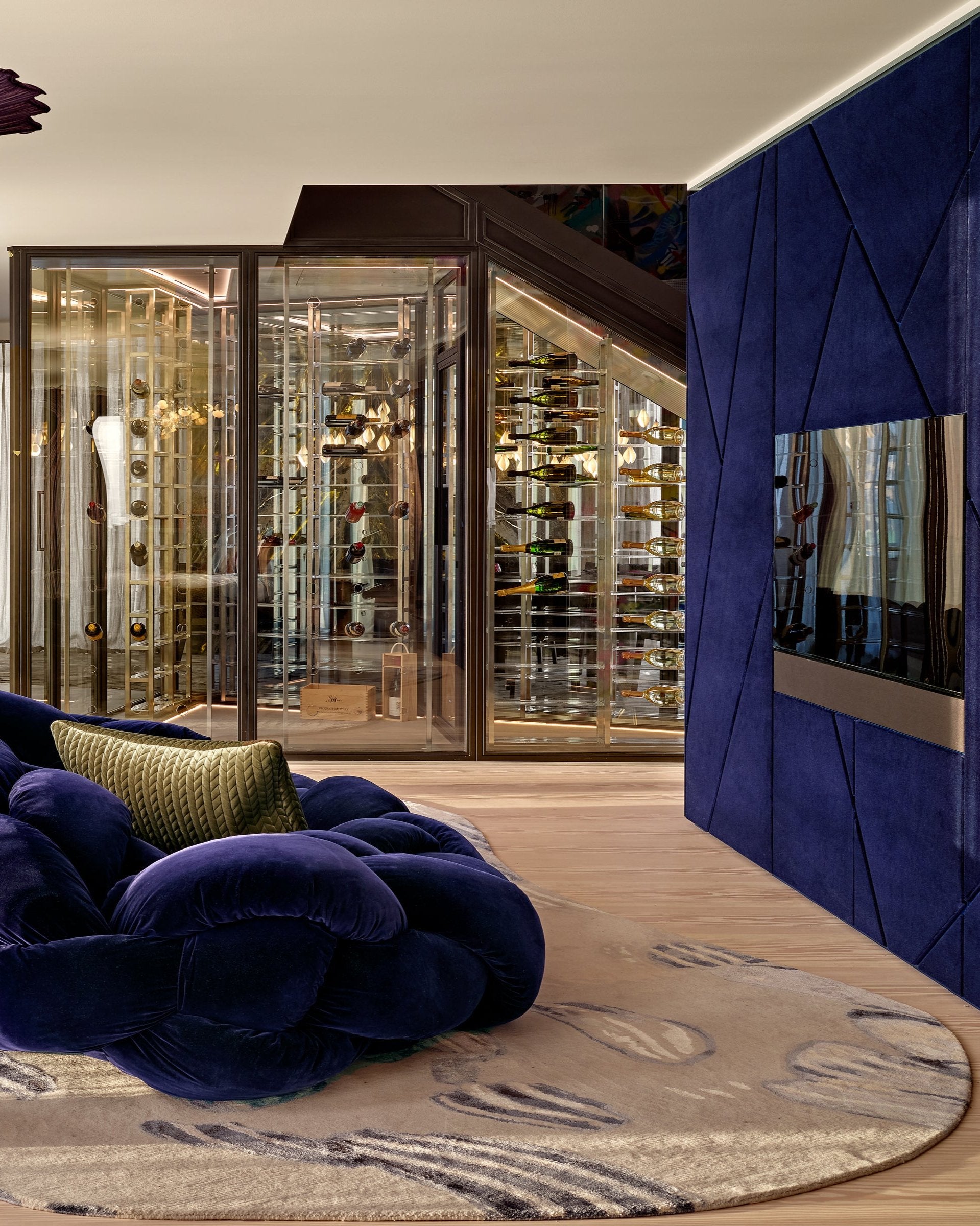 The plush blue seating and modern textures bring a regal touch to this lounge area designed by VULA Design. The jewel-toned palette and unique forms make the space luxurious yet welcoming.