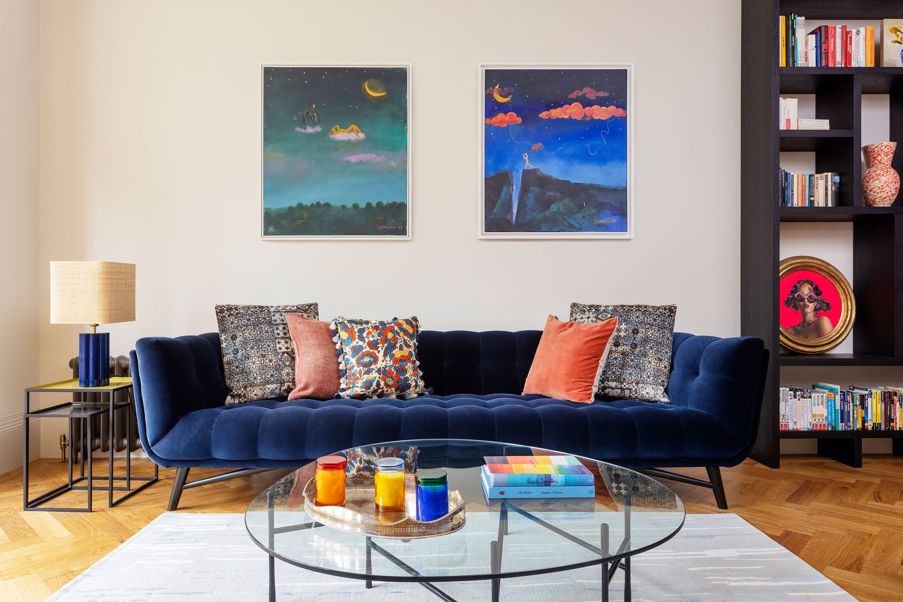 With a blend of navy and neutral tones, Zulufish’s living room feels both chic and comfortable. The bold wall art and vibrant accents add personality, making it a lively, stylish retreat.