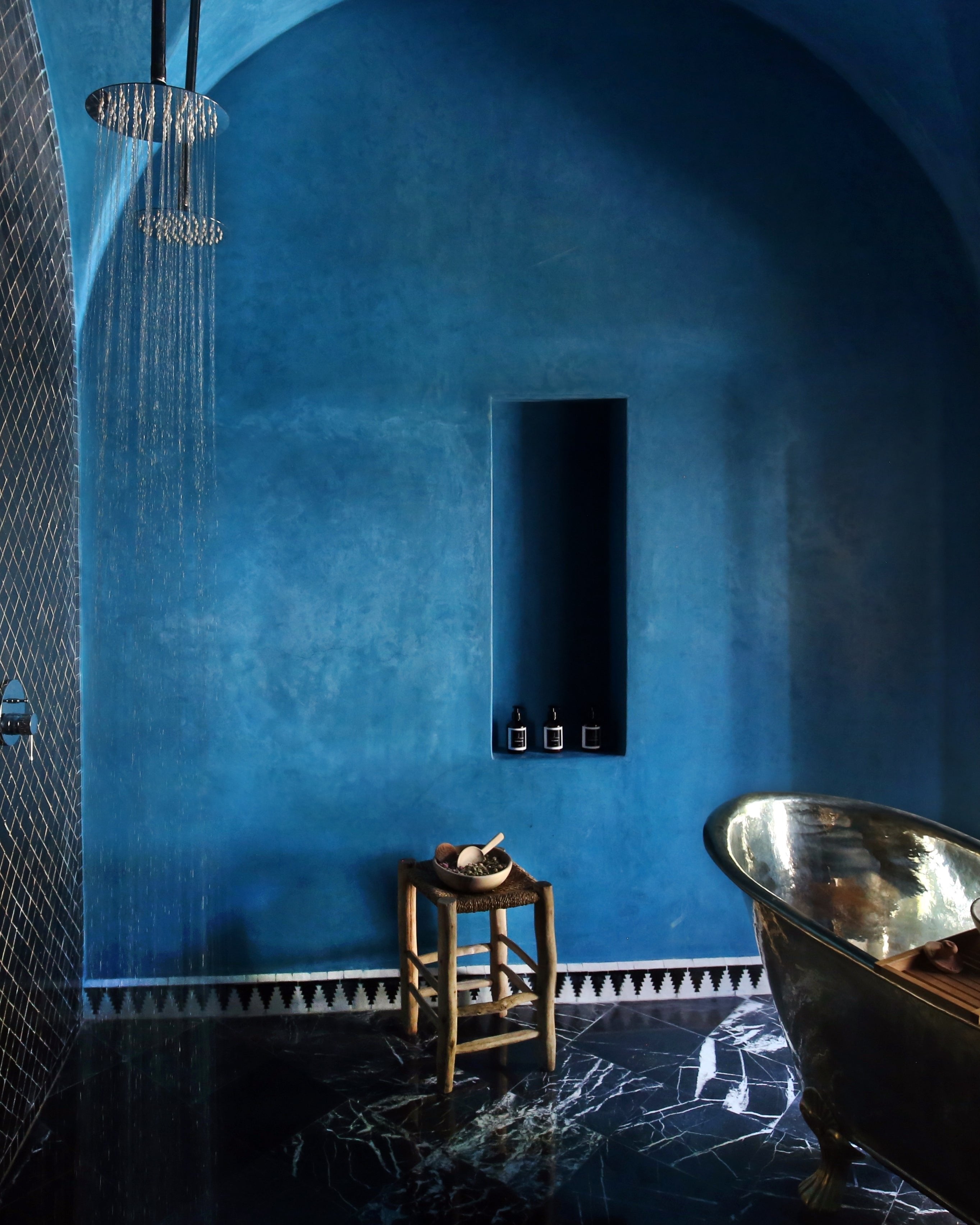 El Fenn’s Moroccan bathroom immerses guests in a world of moody blues and textured tiles. The dark, atmospheric setting invites relaxation, with touches of gold adding a hint of opulence.
