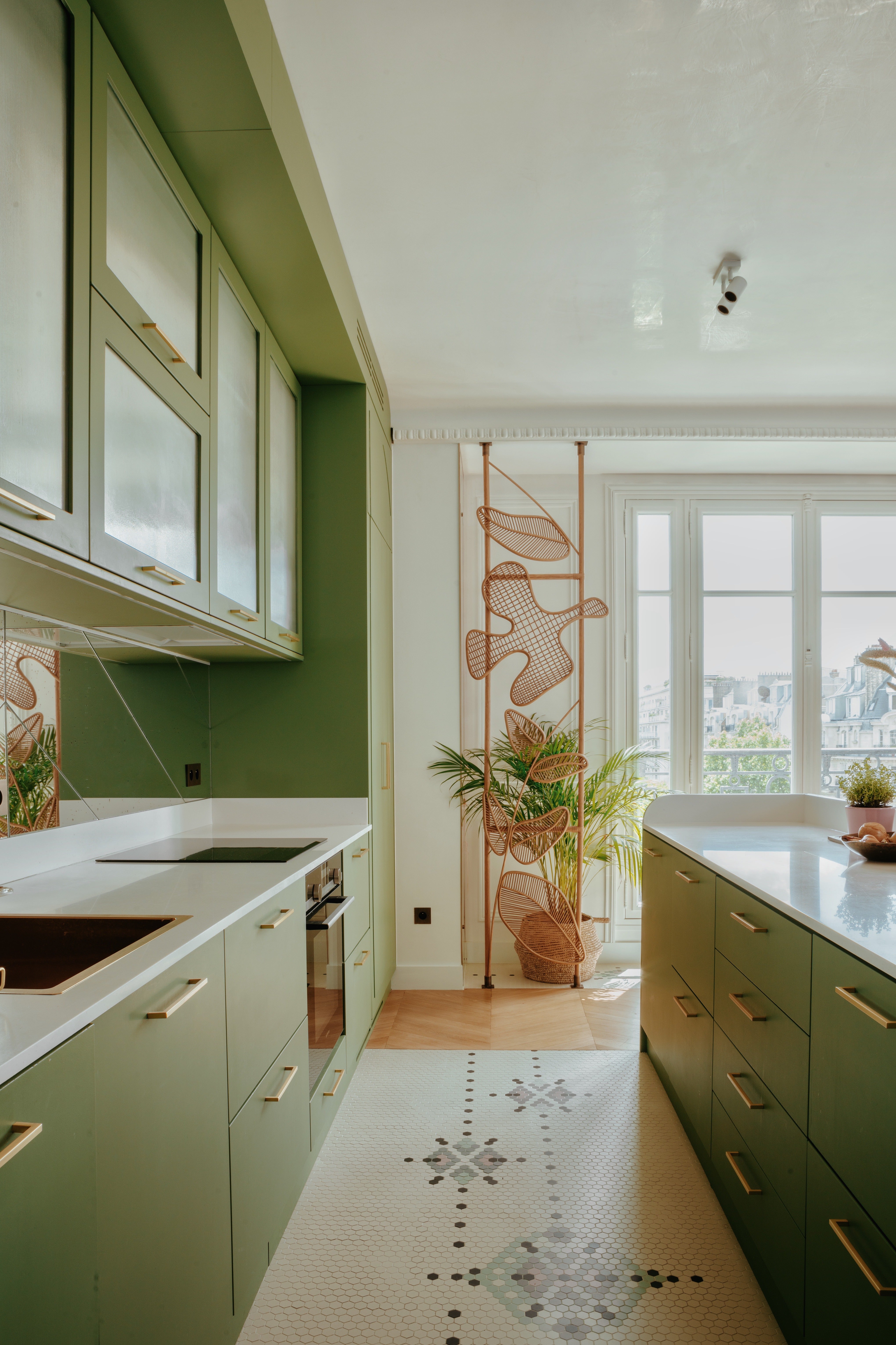 This olive green kitchen breathes life into the home with its soft green cabinets, which lend a refreshing energy to the space. The olive green offers a subtle yet impactful colour that is both soothing and invigorating. Accented with sleek gold hardware, the cabinets exude a quiet elegance that harmonises with the influx of natural daylight. The wall sculpture introduces a modern, artistic touch with its flowing lines and botanical design, stretching towards the high ceilings and enhancing the sense of space. Below, the playful terrazzo flooring anchors the kitchen, leading you through the area with its charming pattern that complements the overall design.