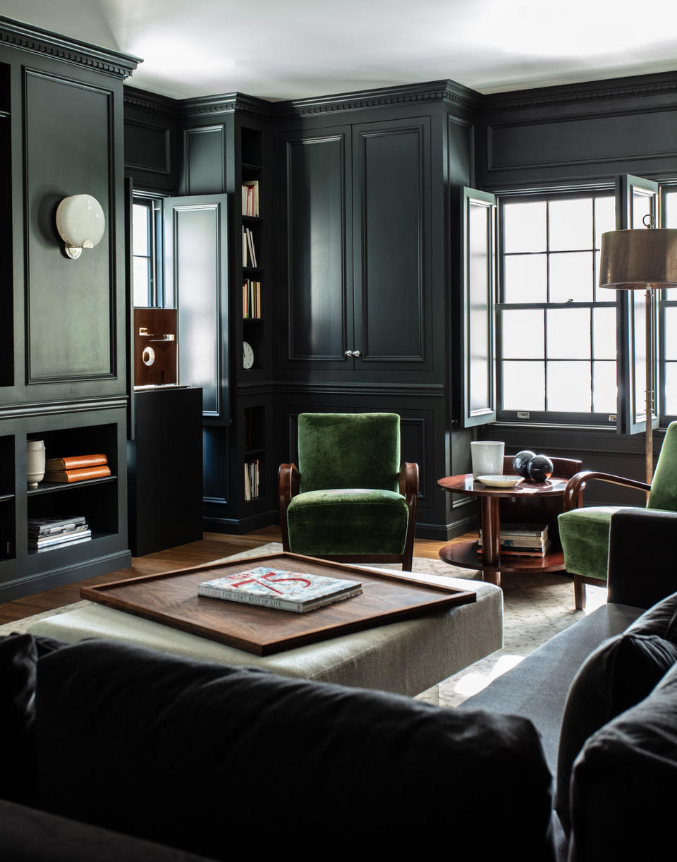 The dark green panelling on the walls creates a rich, enveloping atmosphere, making a bold statement that's both cosy and commanding. Plush velvet armchairs in a lively shade of green draw the eye, providing a comfortable nook that promises relaxation amidst the room’s stately charm. The natural light streaming through the large windows gives the green panels and furniture a dynamic quality, changing with the time of day. Accents like the wooden elements, the leather details on the furniture, and the curated selection of books add layers of texture and interest.