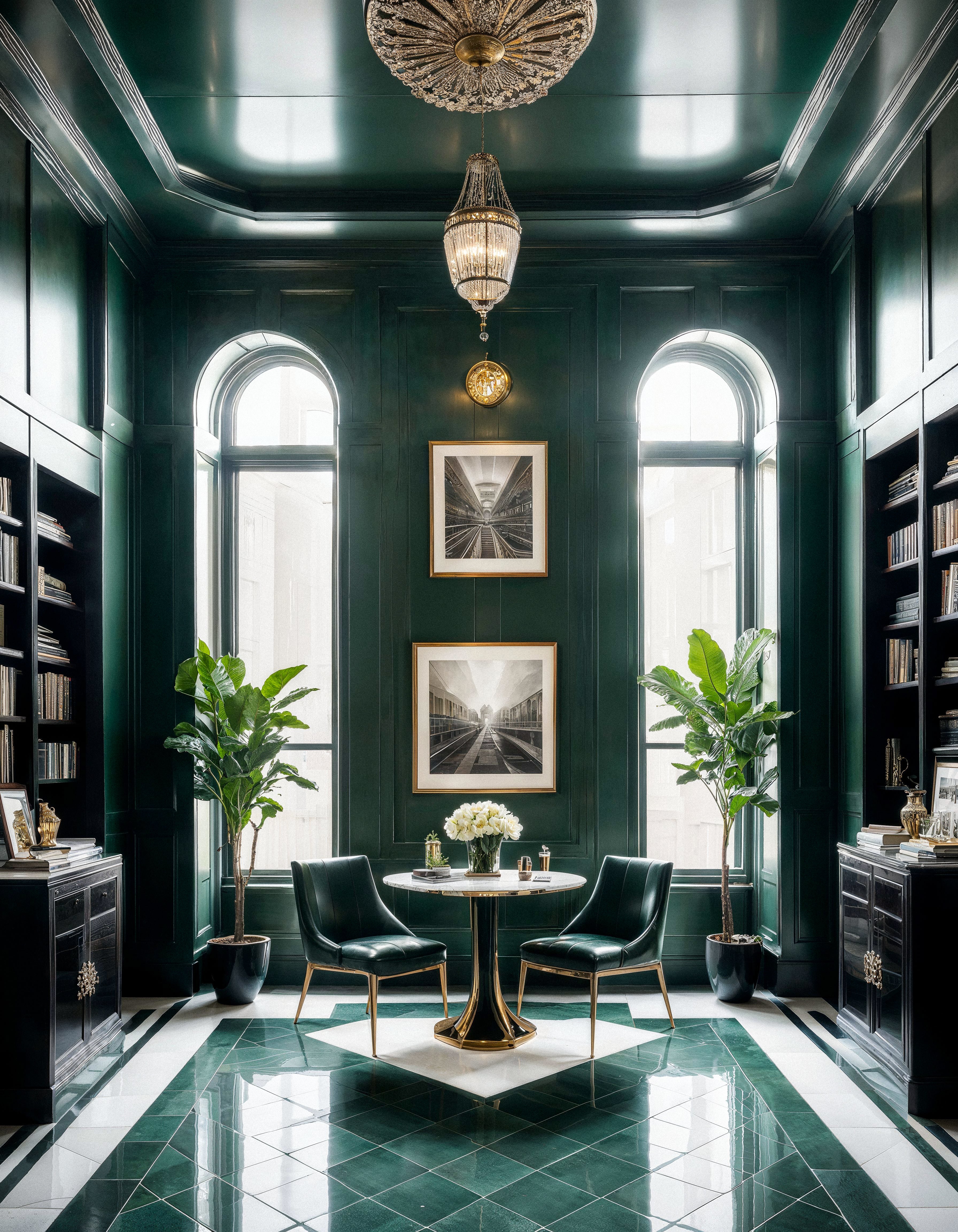 Daryl Anselmo’s AI design transforms a simple corner into a luxurious reading space with its deep green walls and green tile marble floors. Gold details and sophisticated furniture pieces add a touch of opulence, while well-placed lighting fixtures ensure the area is both inviting and well-lit.