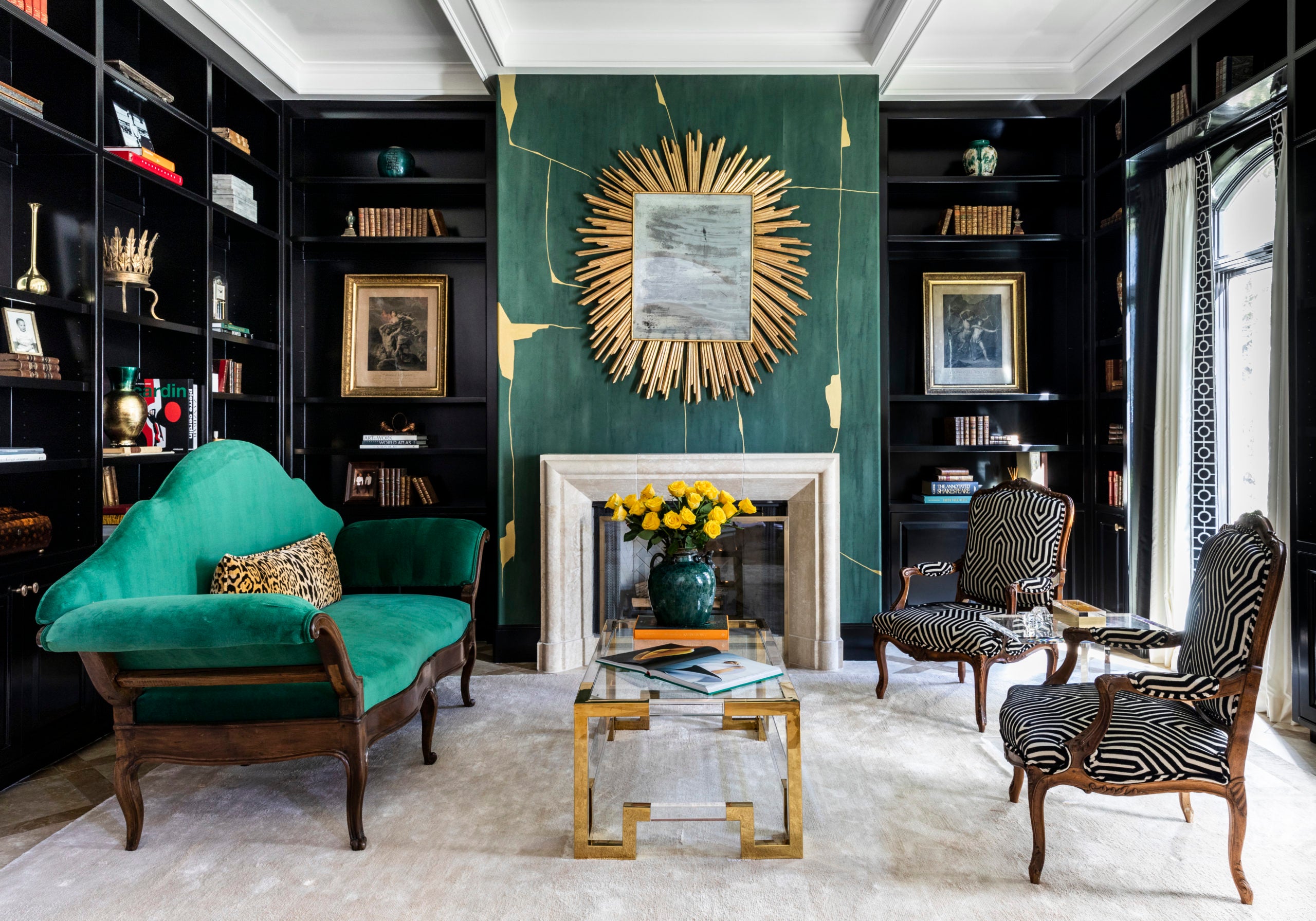 The striking Porter Teleo emerald wallpaper, a canvas of rich green adorned with abstract gold accents adds a touch of luxury to the living room. The vibrant wall becomes the focal point, complemented by the deep, dark bookcases that flank the fireplace, creating a dramatic yet balanced contrast. A sunburst mirror with golden rays echoes the wallpaper's opulence and serves as a stunning centrepiece above the mantel.