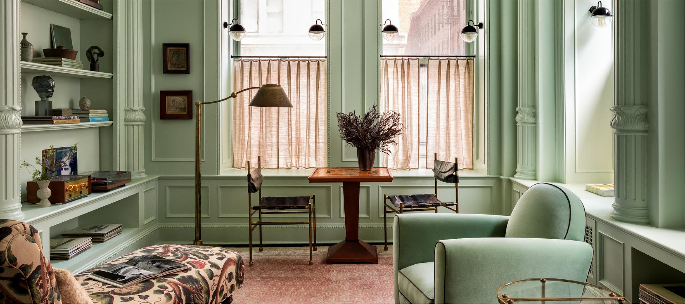 For a more subtle approach to green, try using the colour in different sections of upholstery like in this design by Banda Property. The Sedilia Sennen green velvet sofa follows the curve of the room, creating a cosy yet elegant seating area. Its vibrant tiger print from Sedilia contrasts sharply with the room’s subtle colors and the straightforward contemporary artwork that draws the eye.