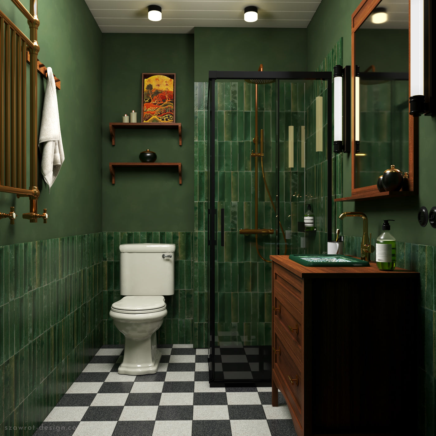 Lustrous hunter green tiles line the lower walls and shower of this quirky bathroom, giving way to a muted sage that adds depth and interest to the design. The interplay of greens complements the checkerboard floor, which adds a dash of classic flair to the modern aesthetic. Wooden elements and brass fittings impart warmth, creating an inviting space.