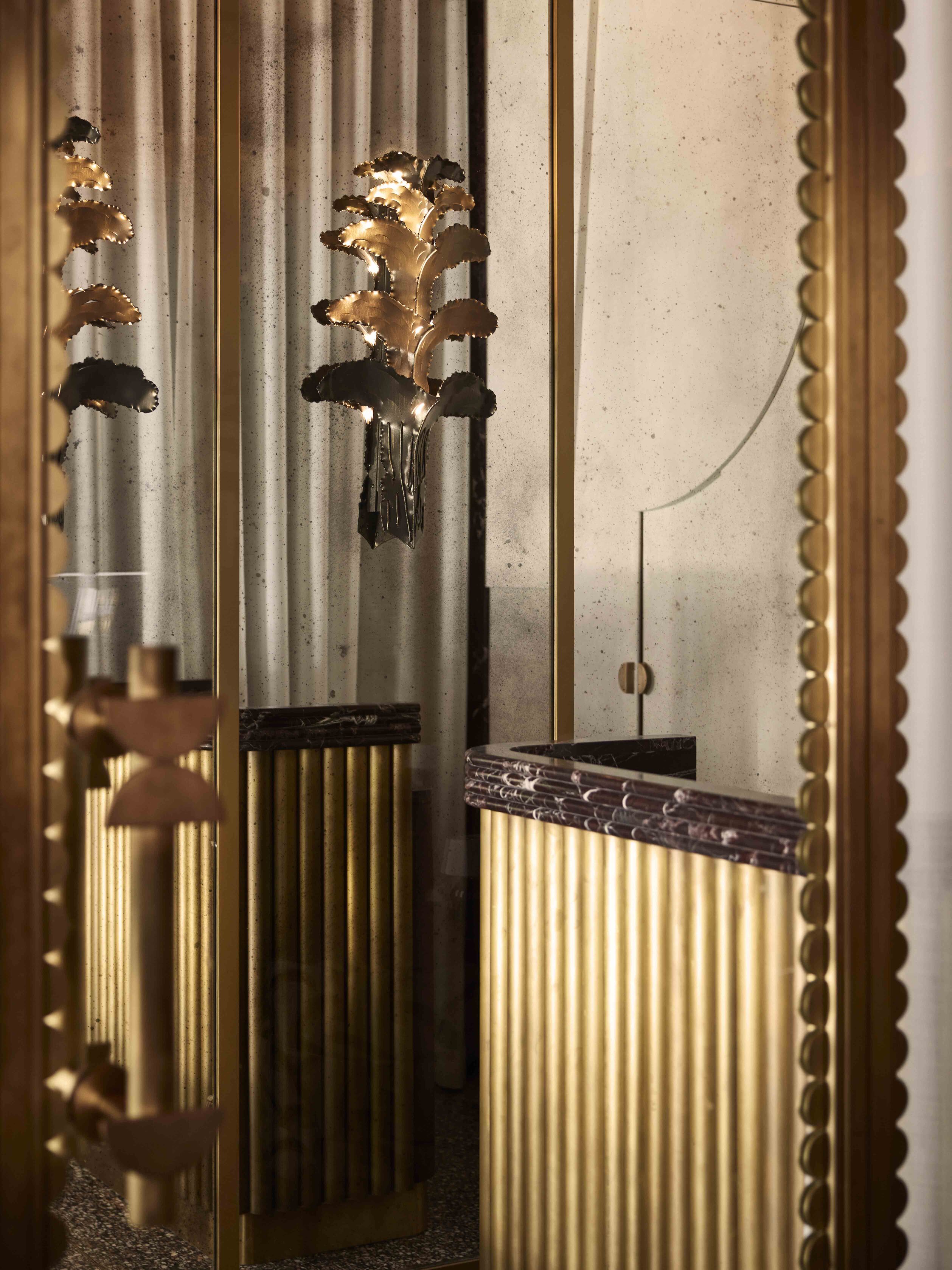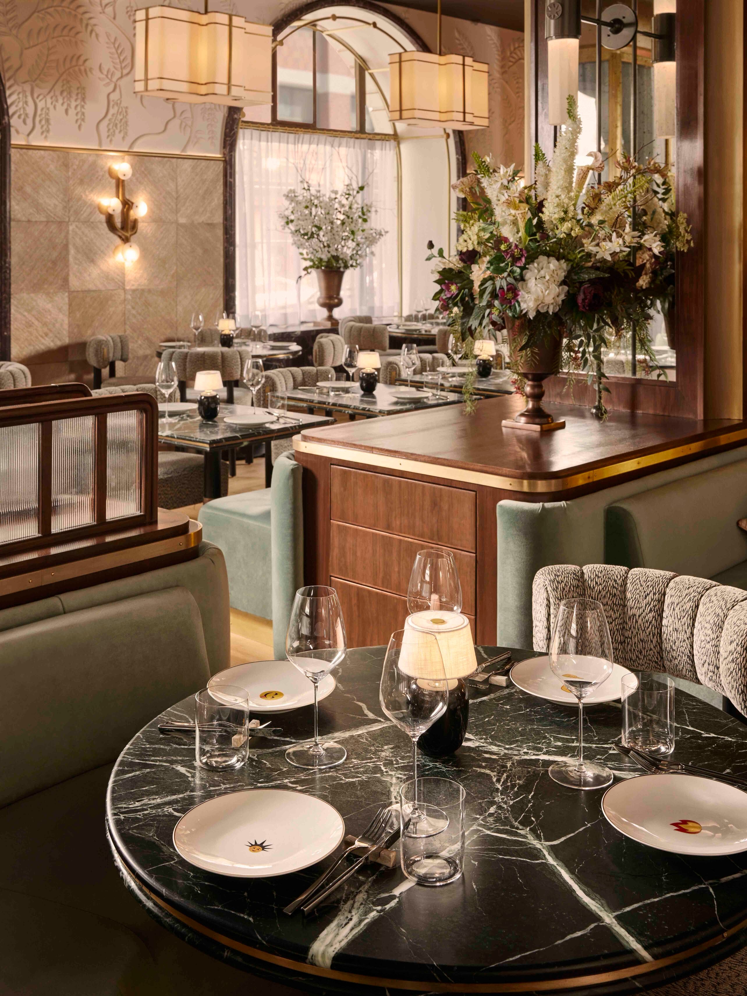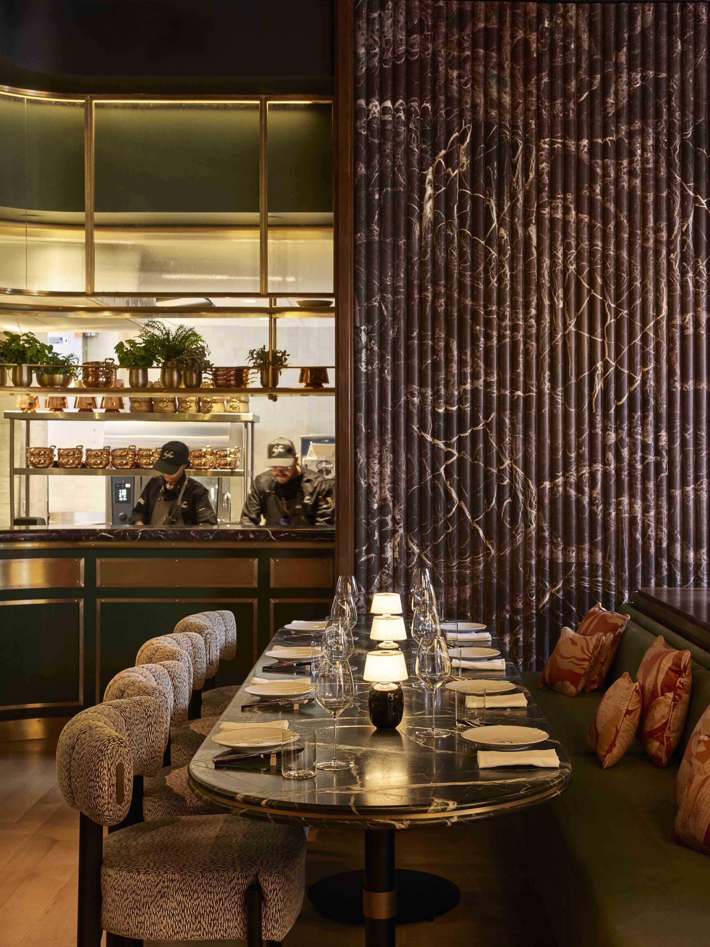 The restaurant is brought to life through Verde Alpi marble tables, plush bench seating wrapped in coordinated velvet, and dining chairs upholstered in luxurious Pierre Frey fabrics. Adding a warm glow to the ambiance are bronze and alabaster sconces. Antique mirrors reflect the cosmopolitan allure of the Café Society of the 1930s, transporting guests to a bygone era of glamour and style. Framed in striking fluted red and white marble, the open kitchen and meat display cabinet extend into the dining space, emphasizing conviviality and connection.
