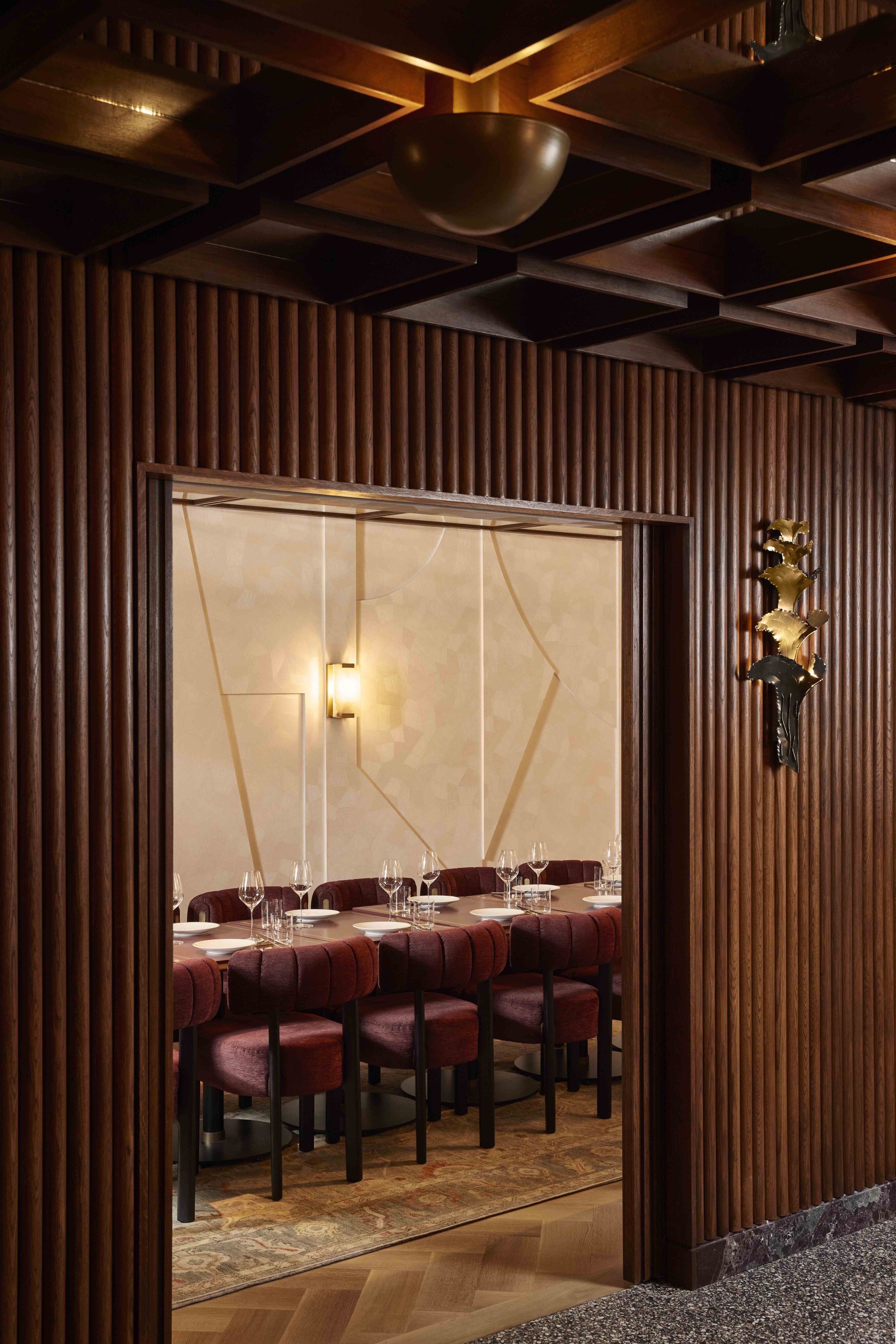 The adjoining private dining room with deliberately low ceilings creates an intimate, hushed setting. A vibrant carpet covers the floor, while colourful Murano glass sconces, sourced in Milan, cast a delicate glow over textured wallpaper. Amid the bustling energy of New York City, the room provides a suspended moment to savour the restaurant's gastronomic delights.