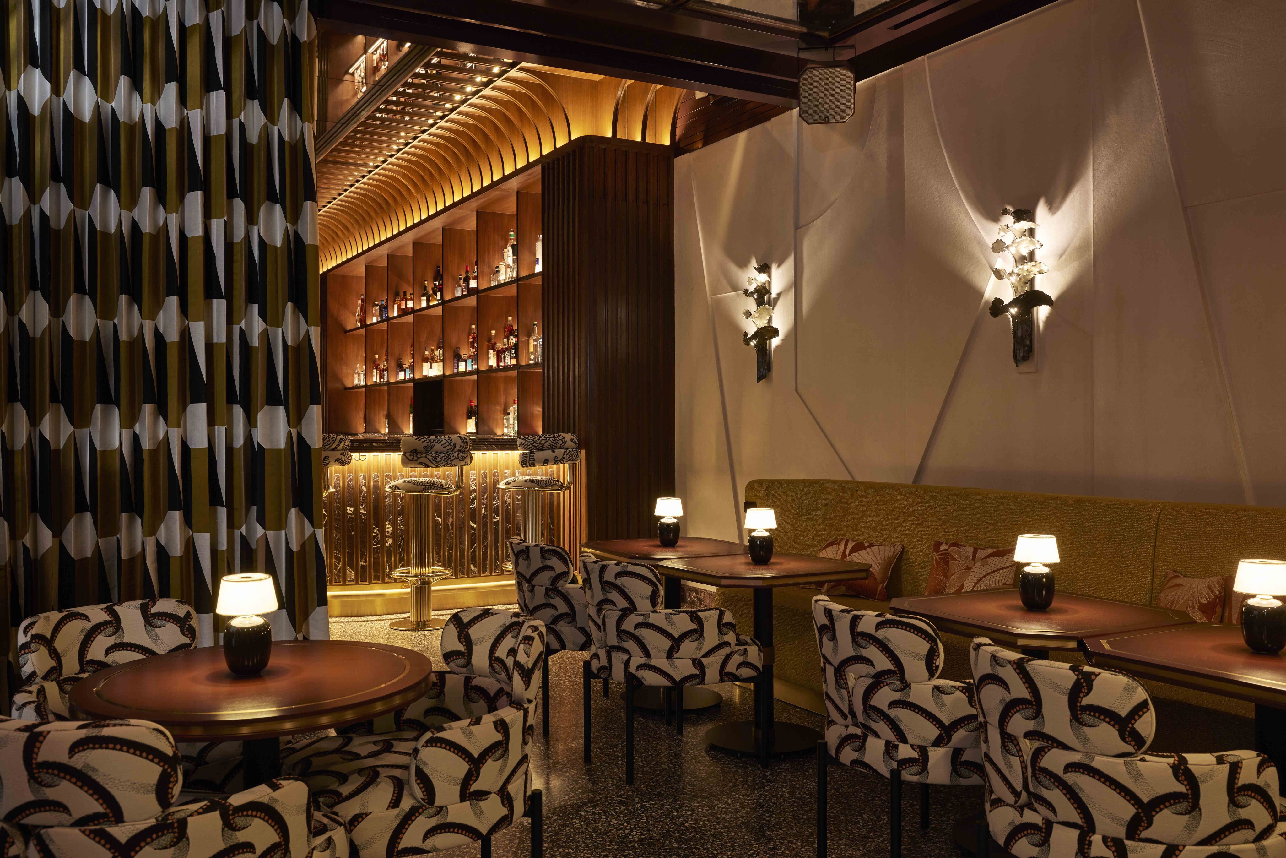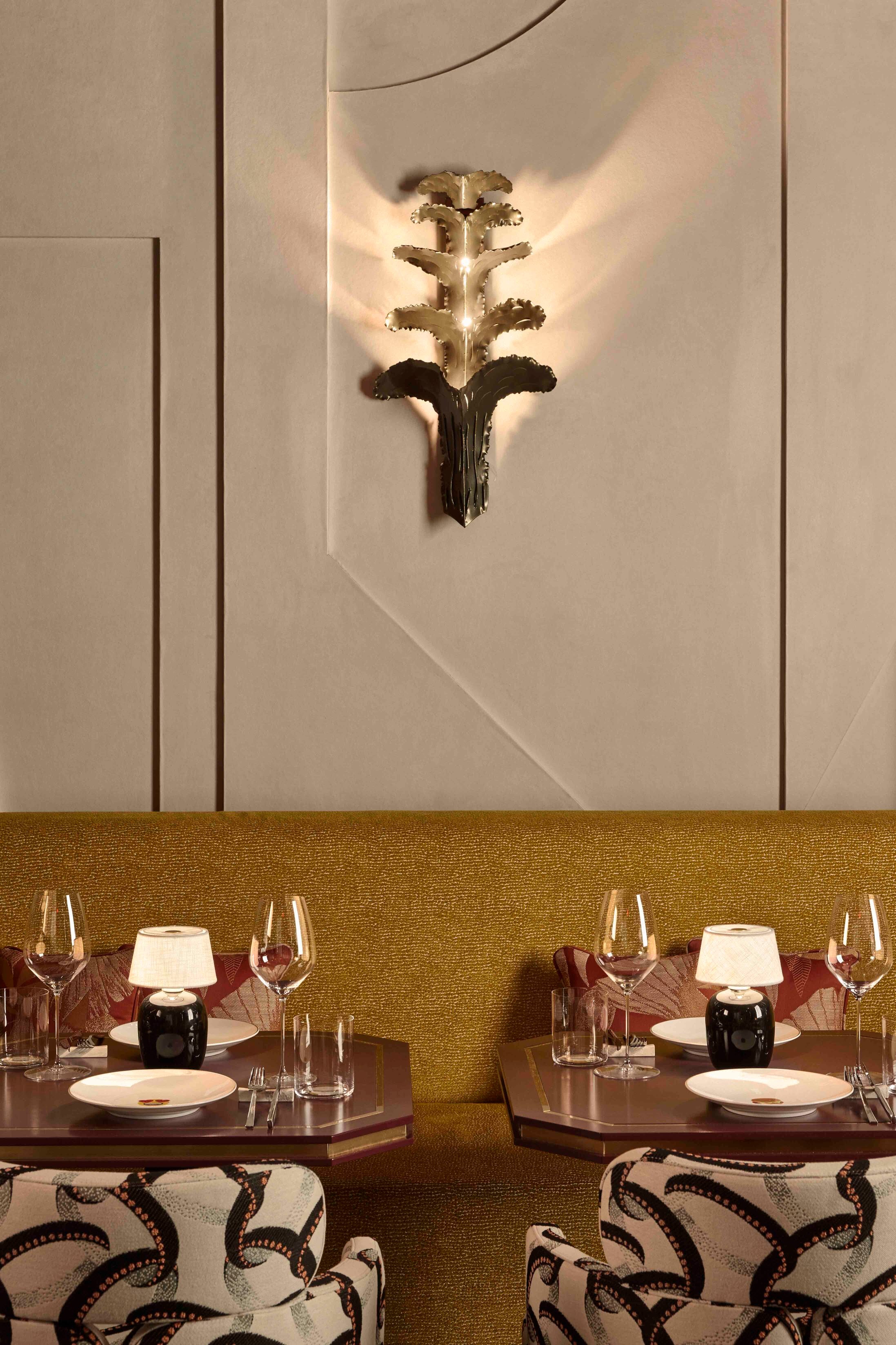 Surmounted by a canopy and reflective ceiling, the bar is equally spectacular. Its garnet marble cladding, accentuated with brass rails, creates a dynamic dialogue with the terrazzo floor below. Bathed in an amber glow, the designers envisioned a warm and seductive speakeasy atmosphere. Delicate materials enhance the mood, with leather stretched across the walls and seats upholstered in Rocher fabric from Humbert & Poyet’s Villa Riviera collection for Nobilis. With its long counter and high stools, the bar offers an inviting space for an unforgettable lunch or dinner experience.