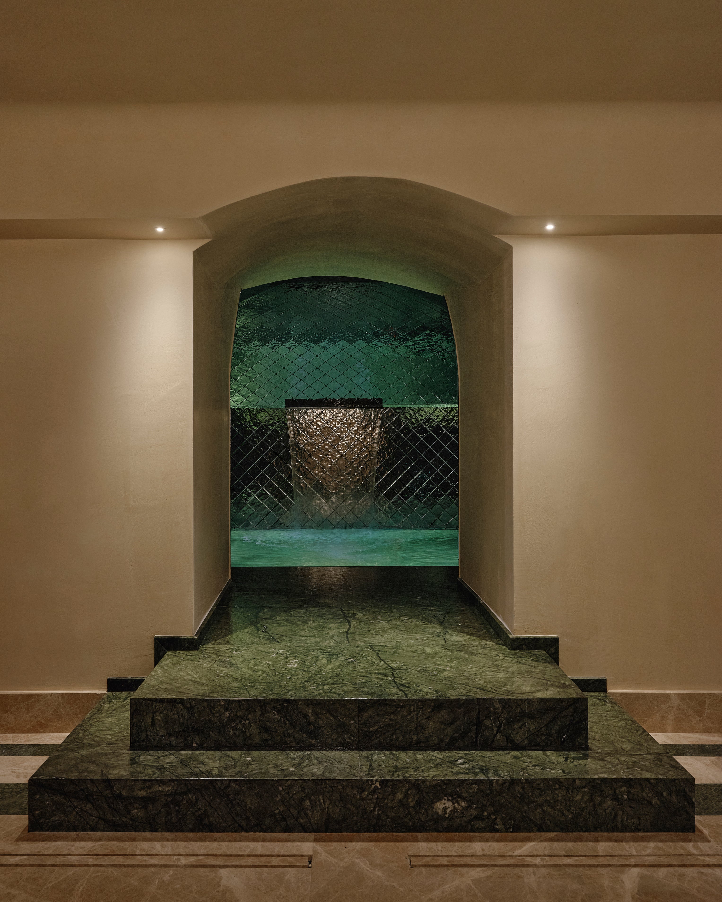 Rooted in ancient tradition yet reimagined for the modern traveller, the Wellness Area is a sanctuary inspired by Roman bathhouses. Here, marbled surfaces contrast with green majolica tiles sourced from Spanish artisans, creating an atmosphere both luxurious and grounding. The circular dome overhead completes the space, enhancing the room's acoustics and evoking a sense of grandeur.
