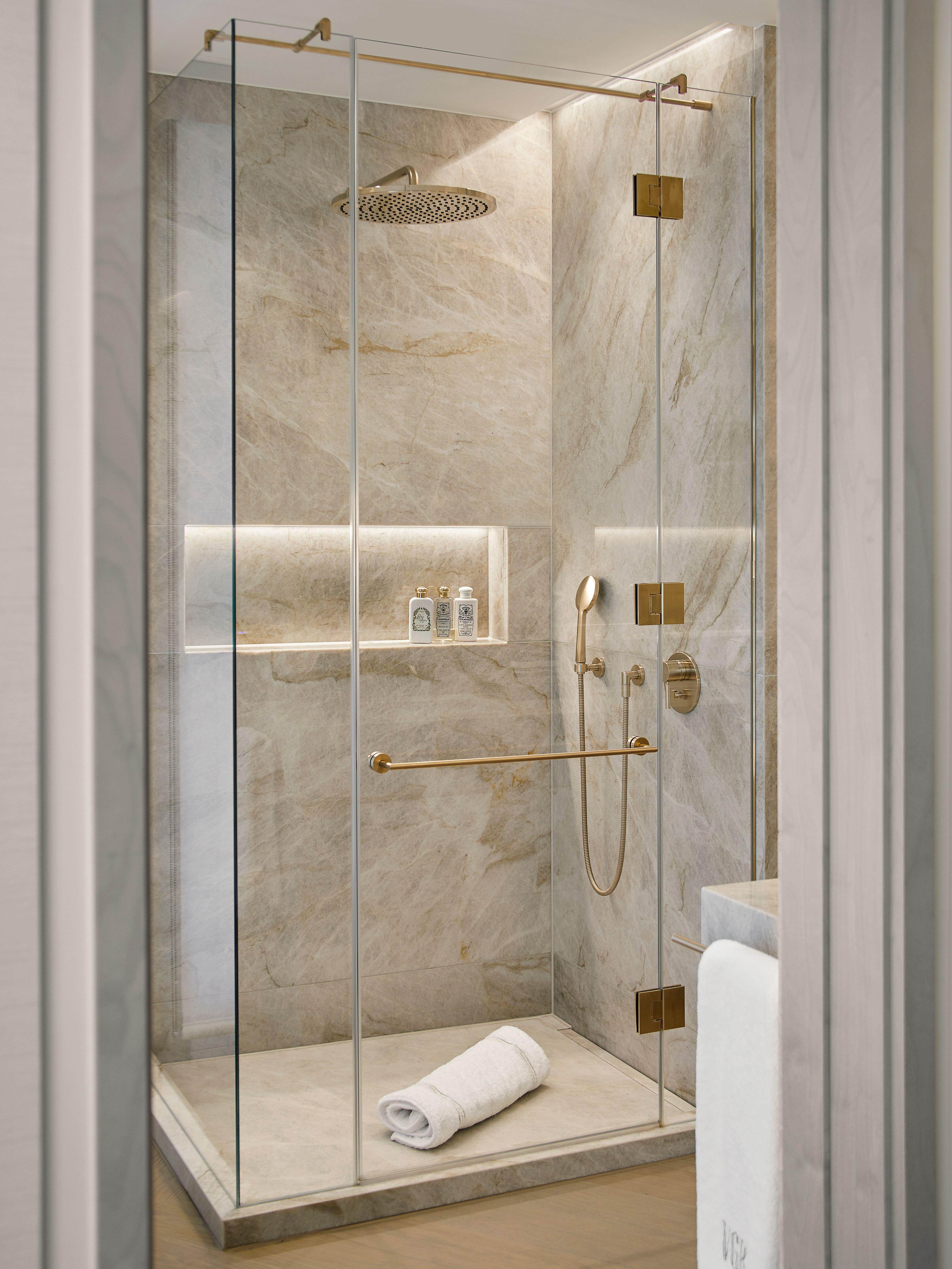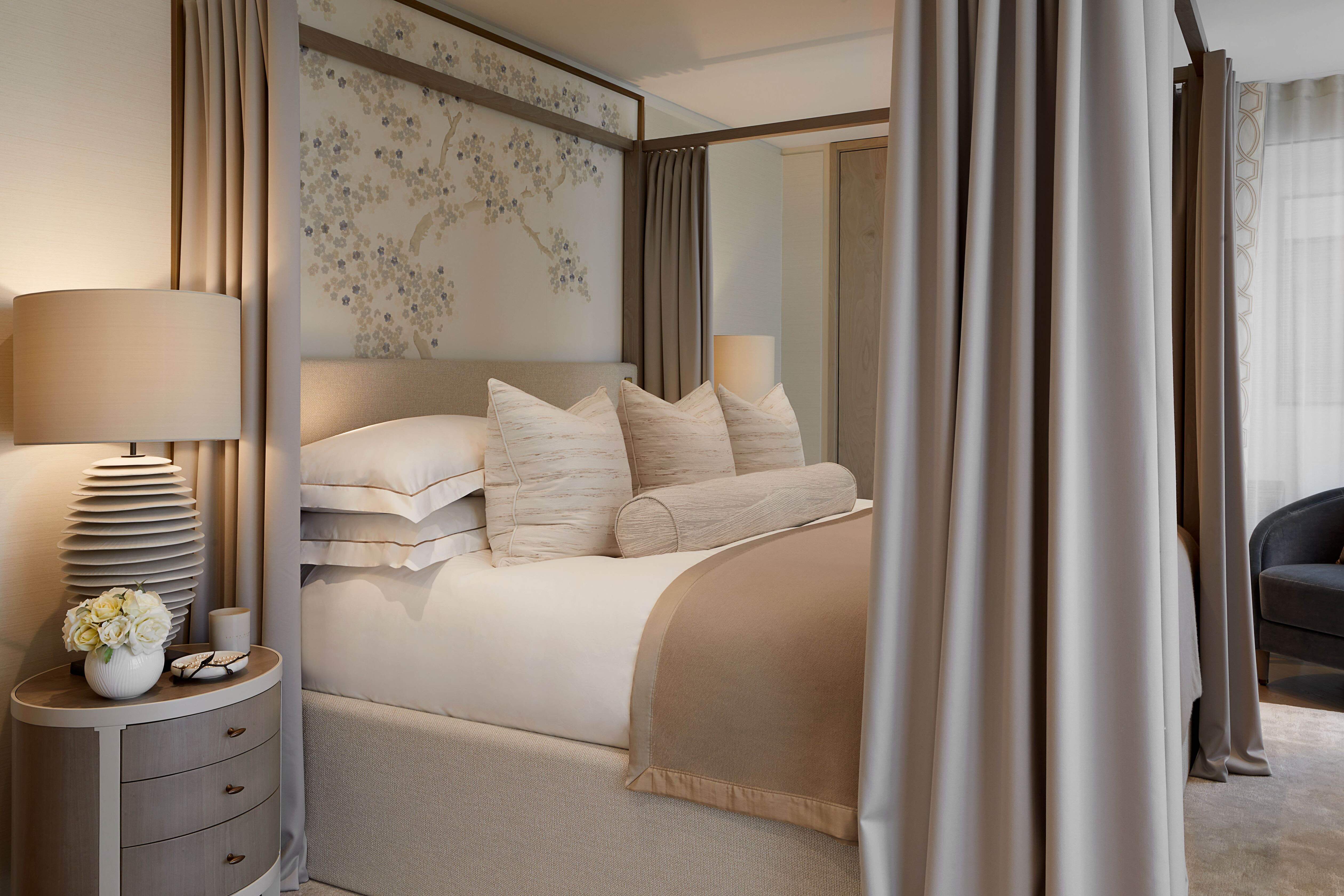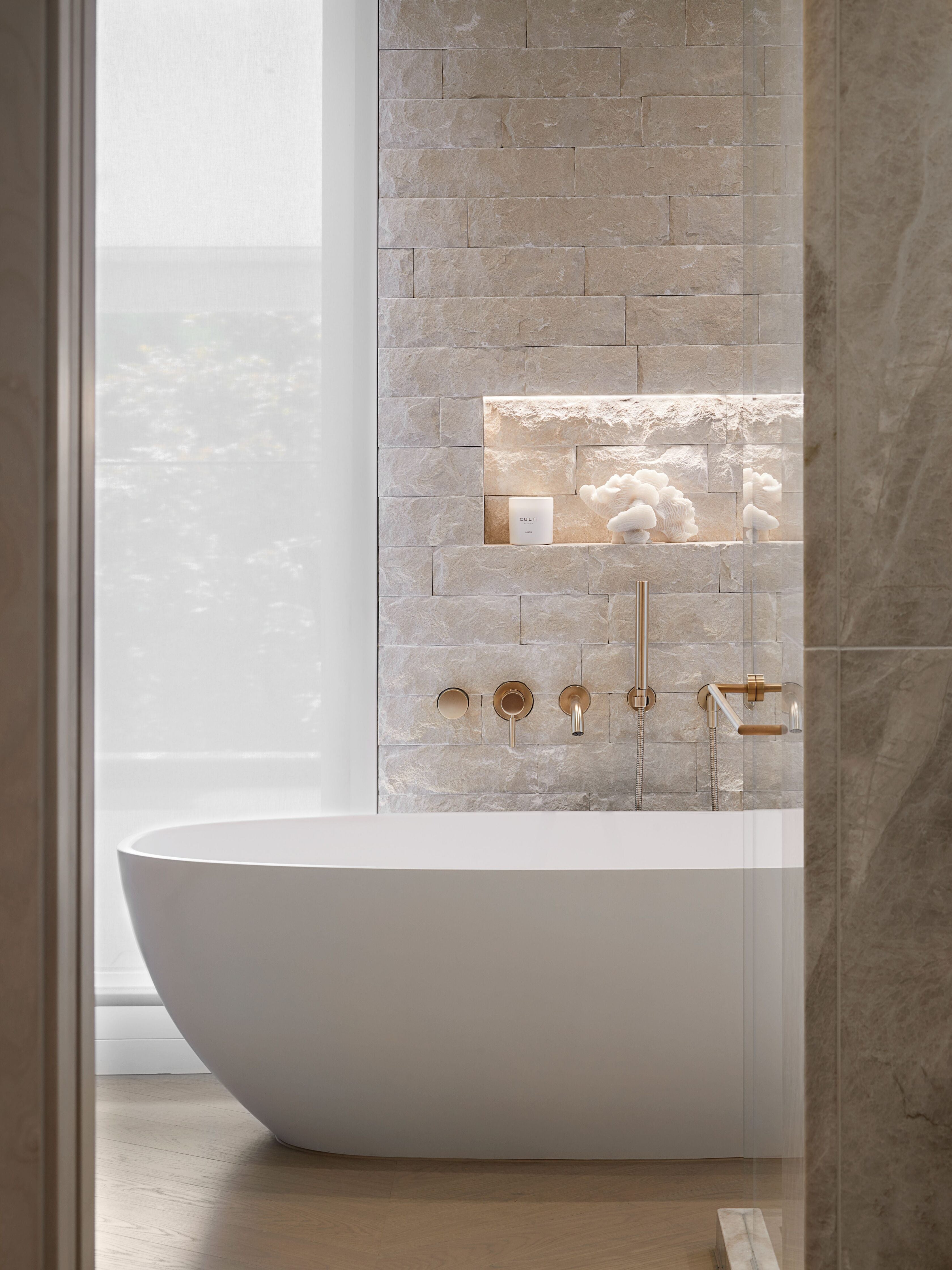 The bedroom exudes comfort with a soft, neutral palette, while the bathroom provides a spa-like experience with a free-standing bathtub and marble walk-in shower, blending sophistication with functionality.