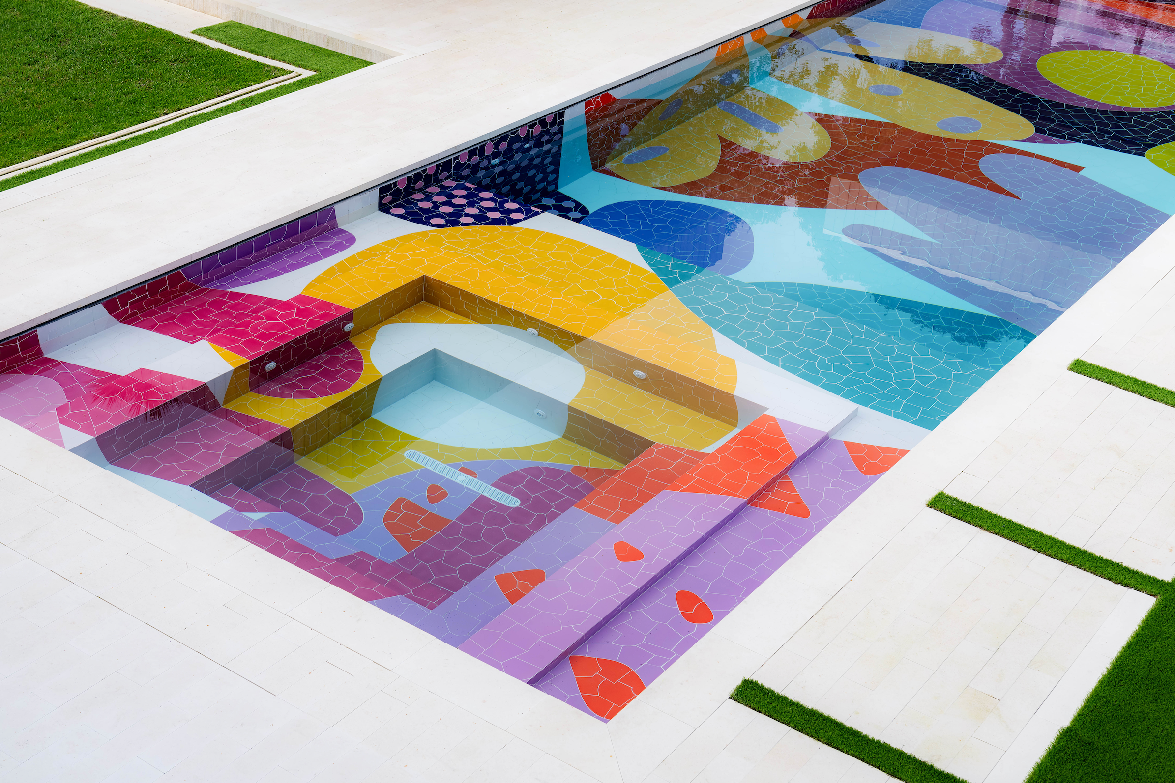 In Miami, Alex Proba redefines pool art with her kaleidoscopic creation. Here, the pool floor itself becomes a canvas, adorned with a vibrant, abstract mural of organic shapes and saturated hues. Proba’s artistry transforms swimming into an interaction with colour and form, where swimmers glide over a living painting that changes with every ripple.
