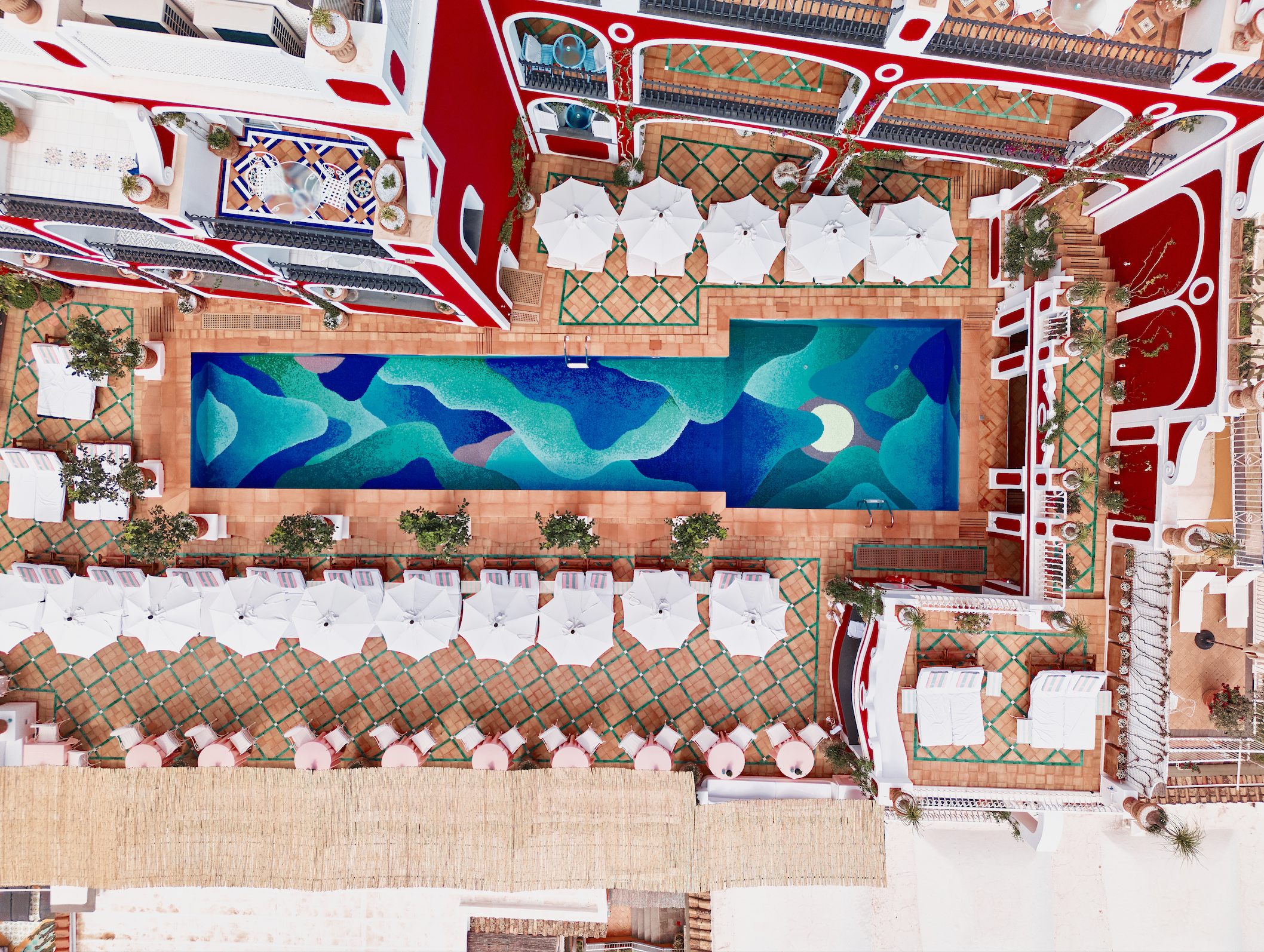 Take, for instance, the lush, courtyard pool at Manon Les Suites in Copenhagen. Enclosed within a vertical garden of trailing greenery and lanterns, this pool is more than an aquatic retreat, it’s an urban oasis where design and nature meet. The glimmering tiles, arranged in a subtle, shifting mosaic, play with light and shadow as sunlight filters through the canopy above, creating a dynamic spectacle of movement and reflection. Guests can experience it firsthand by booking directly at guldsmedenhotels.com.