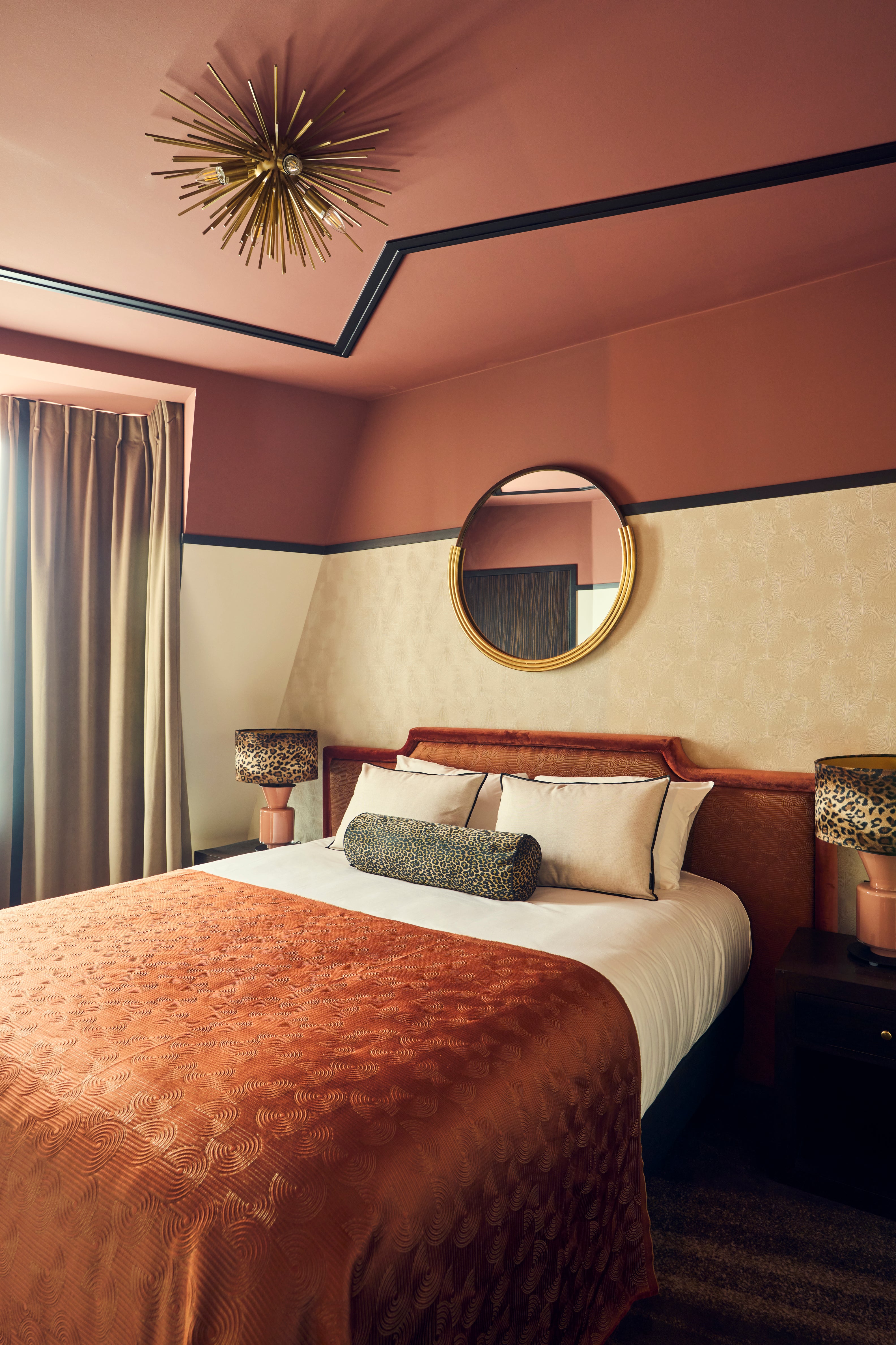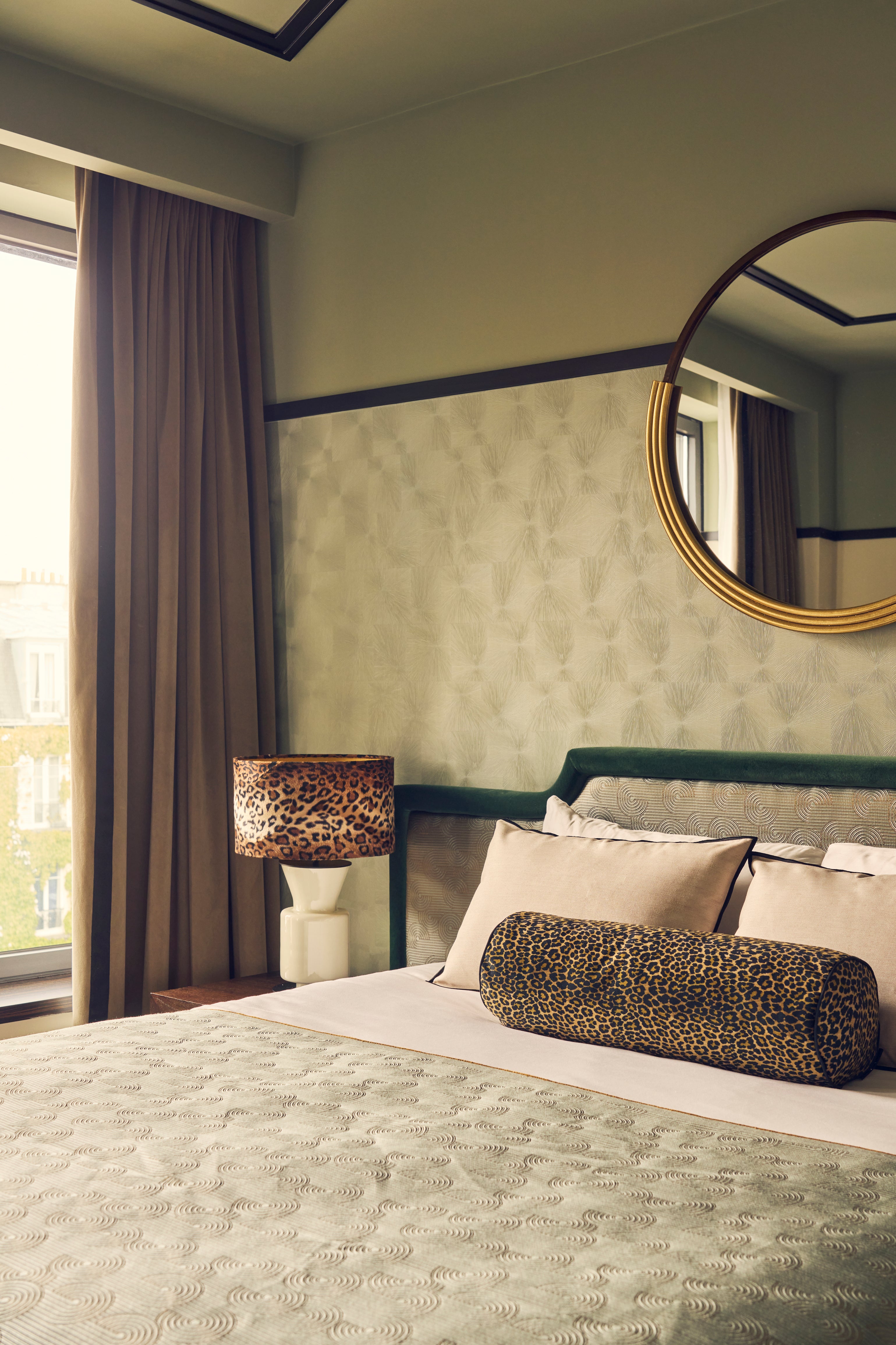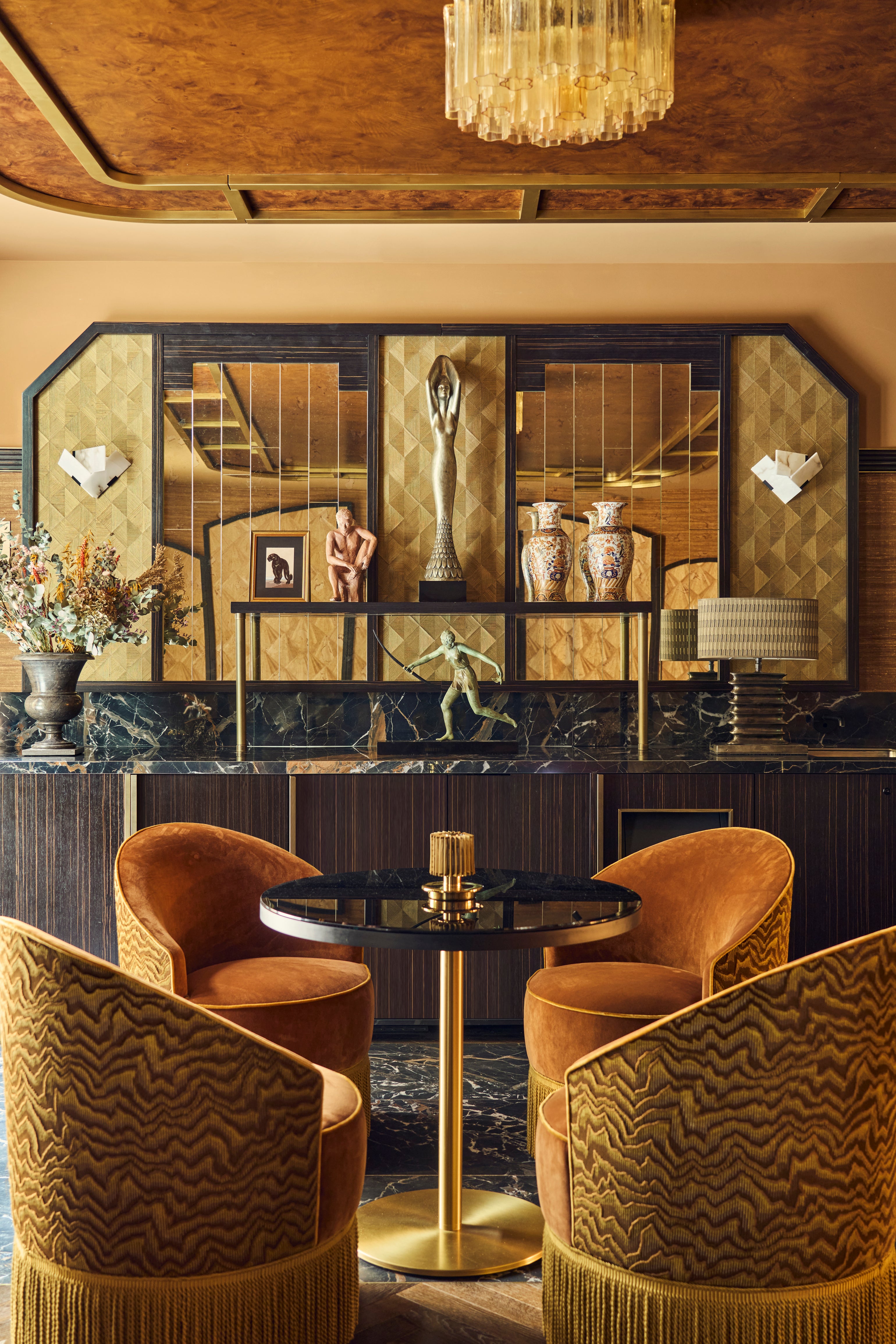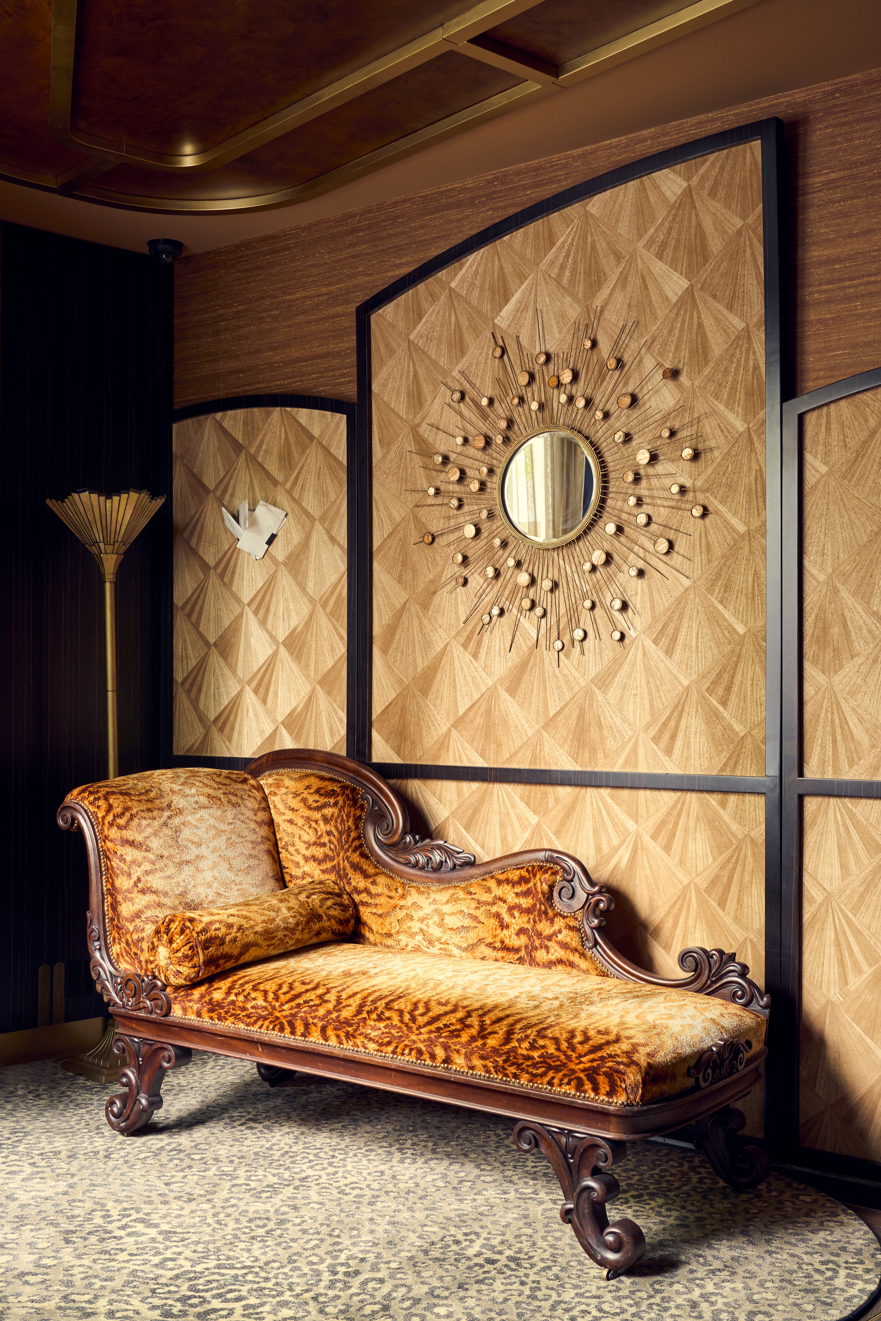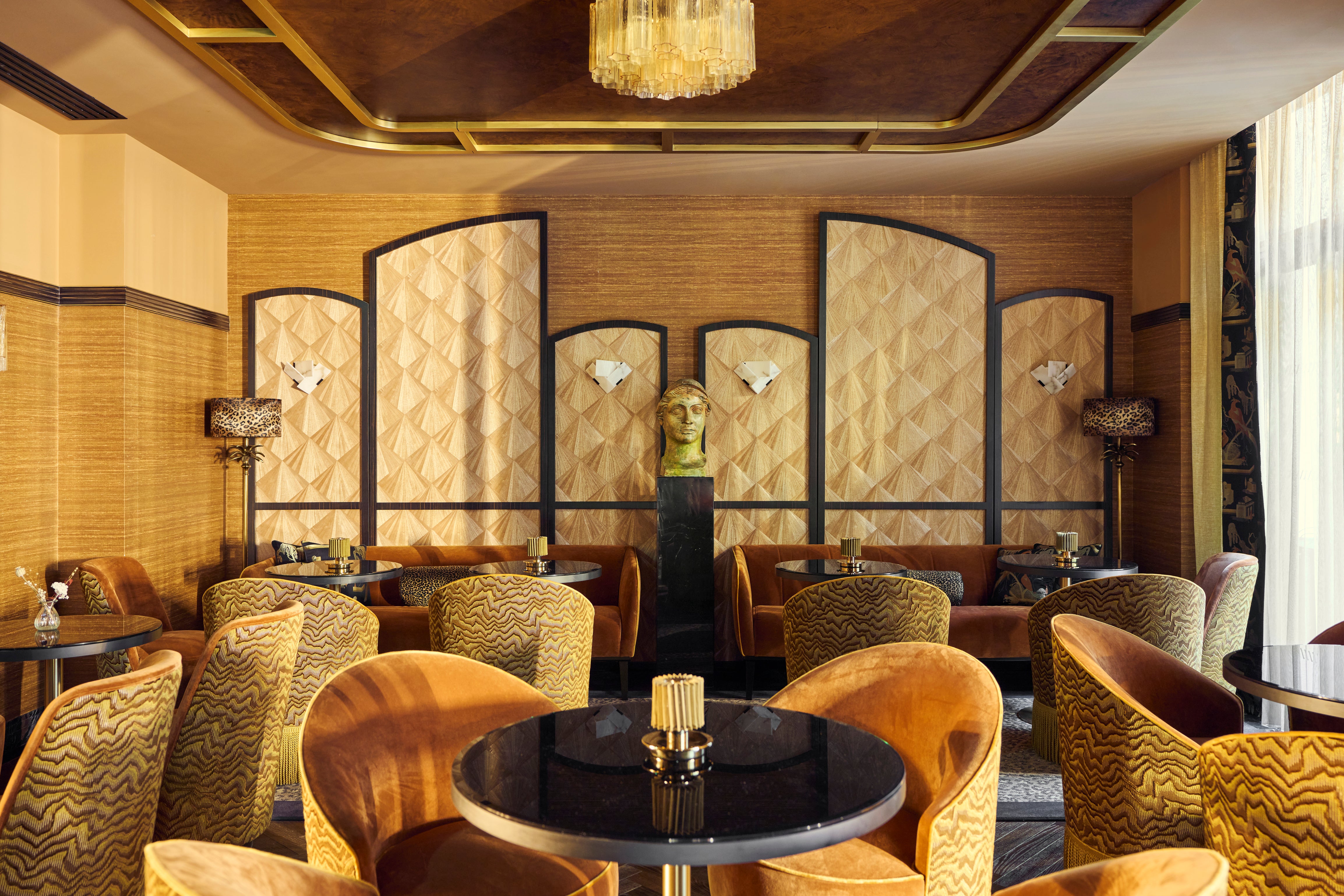 The hotel’s interiors draw from the bold glamour of the 1920s and 1930s, featuring vintage furnishings like a feline-inspired chaise longue in the entrance lounge. Exotic motifs of tigers, leopards, and birds appear across chair backs, carpets, and curtains, adding a sense of adventure. These striking details contrast with neoclassical busts and statues, creating a ‘cabinet of curiosities’ feel that celebrates timeless opulence and eclectic charm.