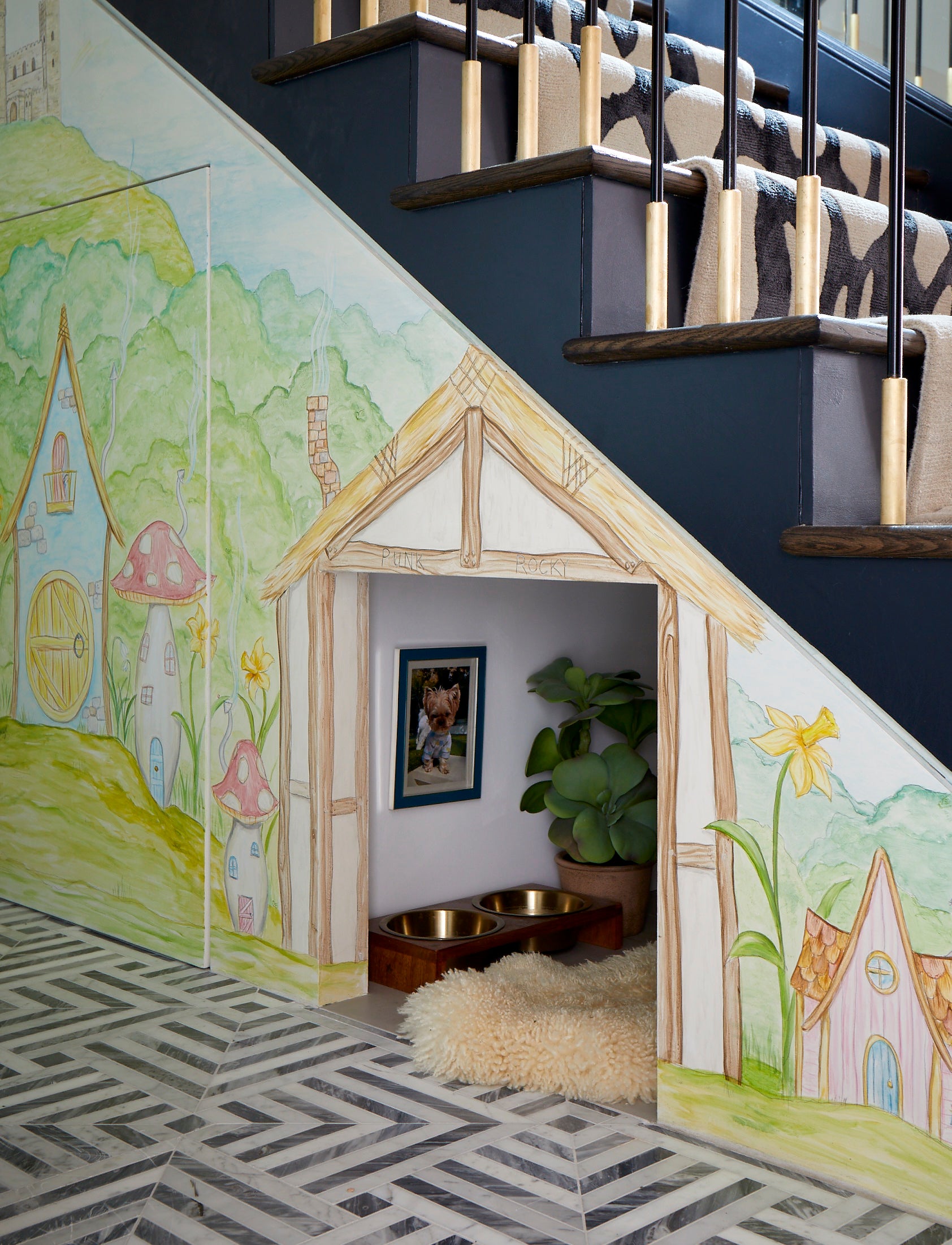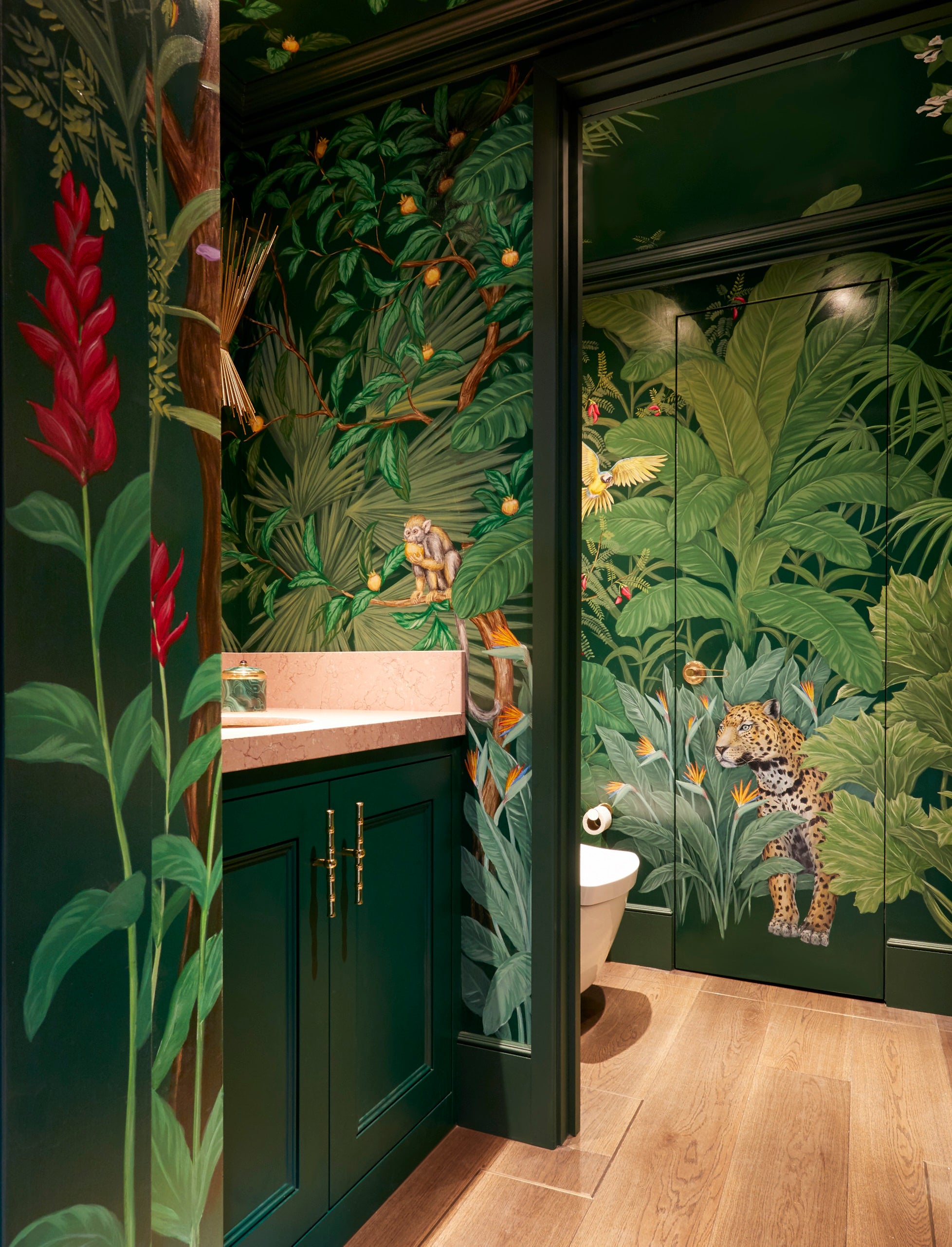 Throughout the Penthouse, stunning wall coverings are created to reflect the family's unique style and spirit. In a vibrant powder room, a bold, large-scale jungle mural sets a lively, artistic tone, whilst the children's bathroom features whimsical, hand-painted designs that evoke a sense of adventure and storytelling. We love the attention given to the family dog, not only does it have its own mural but its own little den too!