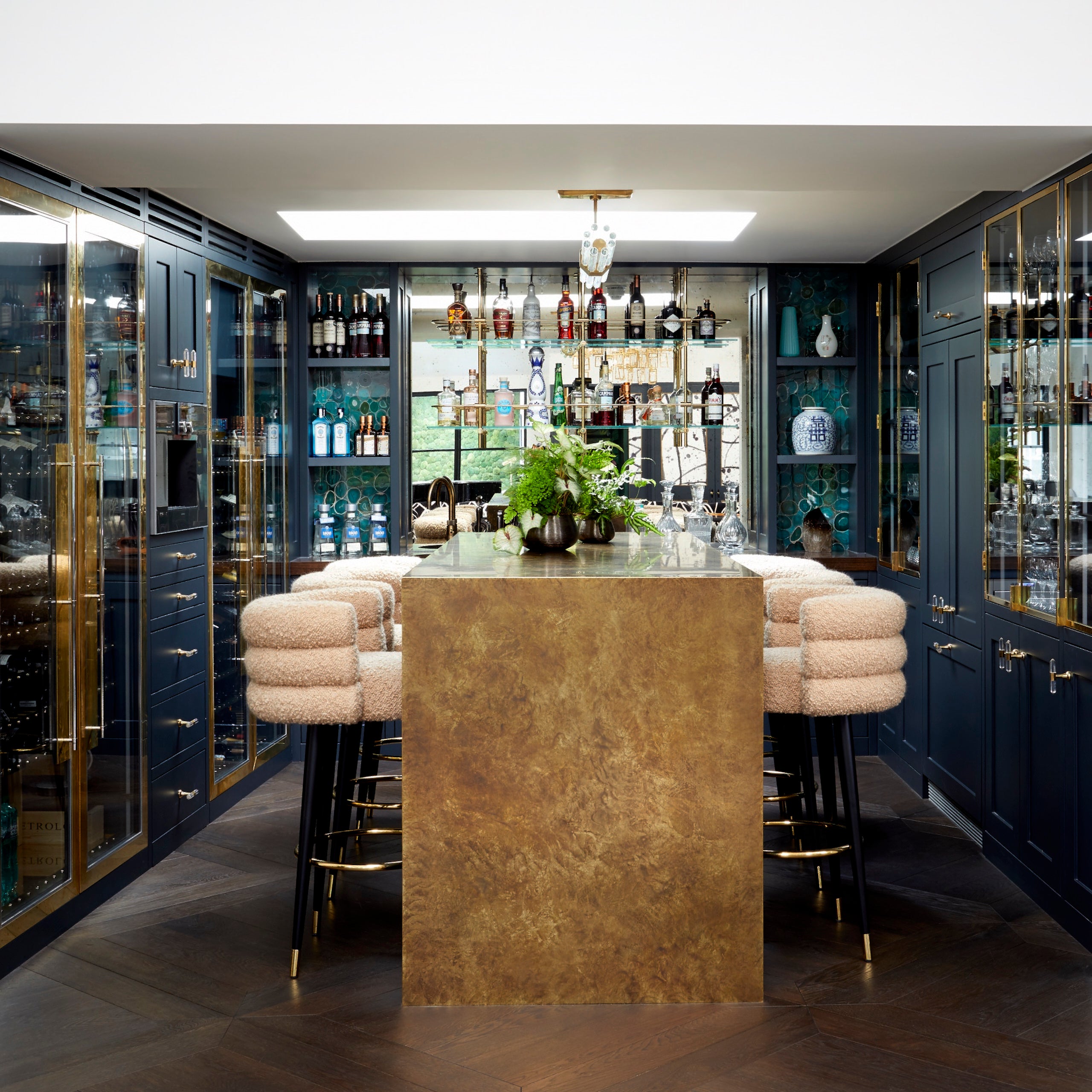The hidden bar, surrounded by floor-to-ceiling glass wine cabinets, each showcasing an impressive collection of bottles. The bar table, finished in a luxurious gold tone, rich blue tones define the cabinetry and shelving, adding depth and contrast to the luminous gold elements.