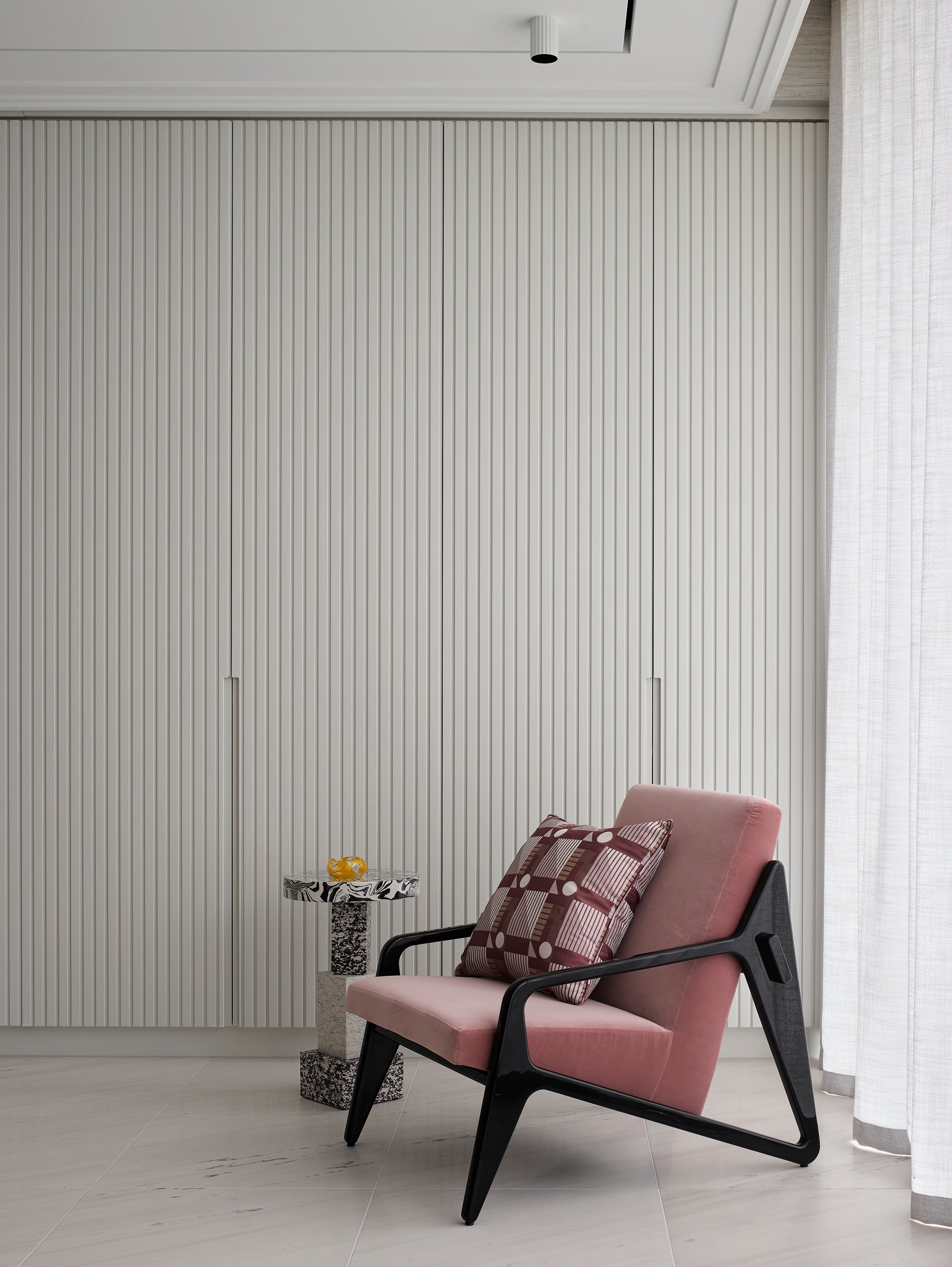 Beginning with a striking black-and-grey foundation of clean architectural lines, pops of colour bring personality to various rooms, starting almost immediately in the entrance foyer.