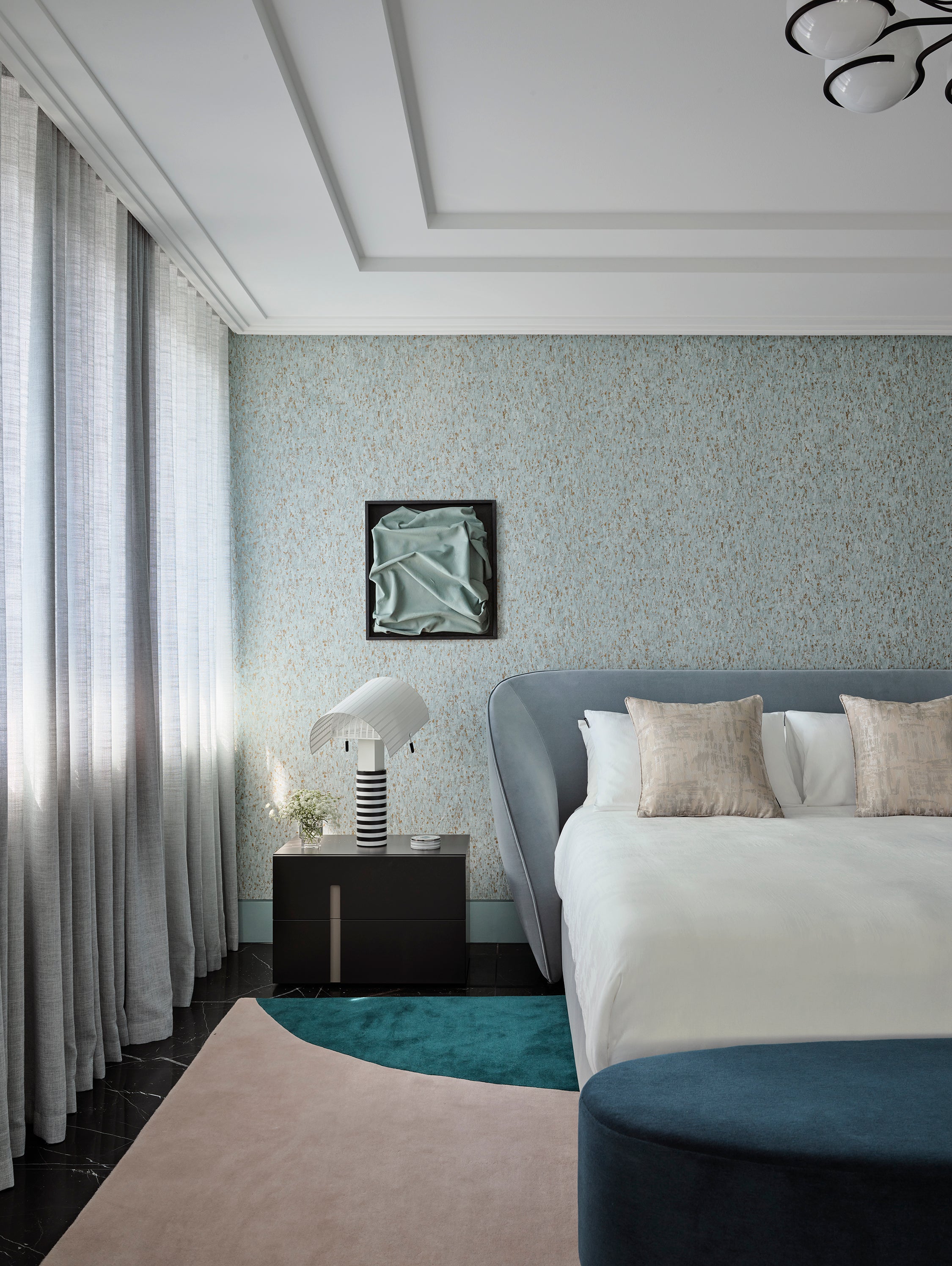 In homage to the coastal location, a palette of sky blues and forest green colour various rooms to soften all the concrete, with hints of pink and purple for a final feminine touch.