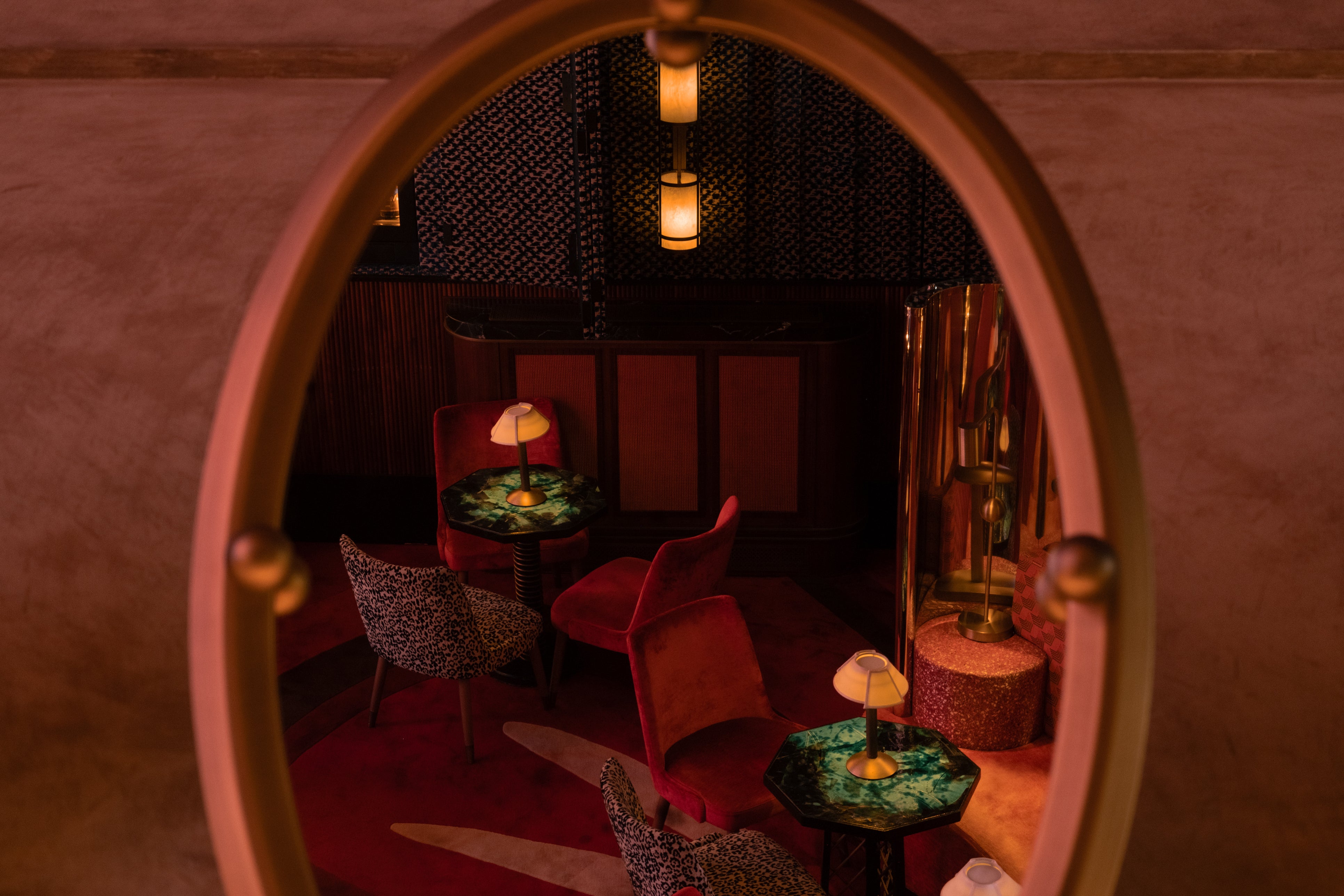 The ambiance is an inviting mix of warmth and intrigue, anchored by a bold red carpet featuring psychedelic patterns crafted by renowned fashion designer Sara Battaglia. Adding to the allure, mid-century-inspired red velvet chairs create a striking contrast with stylised leopard print accents and green ceramic tables with unique octagonal tops. Discreet alabaster lamps, designed by Humbert & Poyet, lend a soft glow, enhancing the eclectic charm of the space.