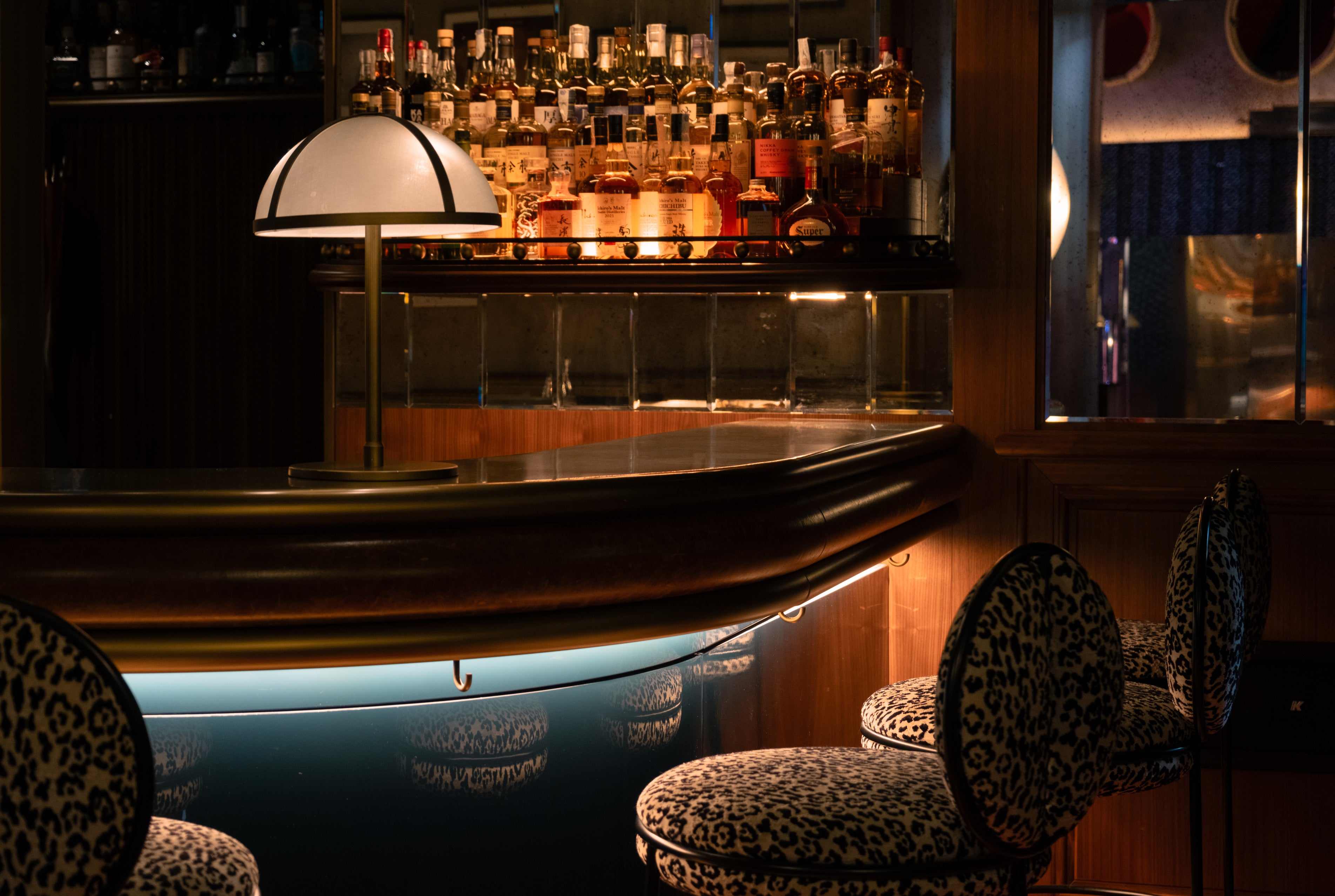More intimate than the main area, the bar counter provides seating for around twenty guests on high leopard-upholstered stools. From this vantage point, patrons can admire a meticulously curated display of liquors, evoking the charm of a speakeasy. The venue features a preserved antique fireplace, its interior mirrors creating a striking visual effect. The space is further enriched with fluted wood panelling up to mid-height, topped by graphic wall coverings inspired by the bold aesthetics of the 1980s.