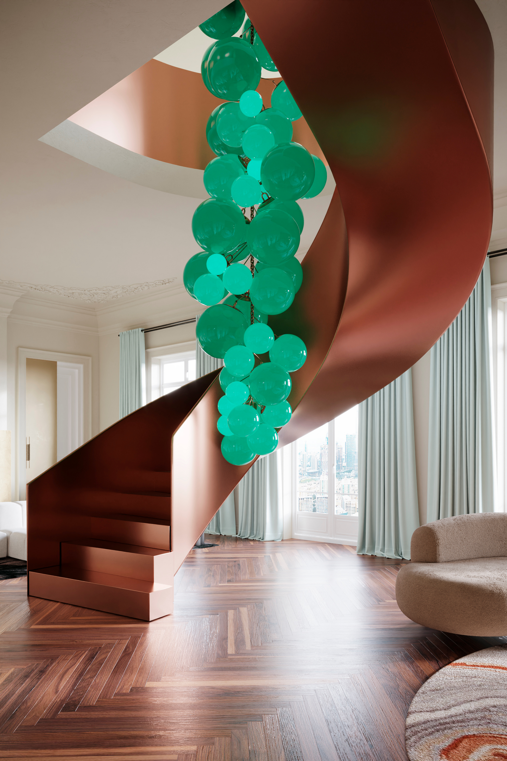 Moving into the realm of contemporary luxury, the staircase, complemented by the Kuulas chandelier by Cameron Design House and designed by Isabel Gomez Studio, captures attention with its copper-like metallic sheen. This sinuous, wrap-around form is paired with a cascade of green orbs—an unexpected chandelier that plays with scale and reflection. The verdant tones contrast against the warmth of the staircase, adding a theatrical flourish that brings the design to life.