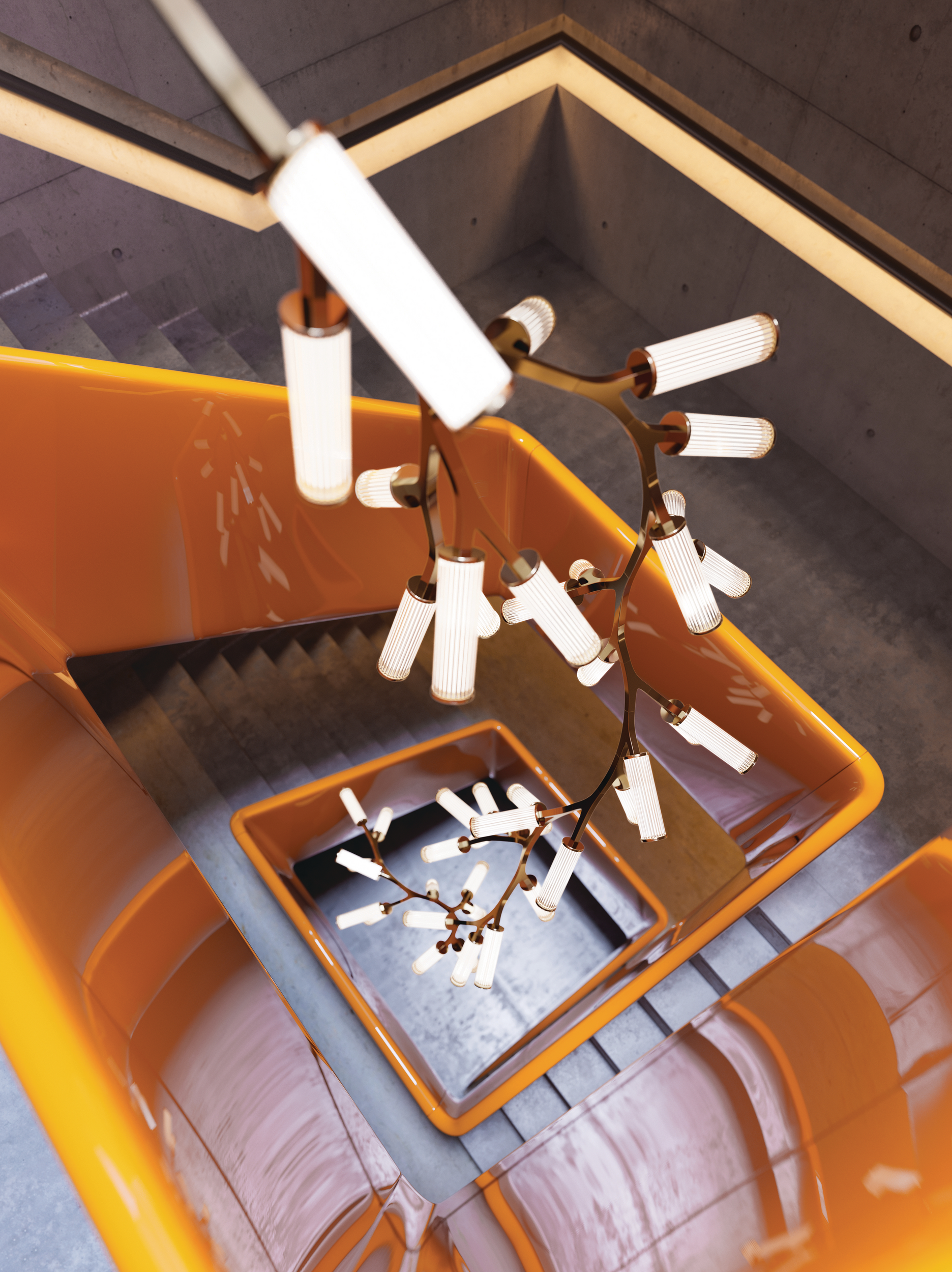A bold statement unfolds in a space adorned with a lacquered orange staircase. High-gloss surfaces catch light at every turn, while Haara Metsa, a custom, branch-like chandelier by Cameron Design House dances overhead. The combination creates a dynamic visual interplay, where light fixtures mirror the sinuous lines of the stairwell, emphasising its drama.